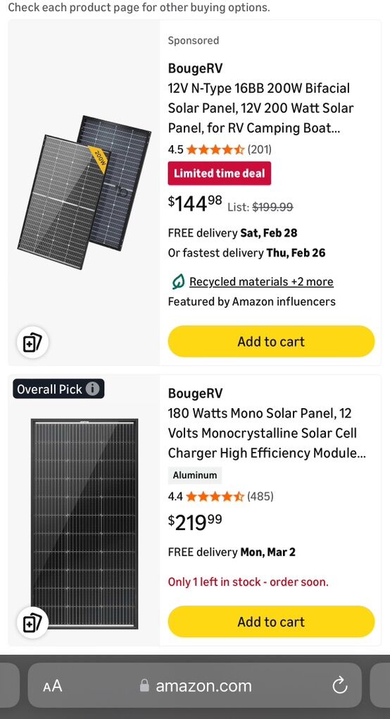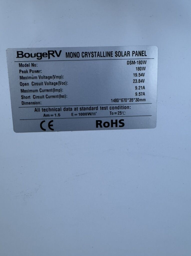 New BougeRV 180W Mono Crystalline Solar Panel. Model DSM-180W. Still in packaging Dimensions are approx 26 x 59. Great for off-grid setup or RV