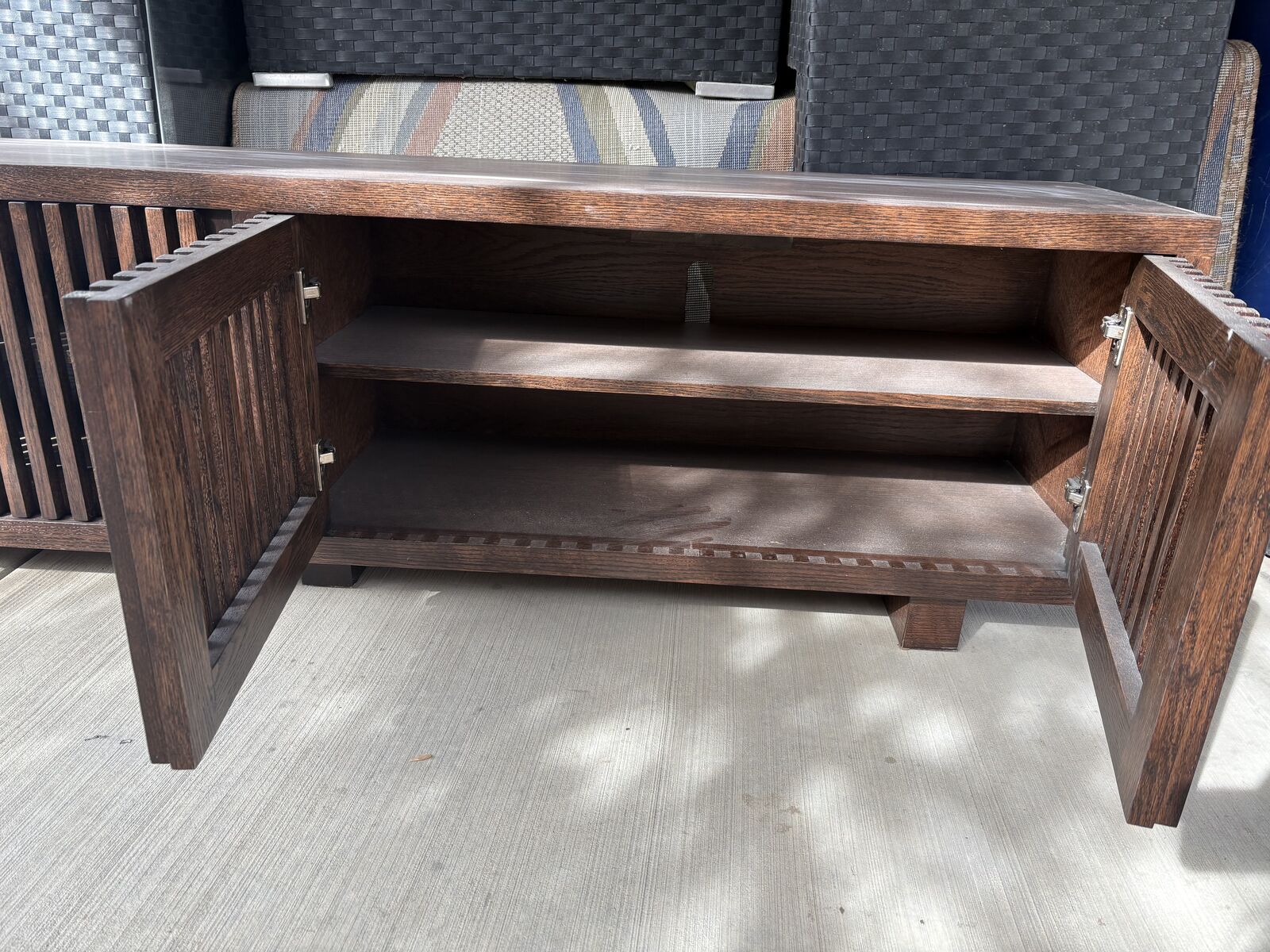Venmo80" long and 22 tall. Slat fronts with shelf on each side.