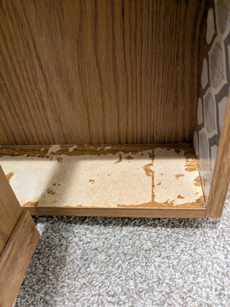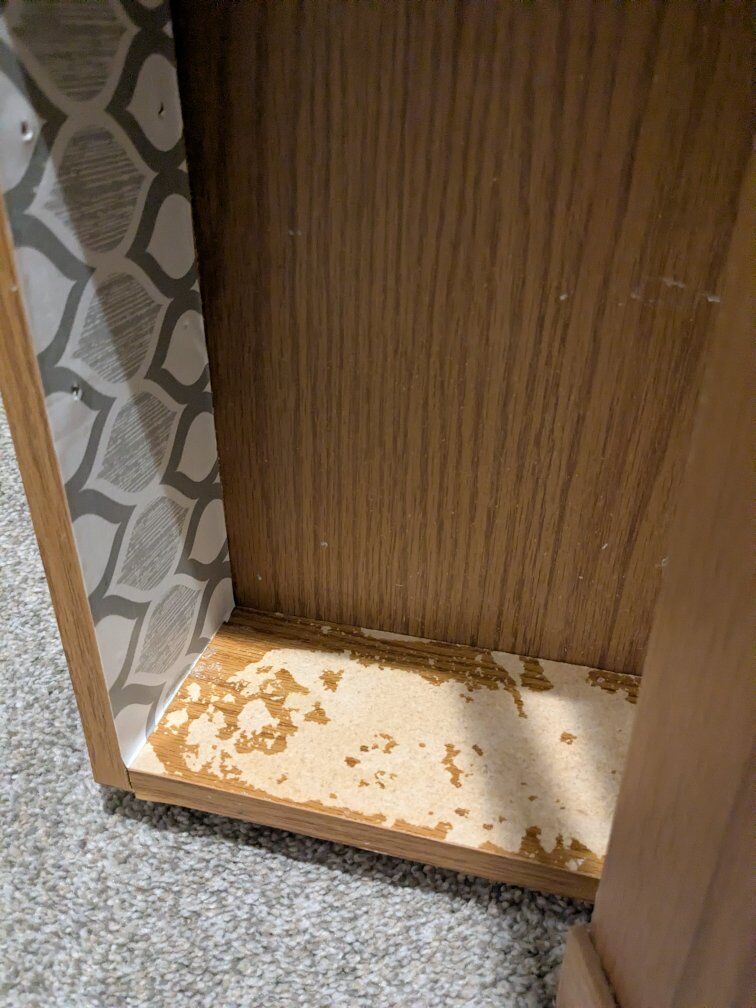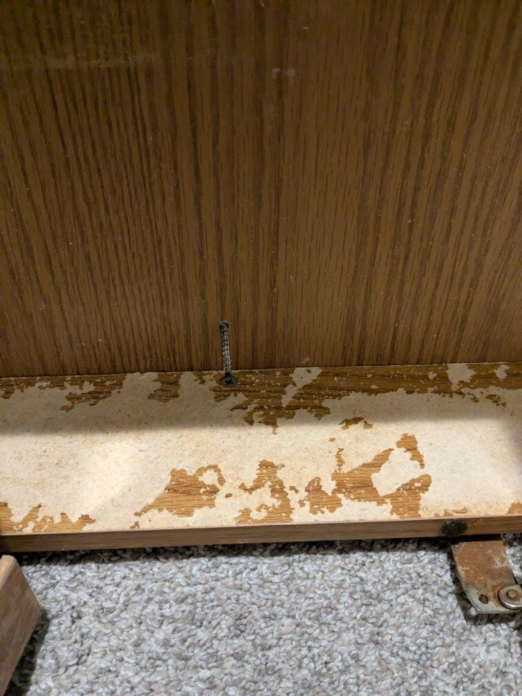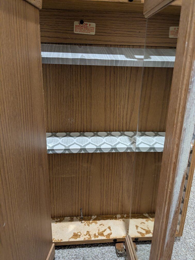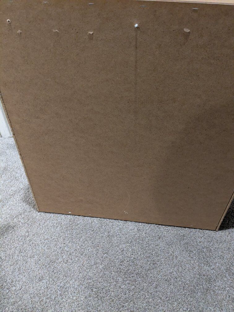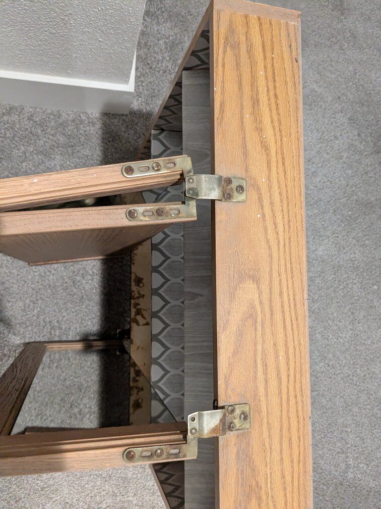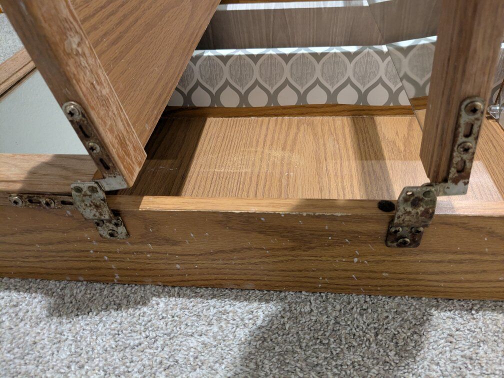 Brown wood bathroom vanity/cabinet mirror. 24" wide by 24" tall. Tri-fold mirror doors. Taken out during remodel. It has water damage and rust on the hinges but no broken edges or shelves. Great to sand down and paint. Comes with 2 shelves. Please no spam codes. Cash or venmo.