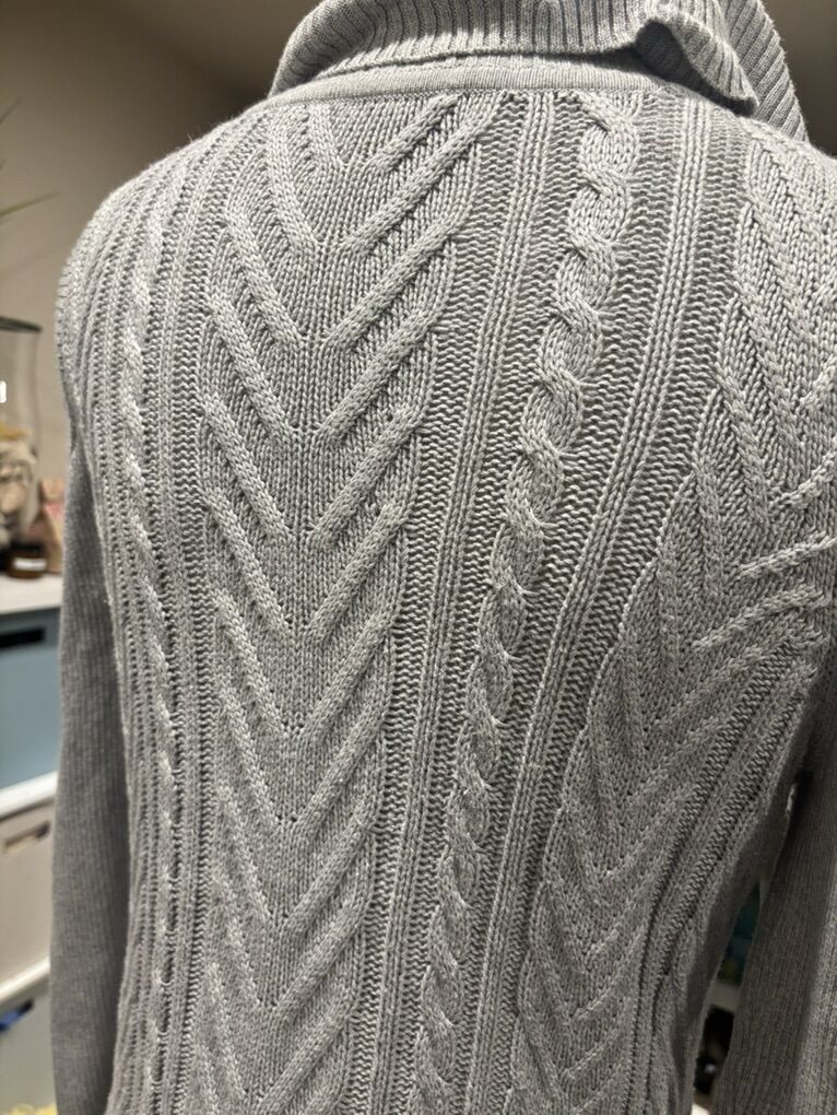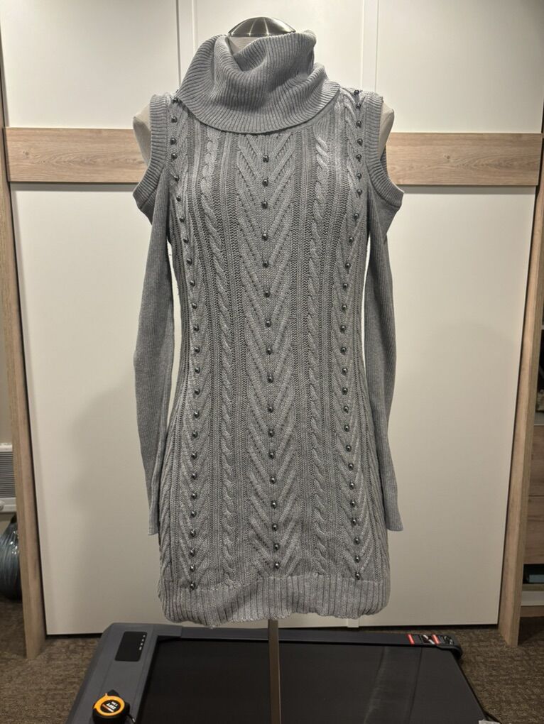 VenmoGray Belldini sweater with dark silver pearls. Mannequin doesn’t display the sleeves well, so I included an online image of a similar dress to show how they look on a figure with arms lol. Size L. Goes down to cover 1/3 of the thigh. Soft material.