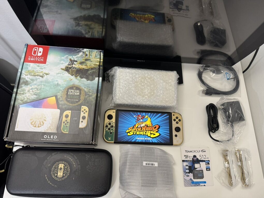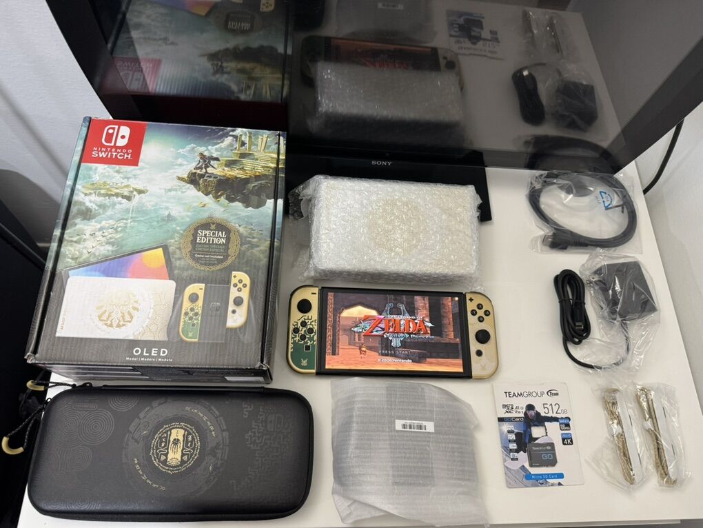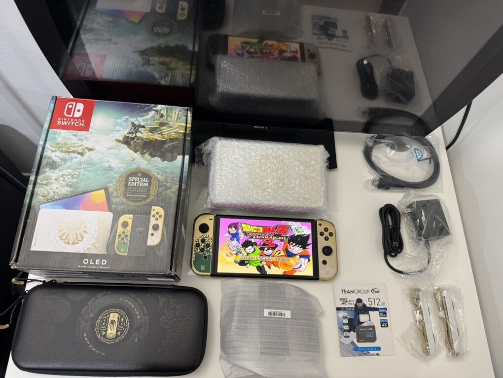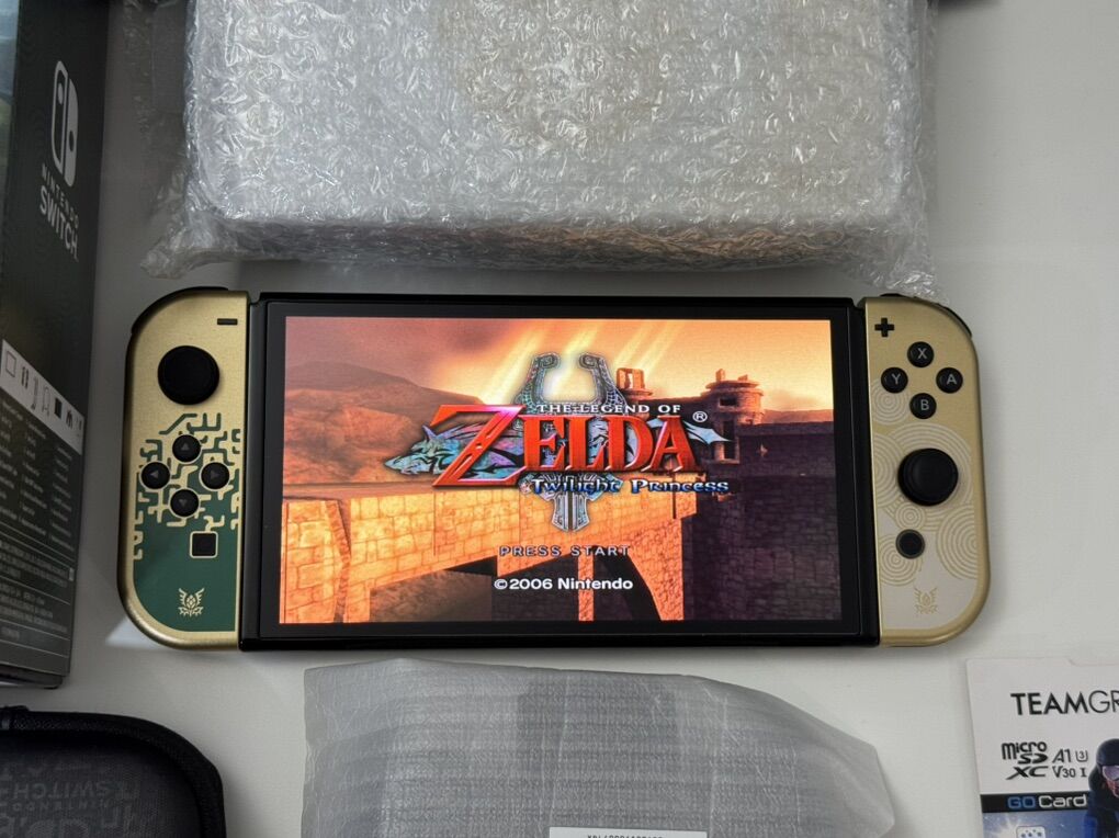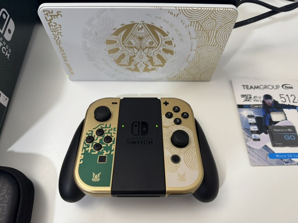 Zelle1 Nintendo Switch Oled Zelda Edition Mod HwFly Chip (Kamikaze Method) 1 Micro Sd TeamGroup 512gb Loaded 1 Dock 1 Joy-Cons 1 Grip 1 Charger 1 Hdmi Cable 1 Box