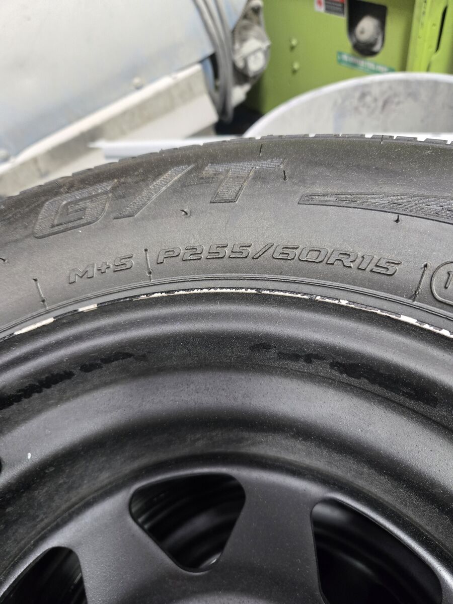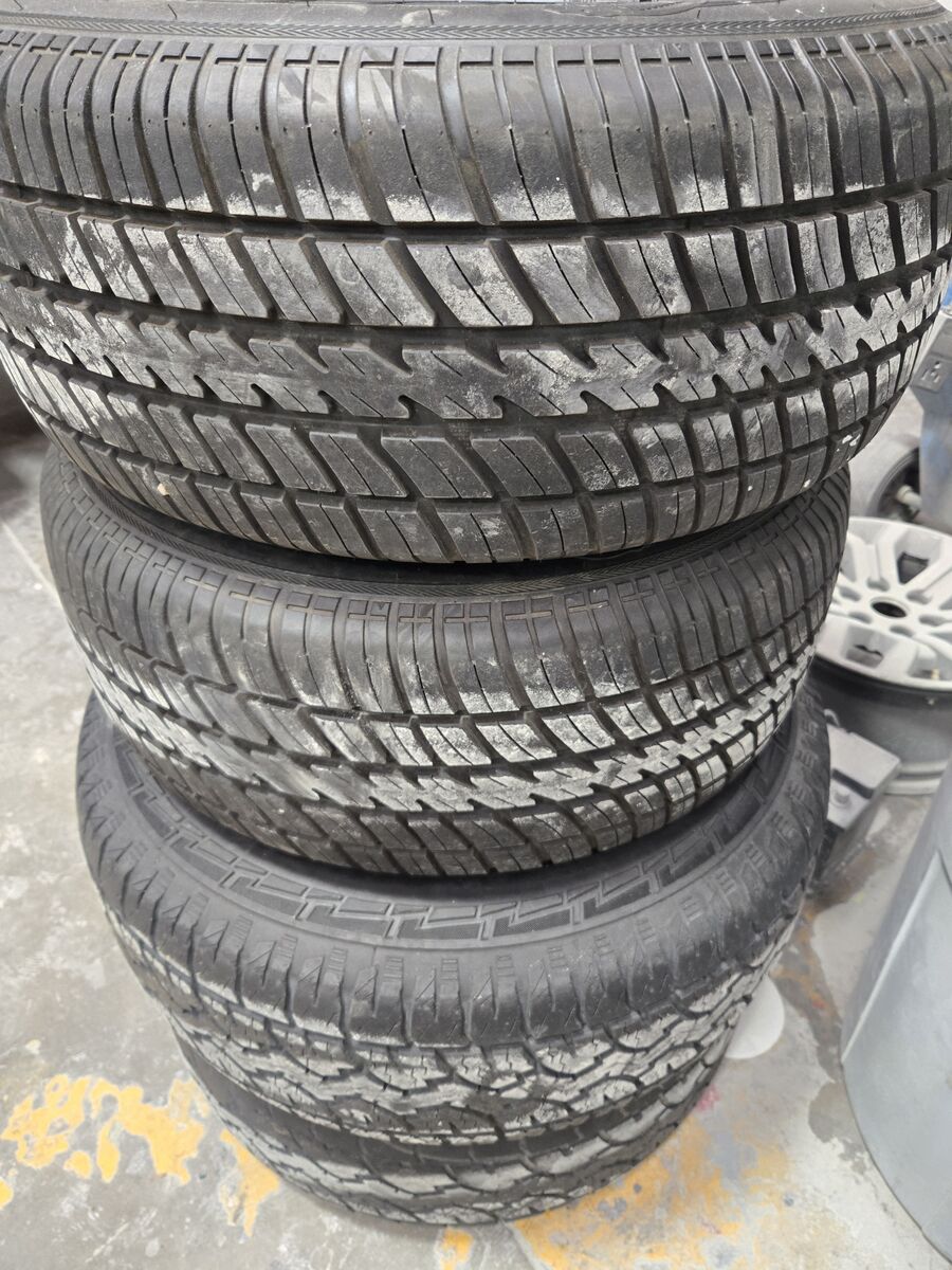 Four rims 15" x 6" 5 x 4.5 lug wheels with two cooper cobra tires.