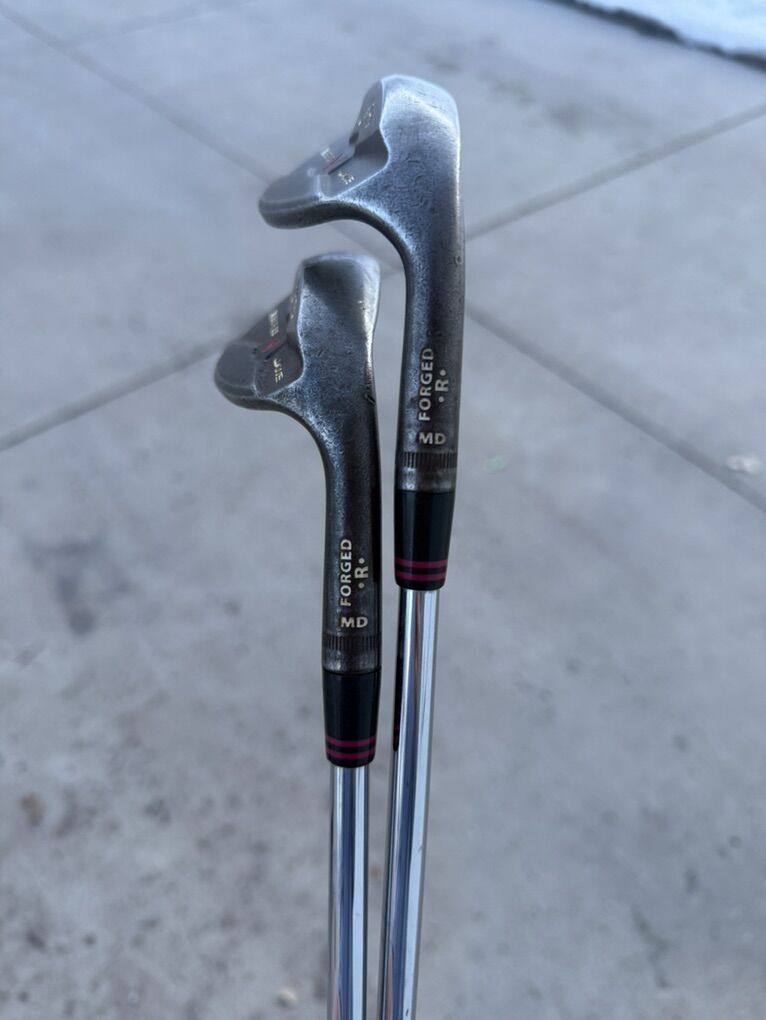 These are forged JAWS wedges known for excellent spin and feel. Both clubs show normal cosmetic wear from use (light to moderate face and sole wear, small nicks and scratches consistent with play).\