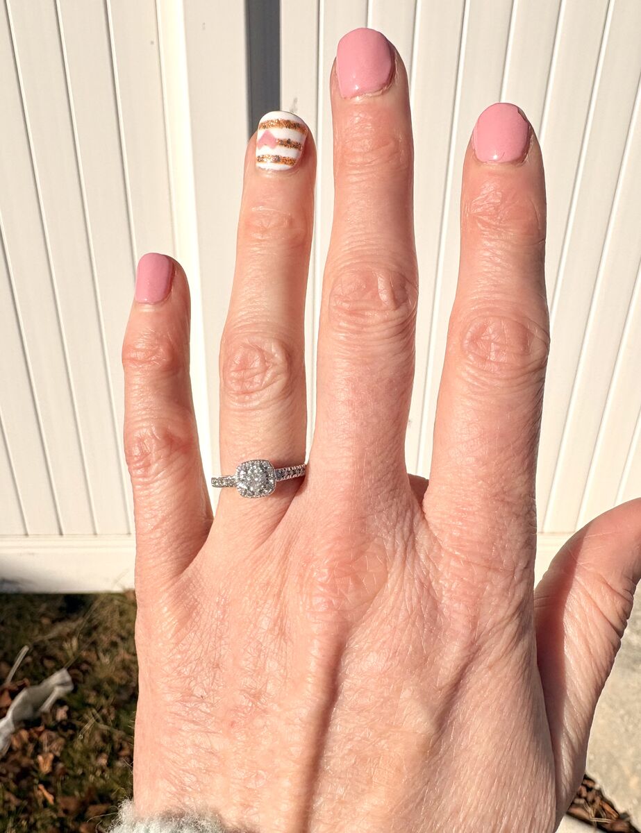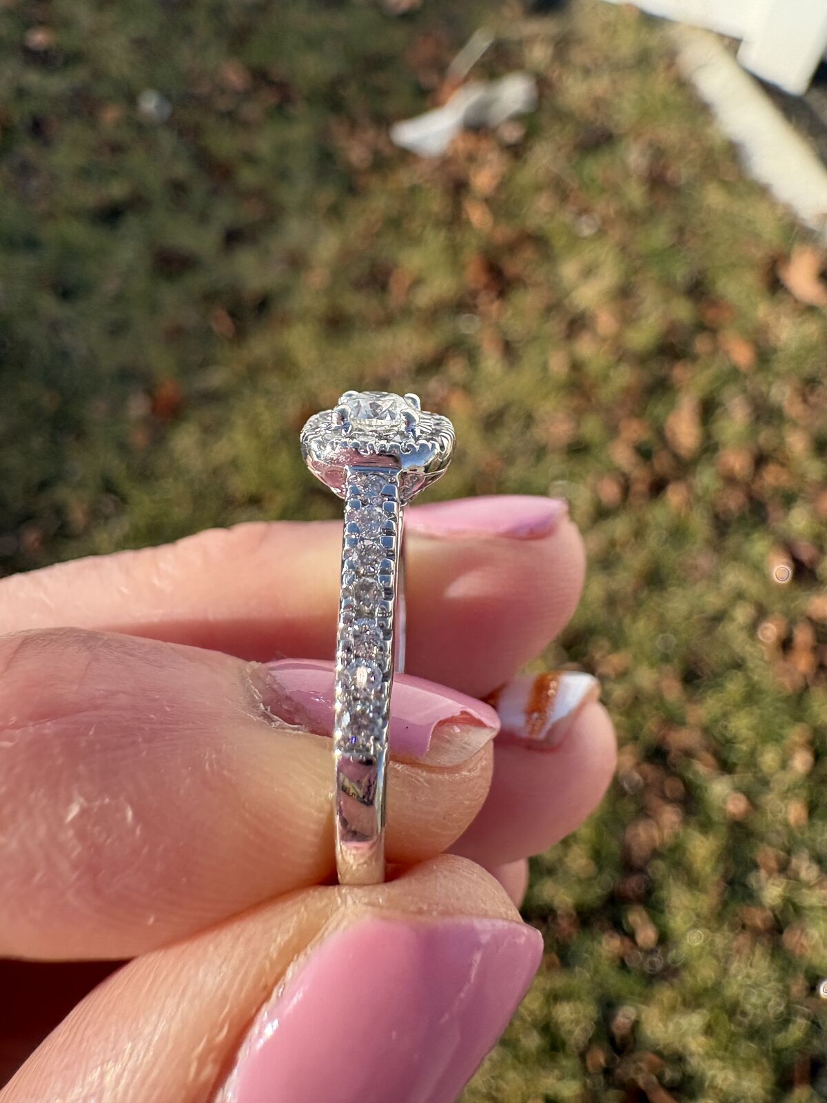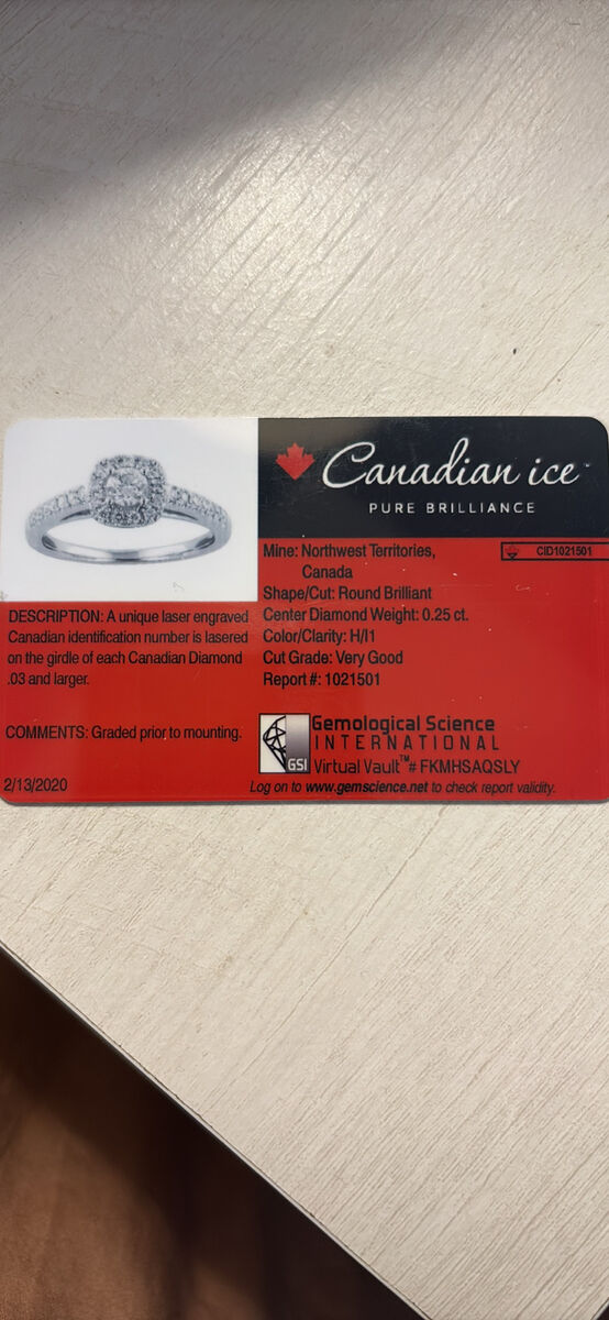 VenmoA beautiful 1/4 carat white gold engagement ring. Size 5. All the info about the diamond is in the last pic. There are more diamonds along the shank on either side but I can’t remember what the carats are worth on that part. Hardly worn and no longer need. It sparkles beautifully and will be a gorgeous ring for your sweethearts’ finger. Original price was $2500. Please let me know if you have any questions or would like to come see it.