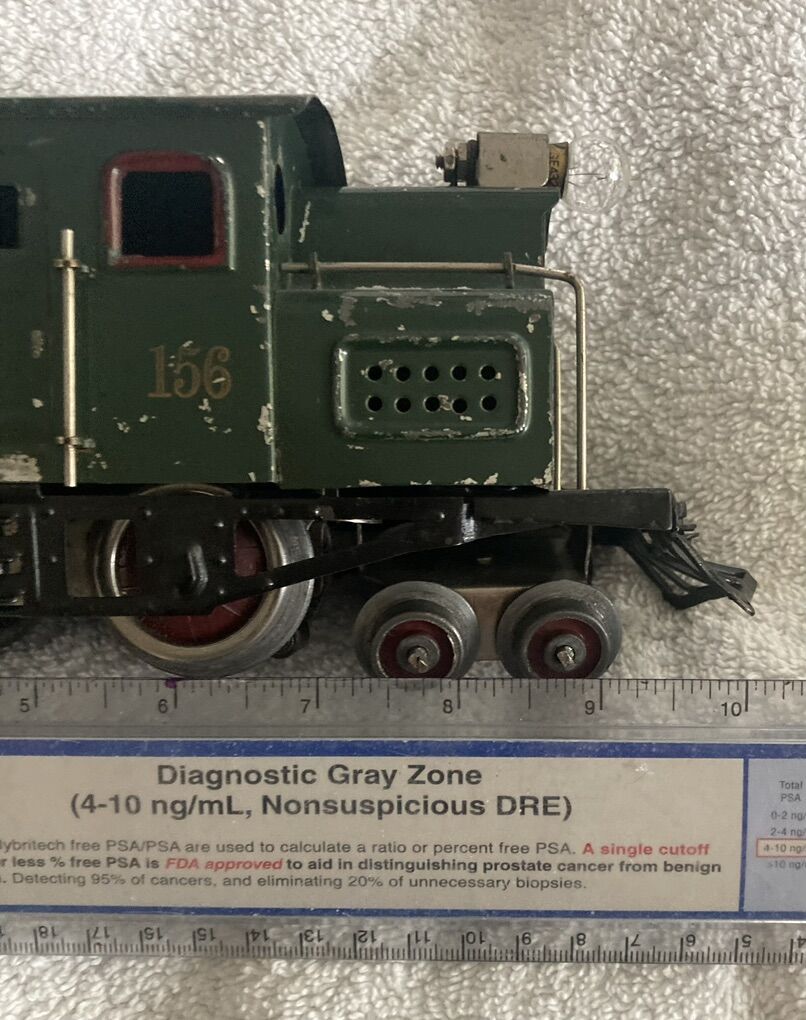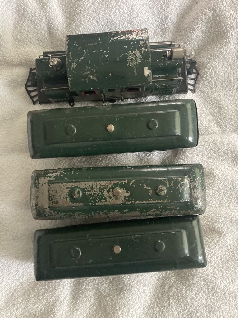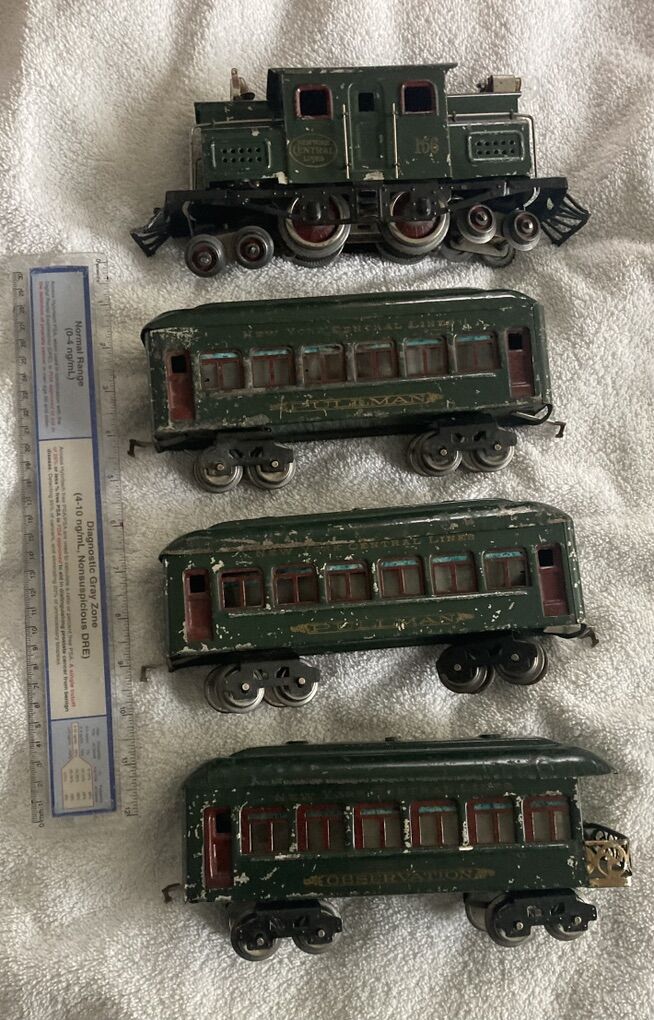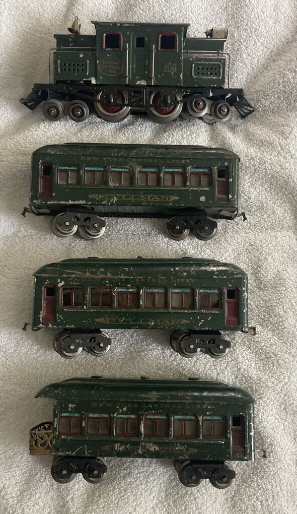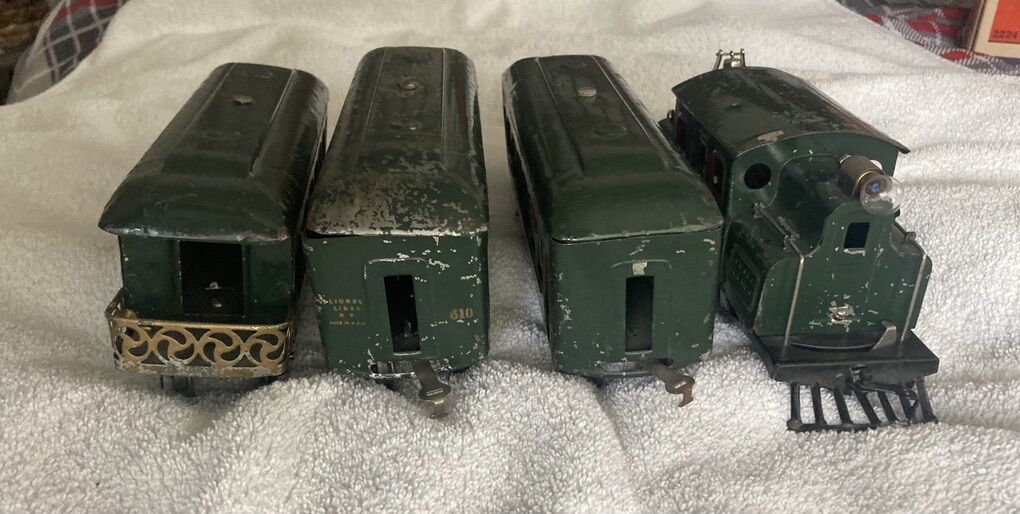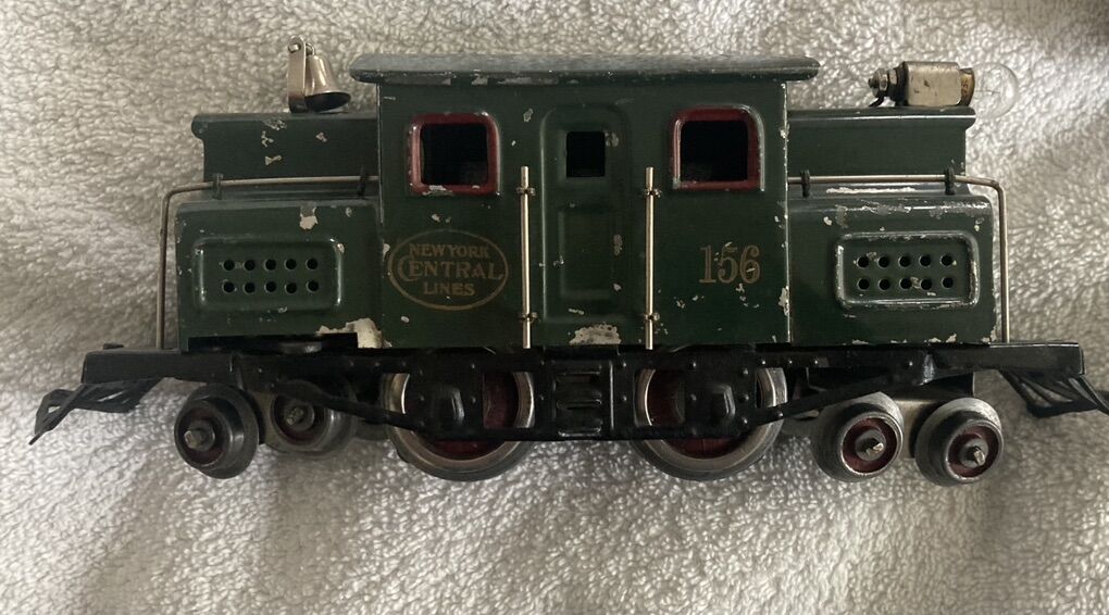 I am retiring soon and I have decided it’s time to let my Lionel train collection go. Up first is a prewar circa 1918 to 1922 #156 12 wheel electric type locomotive and matching passenger car set, two 610 pullmans and one 612 observation car. This has been on a shelf on display for years, I put some leads from my transformer to the locomotive and the wheels spun like they should and the headlight lit as it should, there is also a manual reverse lever and it also functioned correctly, reversing the direction of the wheels.