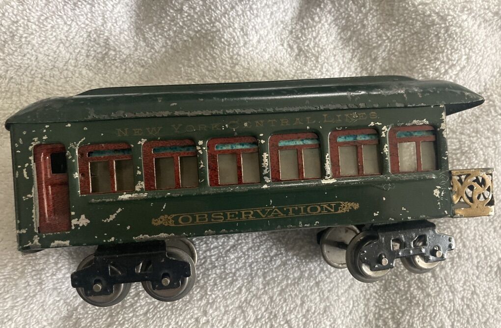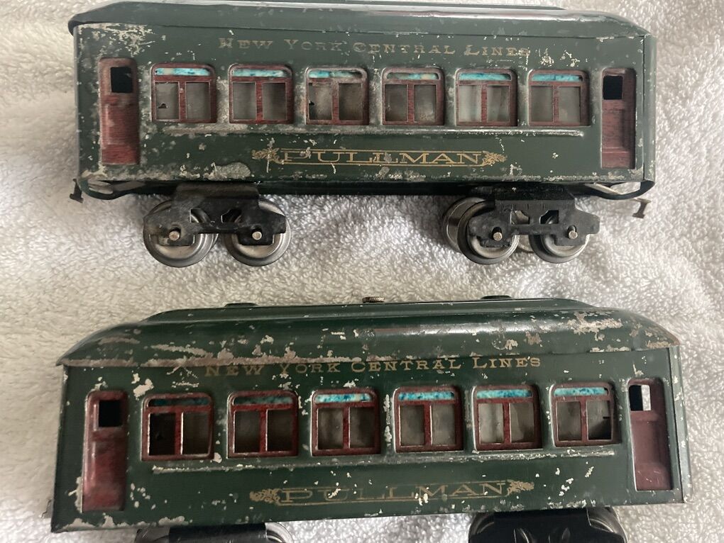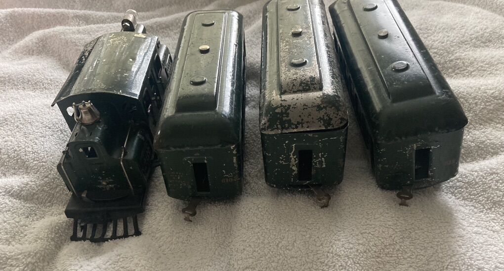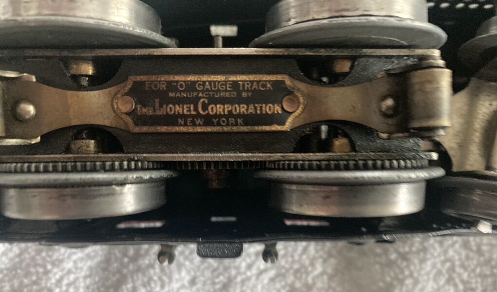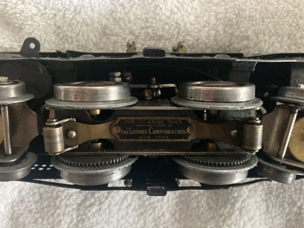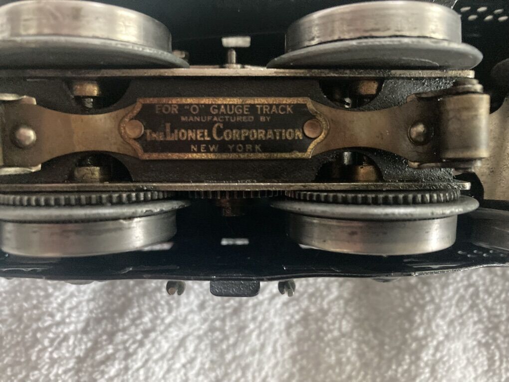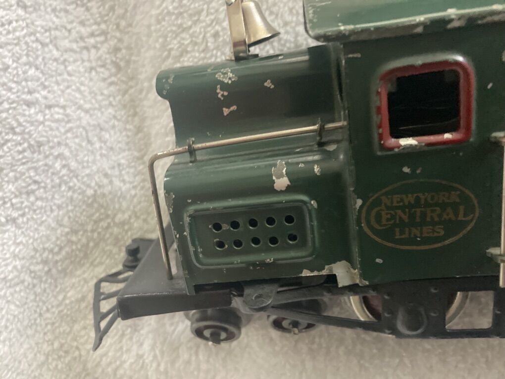 This set I believe to be original, (I am not an expert), including the wheels, paint, and motor. The frame on the loco may have been repainted at some point? It is over 100 years old and one of Lionel’s very first “O” gauge offerings. It is in very good condition for its age. This is a collector piece if you are going to run it regularly it will most likely require servicing as it has been sitting on display for years.