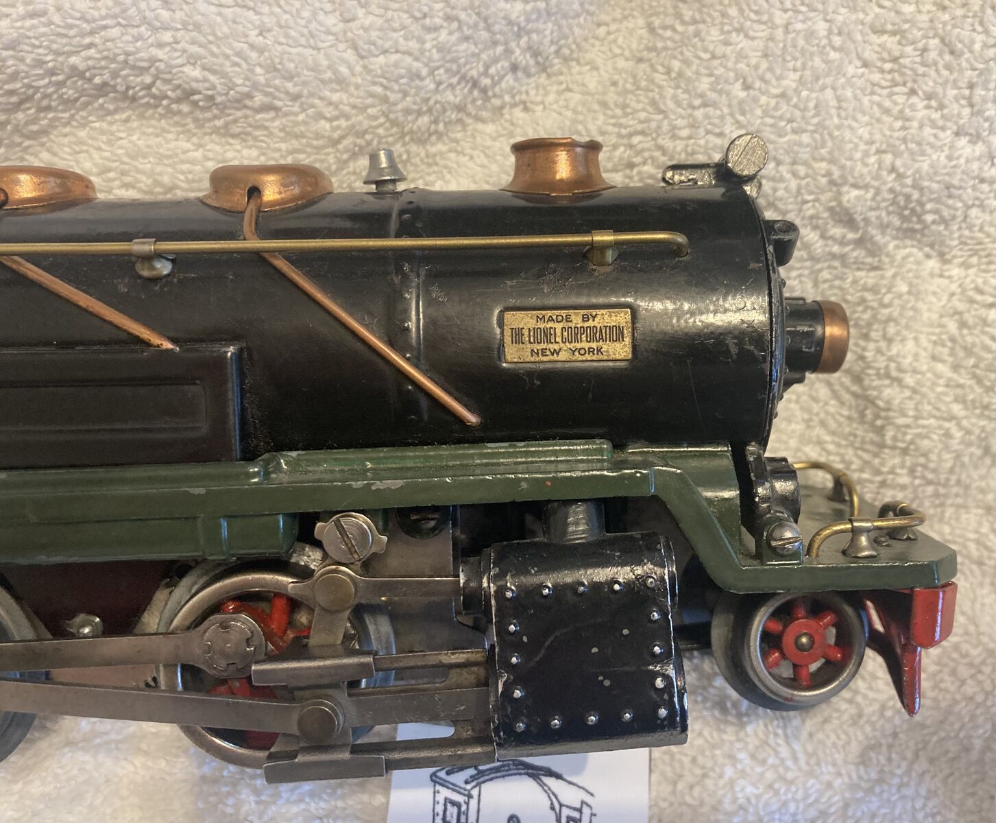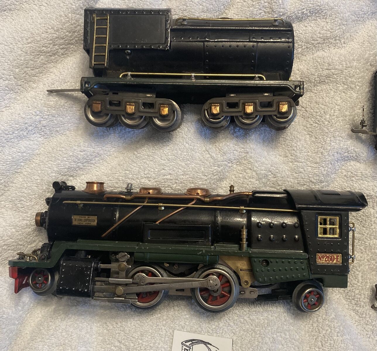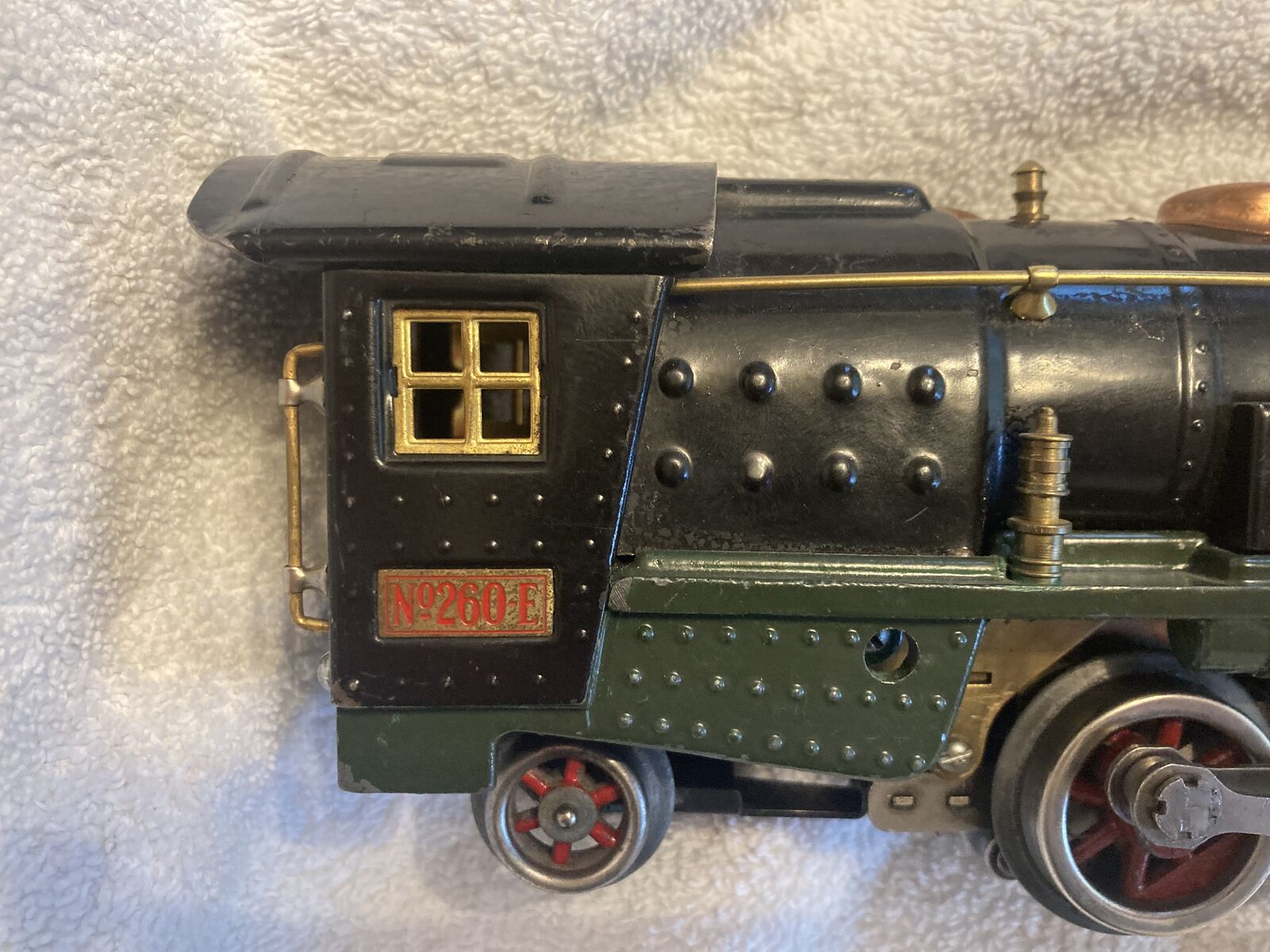 Up for sale Vintage Lionel “O” gauge prewar 260E locomotive circa 1930 to 1935 with a chugger mechanism and a pendulum 2 position reverse mechanism. The locomotive is complete with all the trim, no warping of the frame, original paint but there maybe some repainting of the frame and cow catcher. The wheels may have been replaced at some time as the originals were prone to zinc rot. The locomotive headlight and red firebox light under cab lit when power was applied, the motor ran and the chugger did work and chugged with the wheel revolutions. I did get it to reverse but it was finicky I was testing it with leads from the transformer and not on a track. There is a paper with a diagram of the position that the lever inside the cab has to be in order for the different locomotive functions to occur. I don’t have a layout as these have been on display. It may work better on level track but it will need some maintenance and adjustments to be run regularly, just know it doesn’t function very good right now