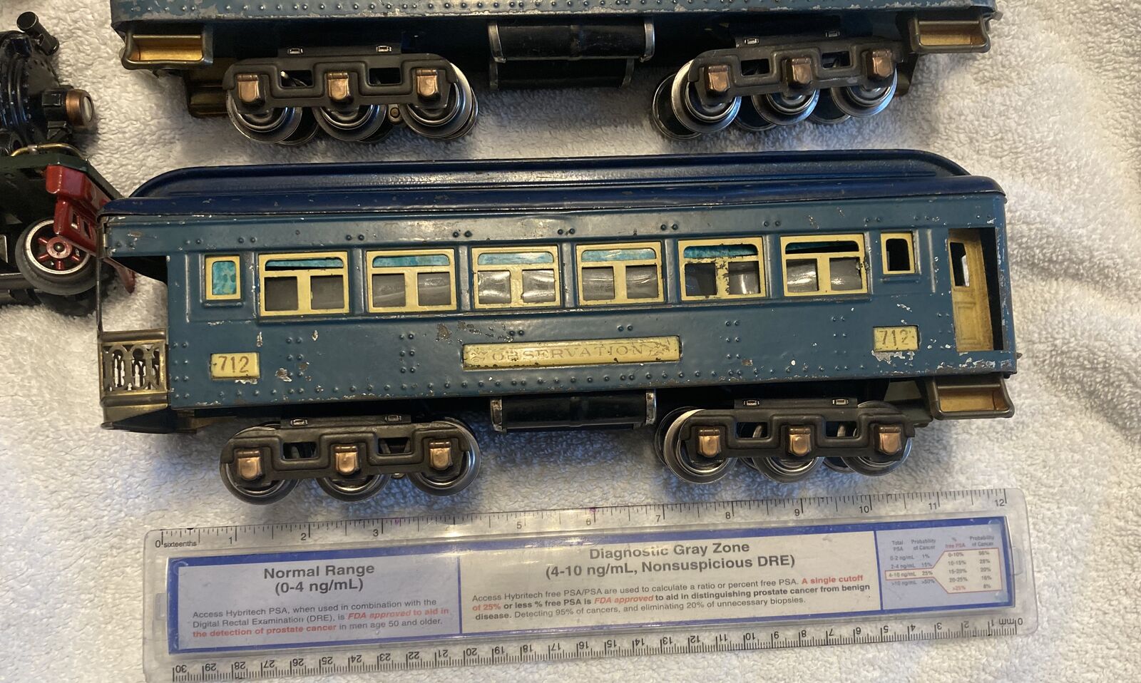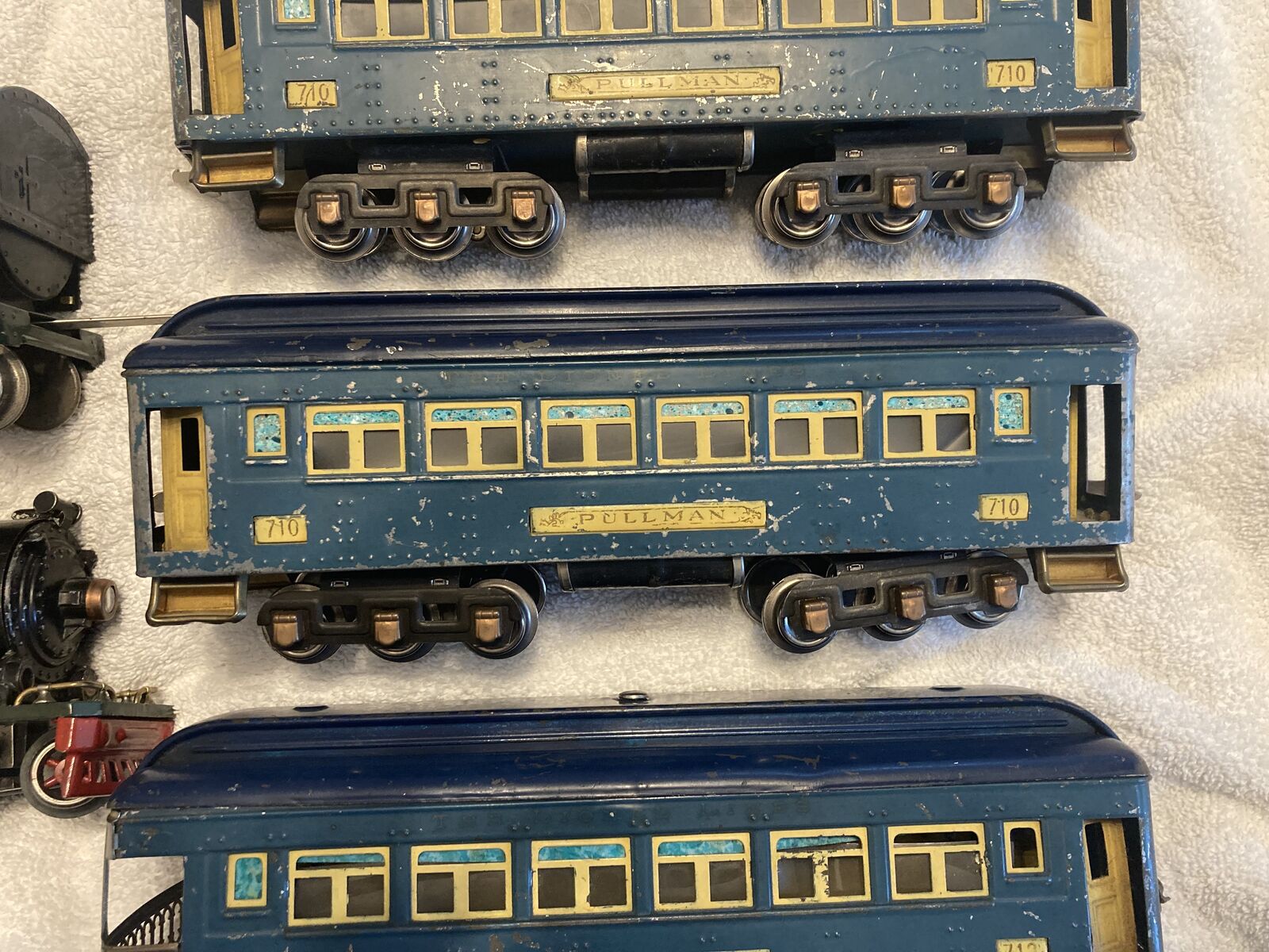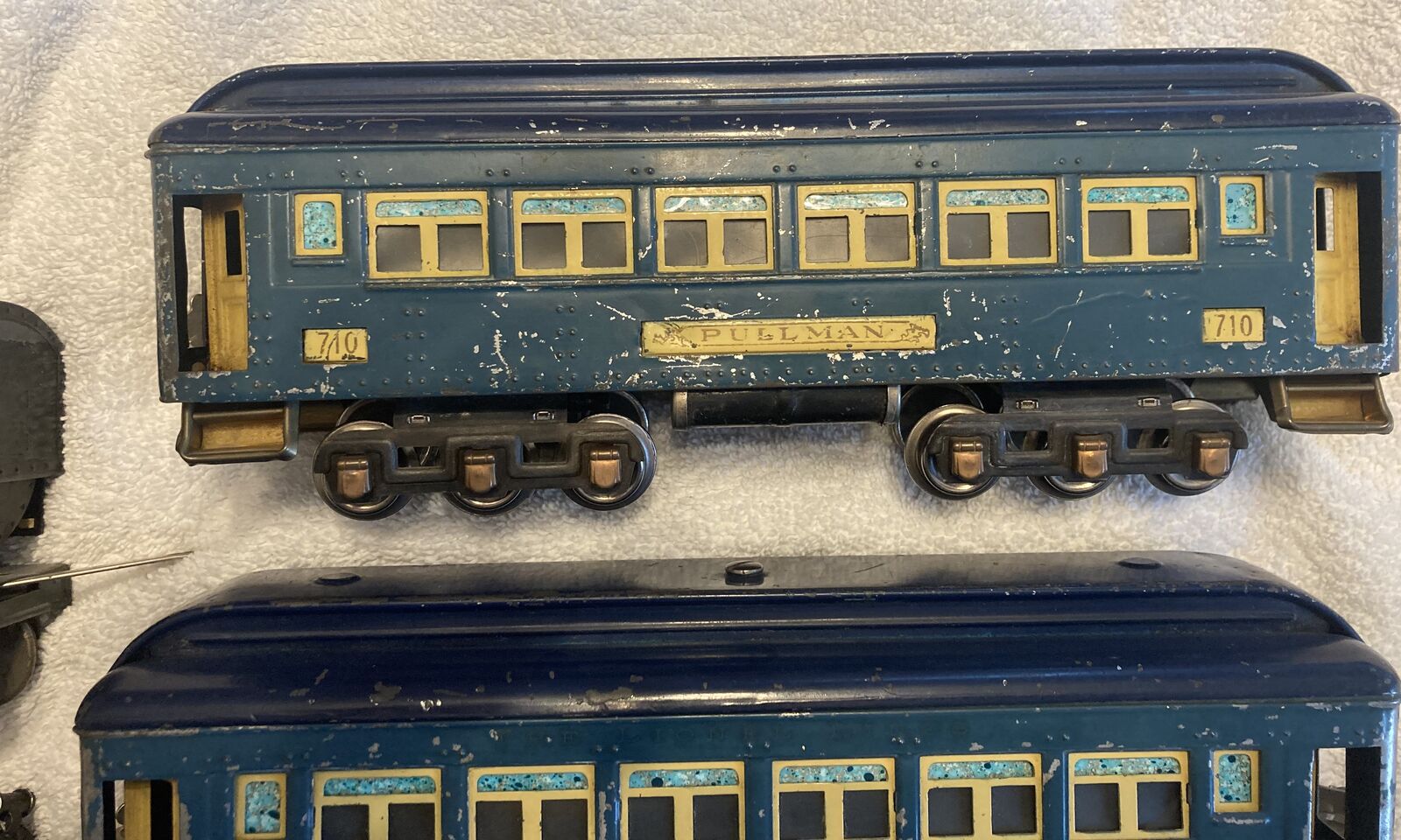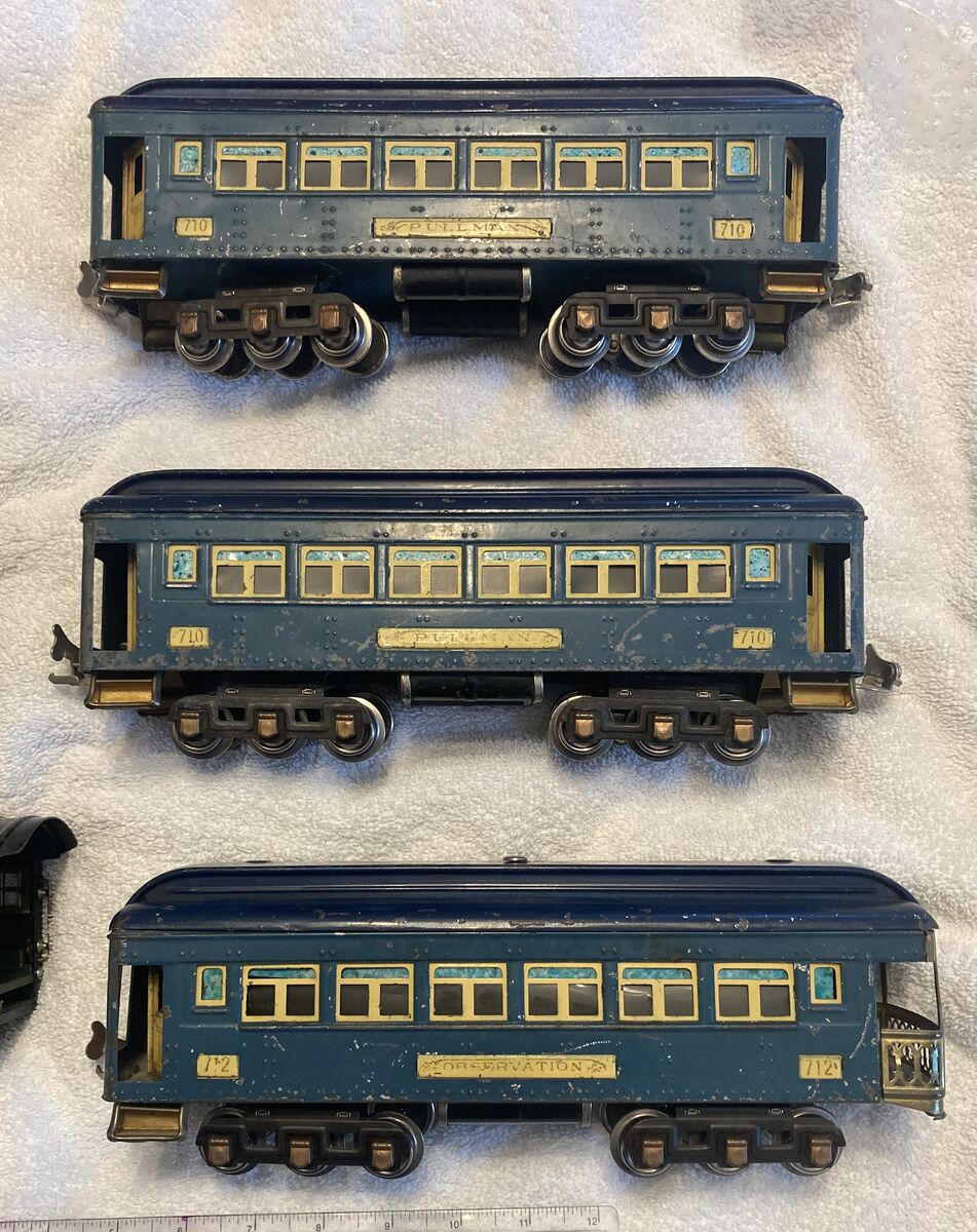 This set is highly desirable and somewhat rare these days, it comes with a matching 12 wheel tender and three 12 wheel passenger cars all with copper journals. The tender is sheet metal and die cast and shows no signs of deterioration, the 3 passenger cars are sheet metal and are two tone blue with cream colored accents. There are two 710 coaches and one 713 observation car. The cars all have lighting and are complete, the wiring is old and the wheel pickups are dirty, they will need cleaning or you will have a lot of flickering lights.
