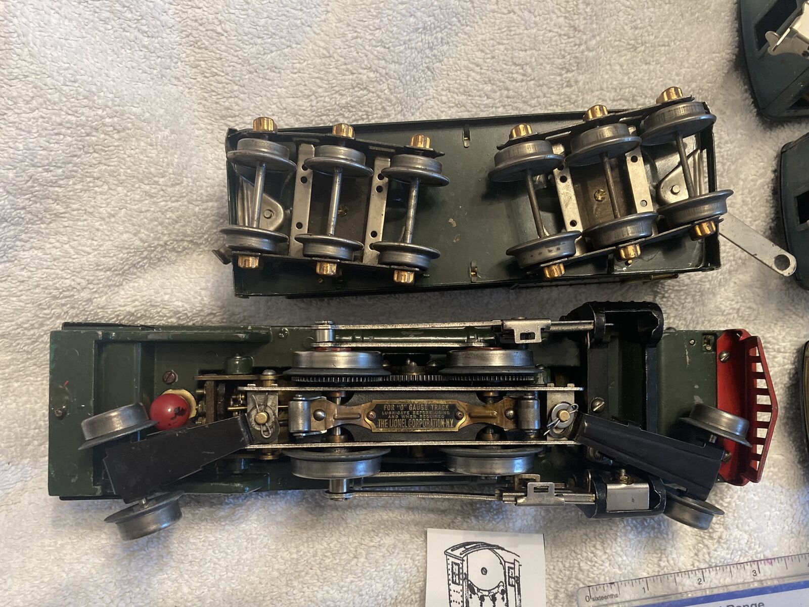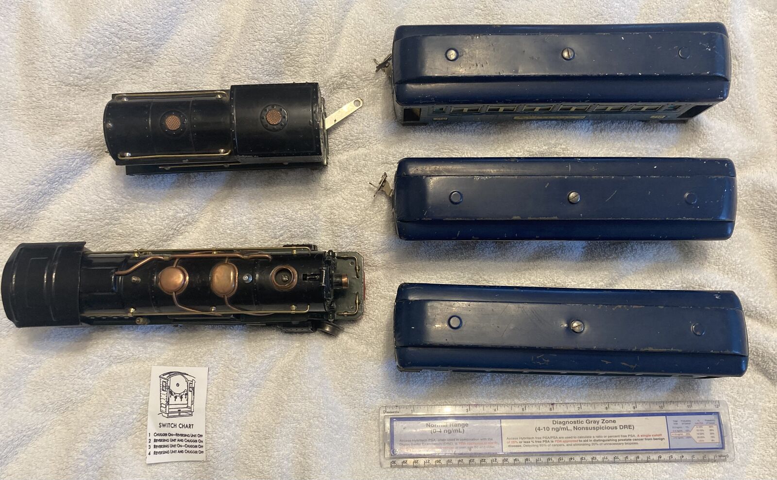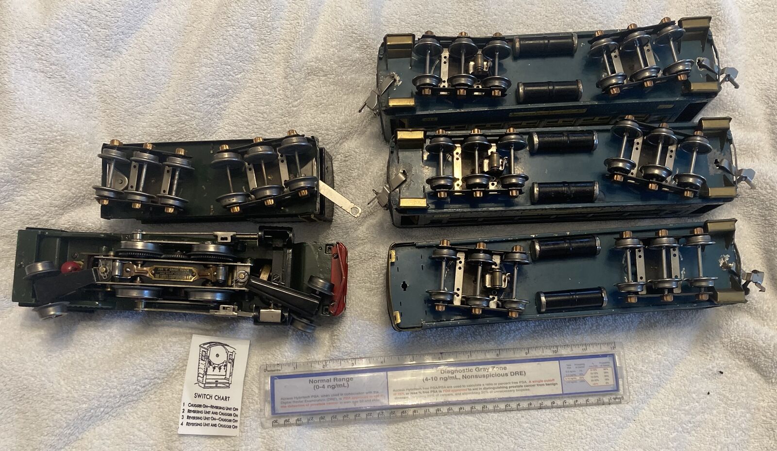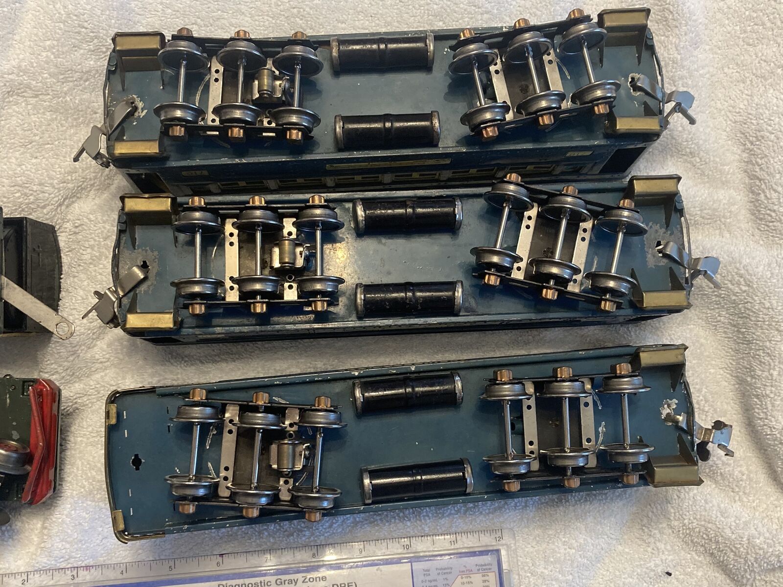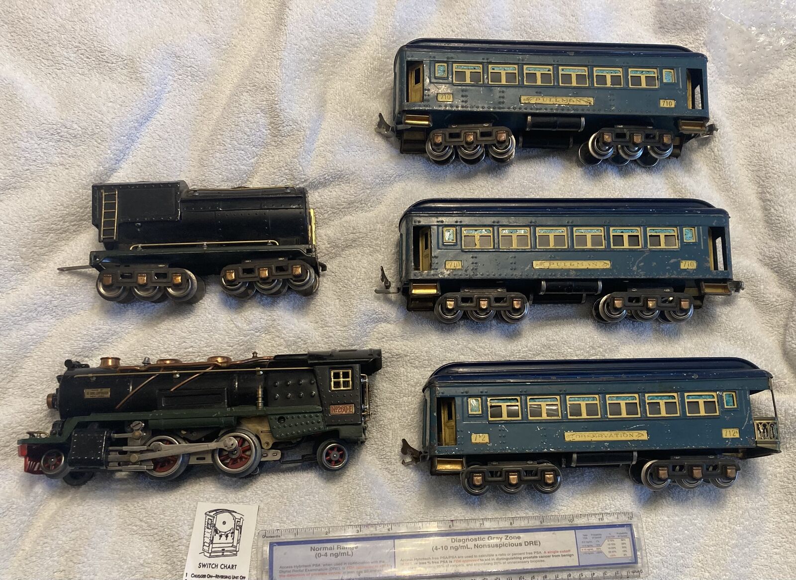 This set is highly desirable and somewhat rare these days, it comes with a matching 12 wheel tender and three 12 wheel passenger cars all with copper journals. The tender is sheet metal and die cast and shows no signs of deterioration, the 3 passenger cars are sheet metal and are two tone blue with cream colored accents. There are two 710 coaches and one 713 observation car. The cars all have lighting and are complete, the wiring is old and the wheel pickups are dirty, they will need cleaning or you will have a lot of flickering lights.