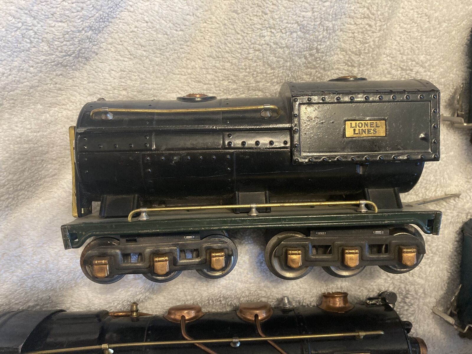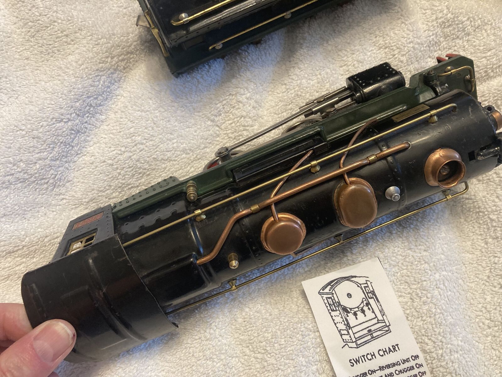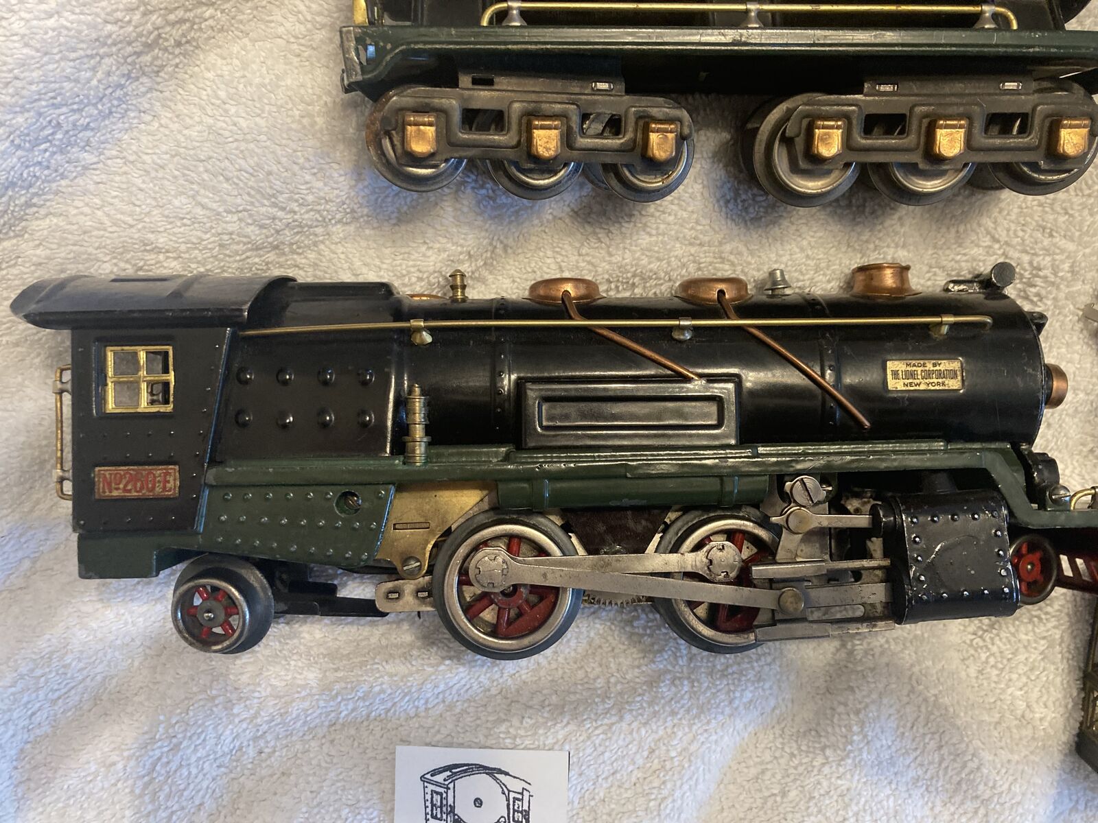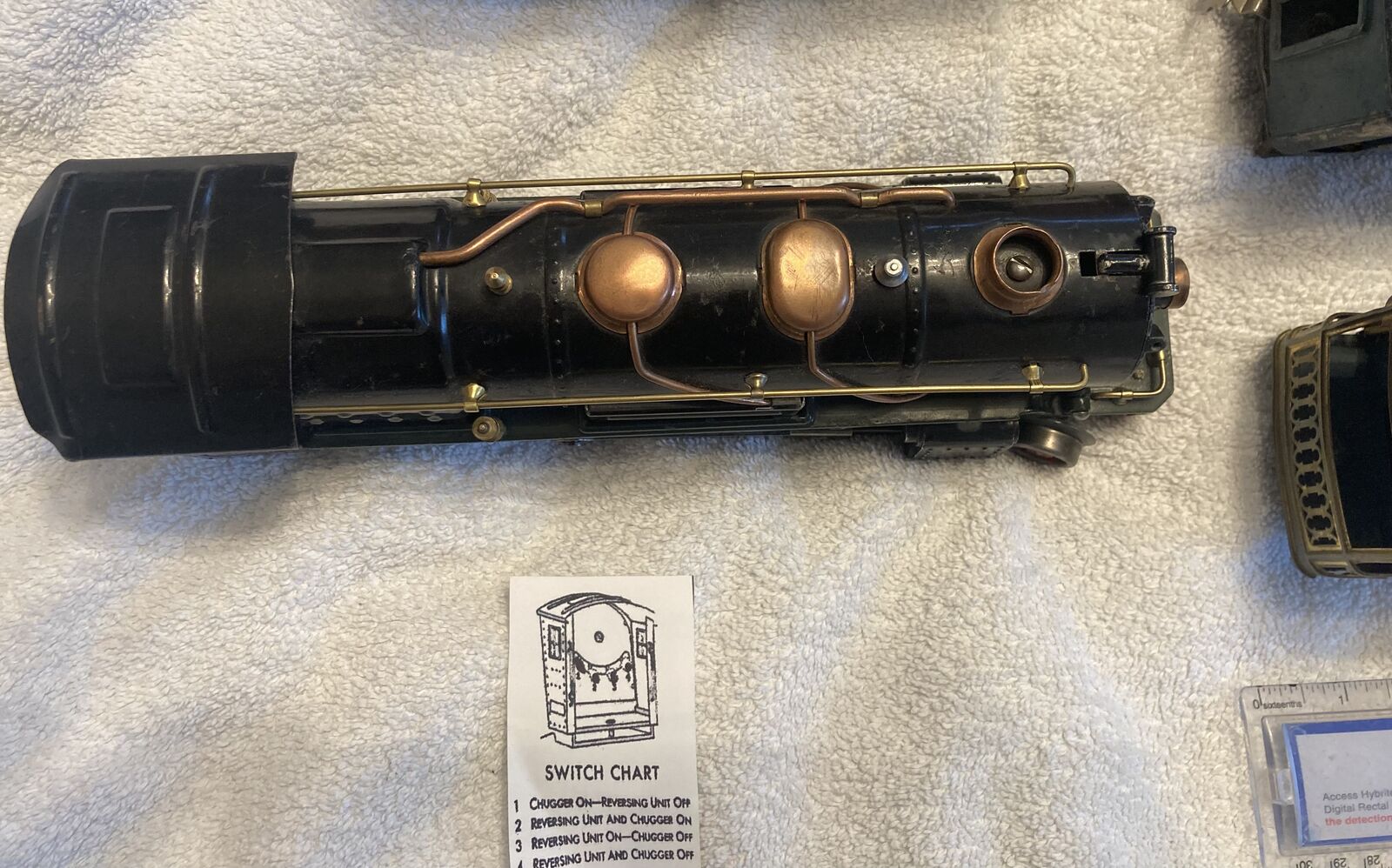 This set is highly desirable and somewhat rare these days, it comes with a matching 12 wheel tender and three 12 wheel passenger cars all with copper journals. The tender is sheet metal and die cast and shows no signs of deterioration, the 3 passenger cars are sheet metal and are two tone blue with cream colored accents. There are two 710 coaches and one 713 observation car. The cars all have lighting and are complete, the wiring is old and the wheel pickups are dirty, they will need cleaning or you will have a lot of flickering lights.
