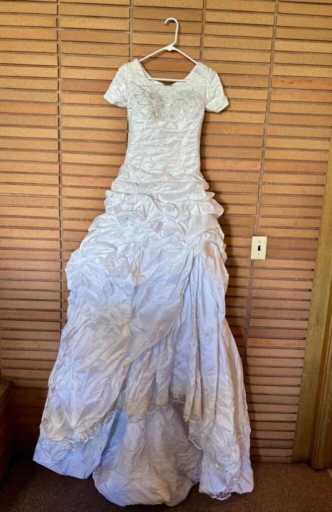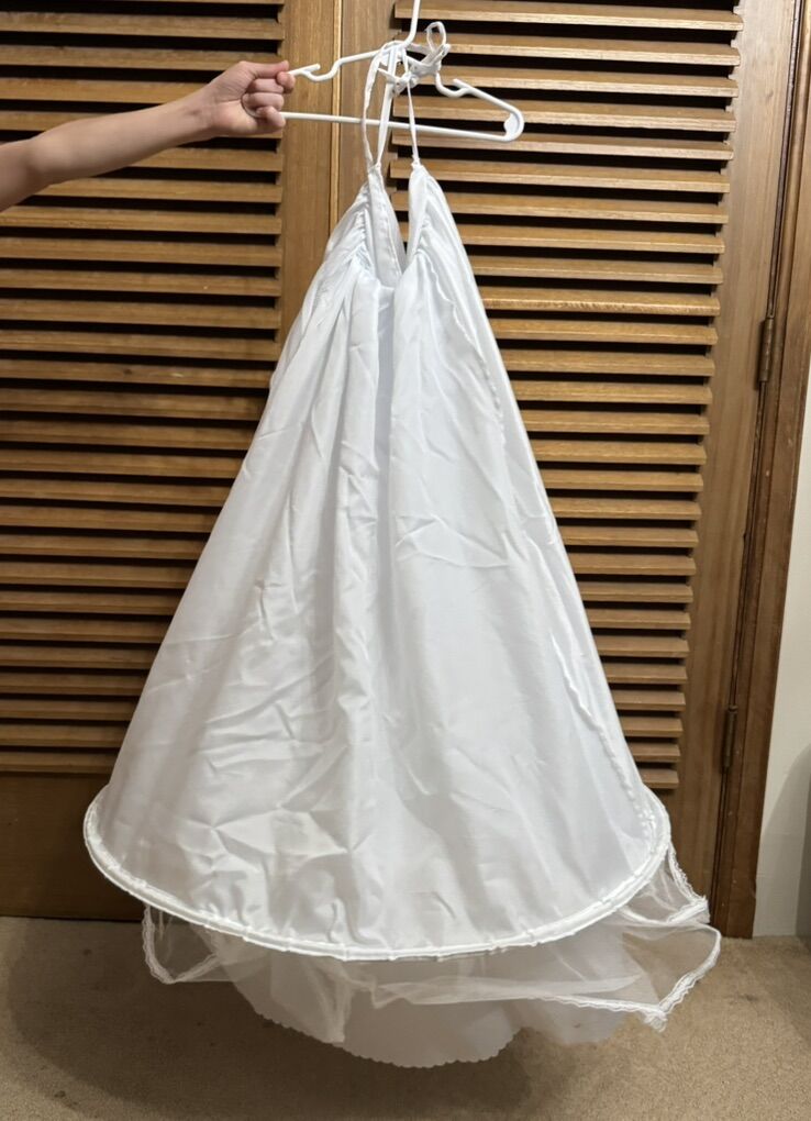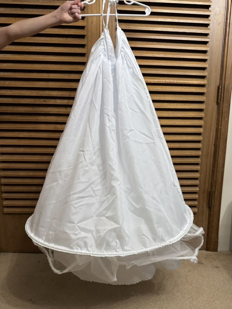 Wedding dress, lace and ruffles. With a hoop skirt. Size 2-4. Never worn. Cash is preferred please.