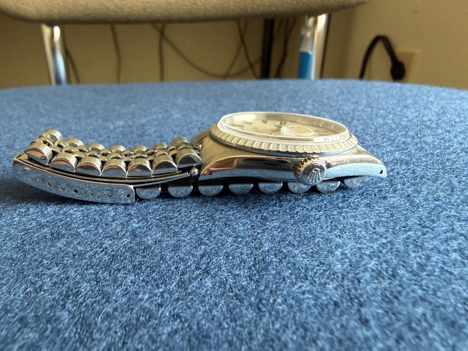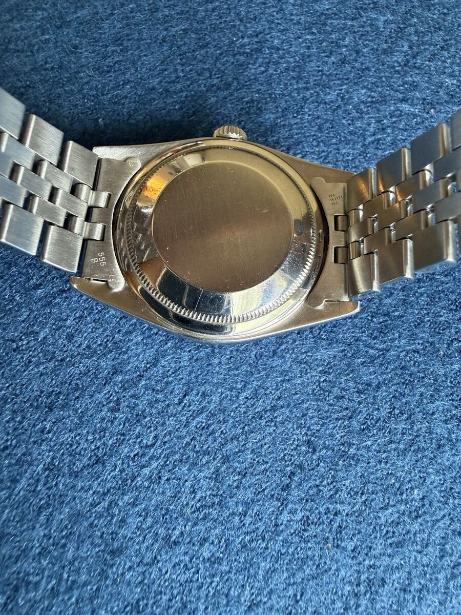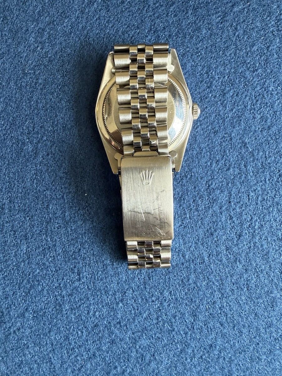 GooglePayRolex Datejust 36 Ref. 16220 – Tapestry Dial – Jubilee – Box & Papers (1990s) For sale is a Rolex Datejust reference 16220 with a tapestry dial and stainless steel Jubilee bracelet. Serial number dates the watch to the 1990s. Classic 36mm size with sapphire crystal and engine turned bezel. Currently sized to fit approximately a 6.5” wrist. Includes 2 extra links for a larger fit Nick/chip on the sapphire crystal (visible; see photos). Jubilee bracelet has stretch from normal wear. Typical light scratches/wear throughout consistent with age Sold as pictured. Please review all photos closely for condition details.