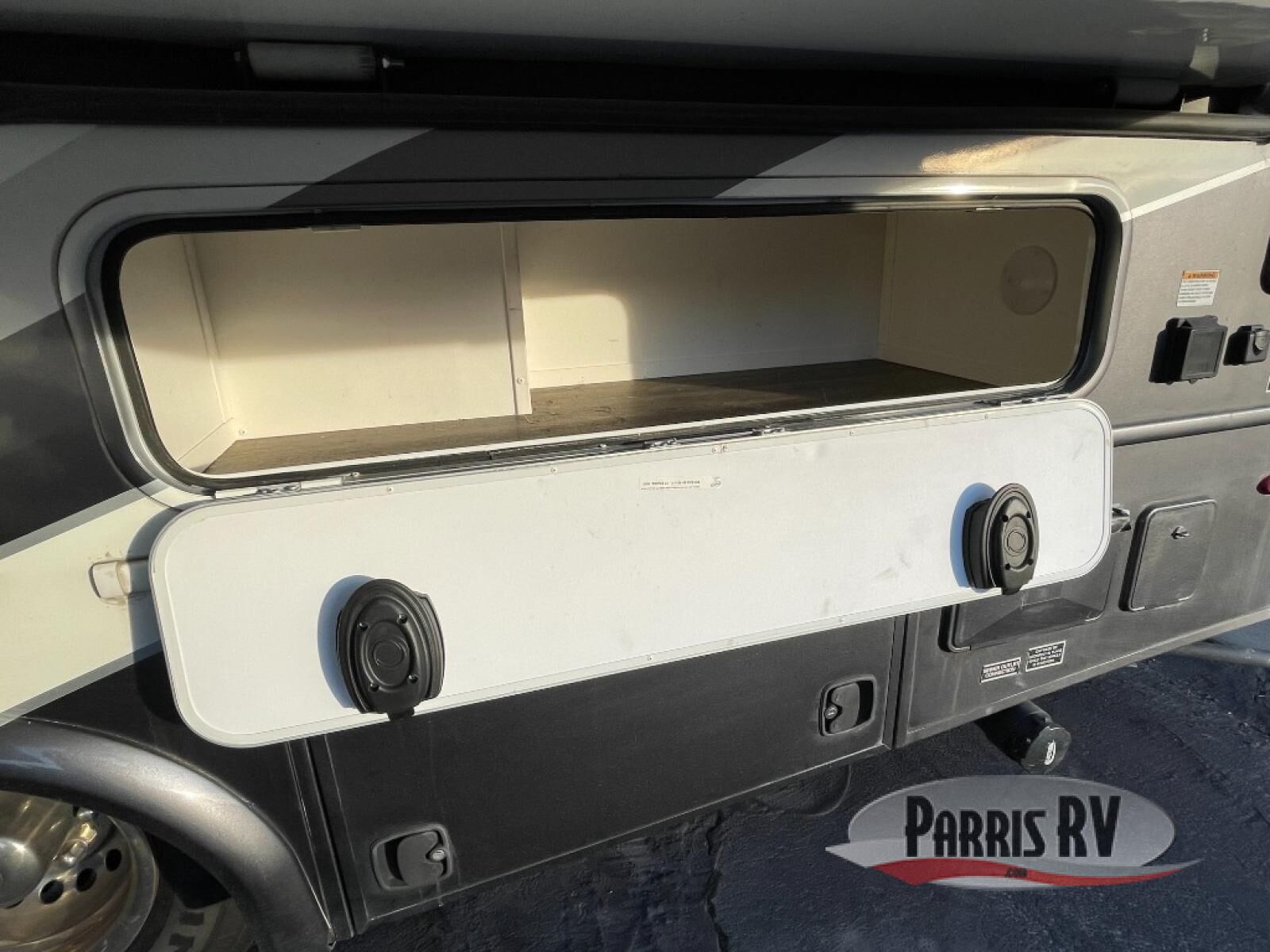 The full wall slide along the driver side ends with a wardrobe and queen size bed. There is also a nightstand just off the slide in the very rear, and you can opt. for a TV/DVD player just off the foot of the bed along the outer bathroom wall.