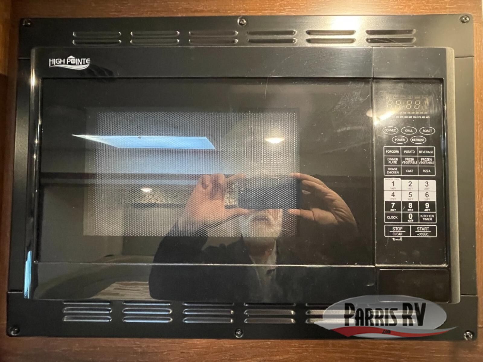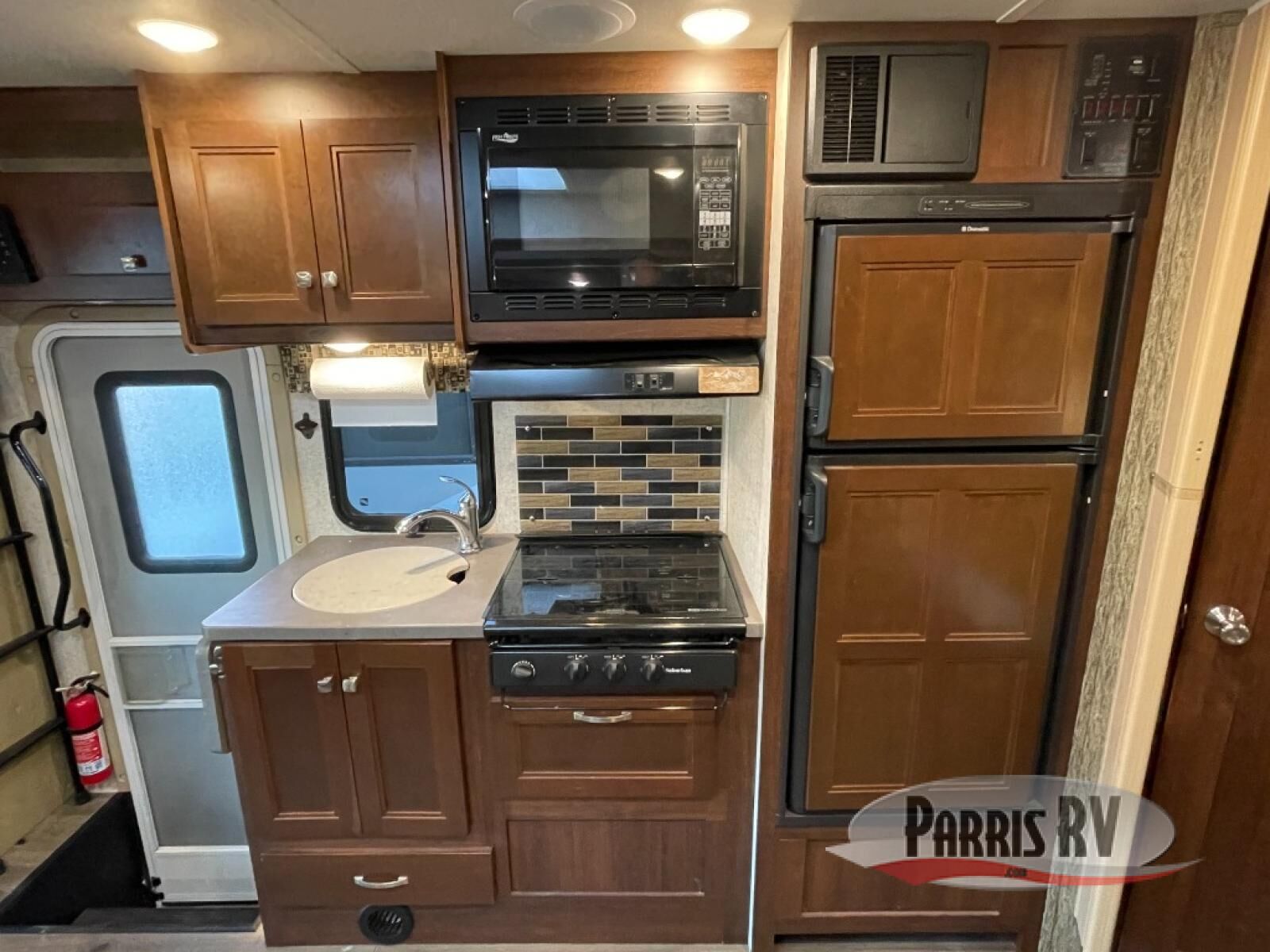 Opposite the dinette you will find the kitchen area which includes a refrigerator, a range top with microwave oven, and round single sink. There is also a flip-up counter for added prep space or place to set dishes to be washed. There are also overhead cabinets for dishes and things, and a pantry for dry goods next to the dinette in the large slide across the coach.