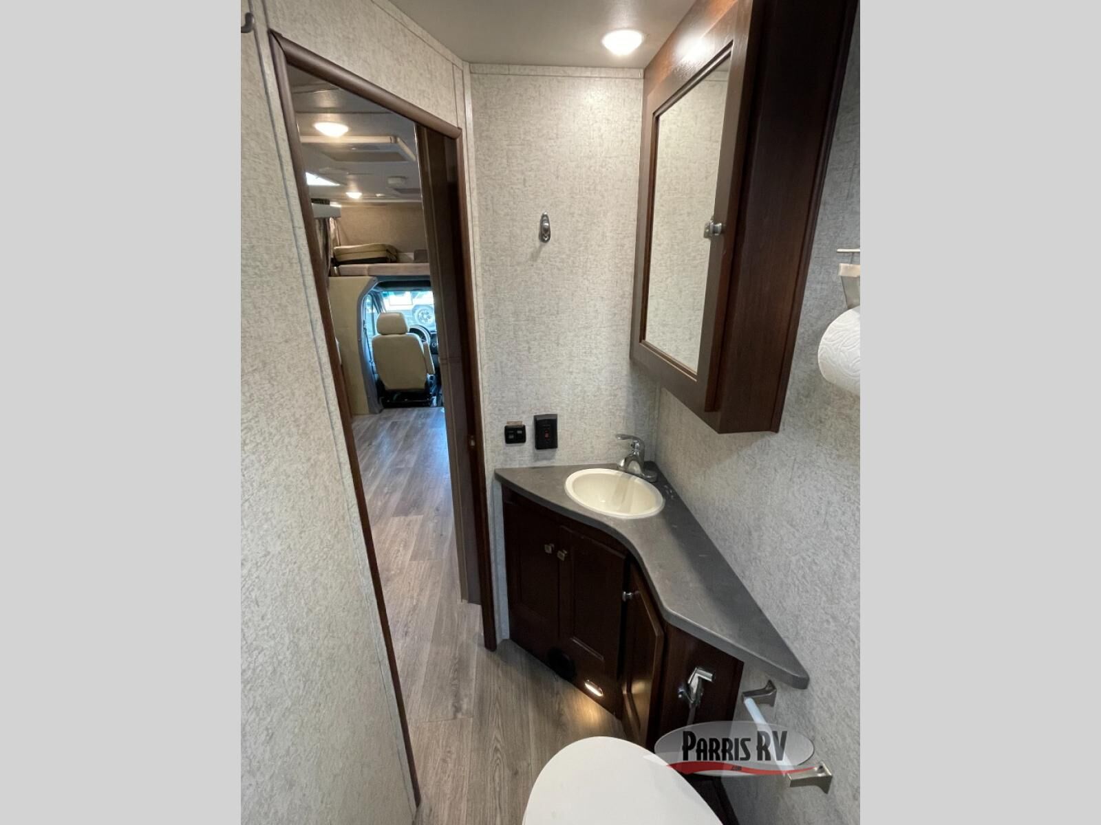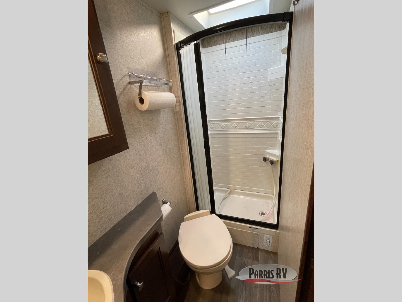 The rear of this unit features a complete bath along the curb side corner. Here you can find a convenient shower, toilet, and vanity with sink, plus overhead medicine cabinet. A curtain can be drawn just outside the bathroom door to the opposite side and section off the bedroom and bathroom space for more privacy at night.