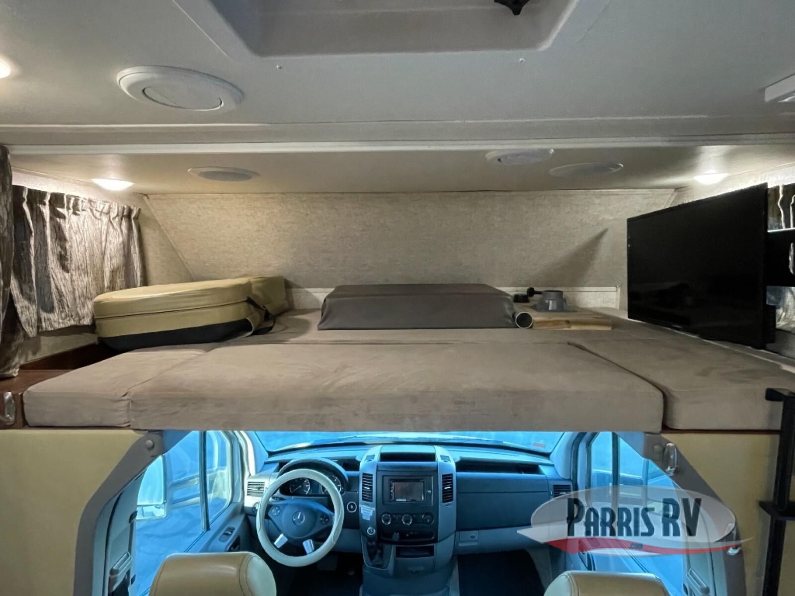 Above the cab area you will notice a 54" x 80" bunk mat for sleeping that includes storage and an LED TV too. You can opt. instead for a entertainment center if you really won't need the sleeping space.
