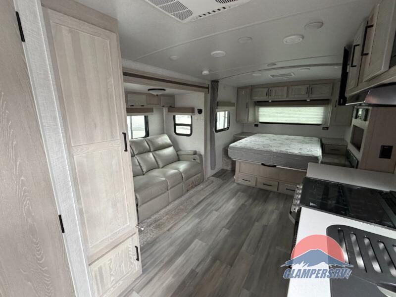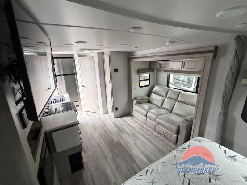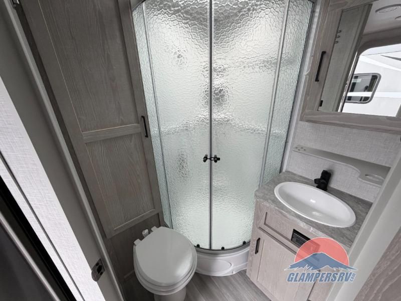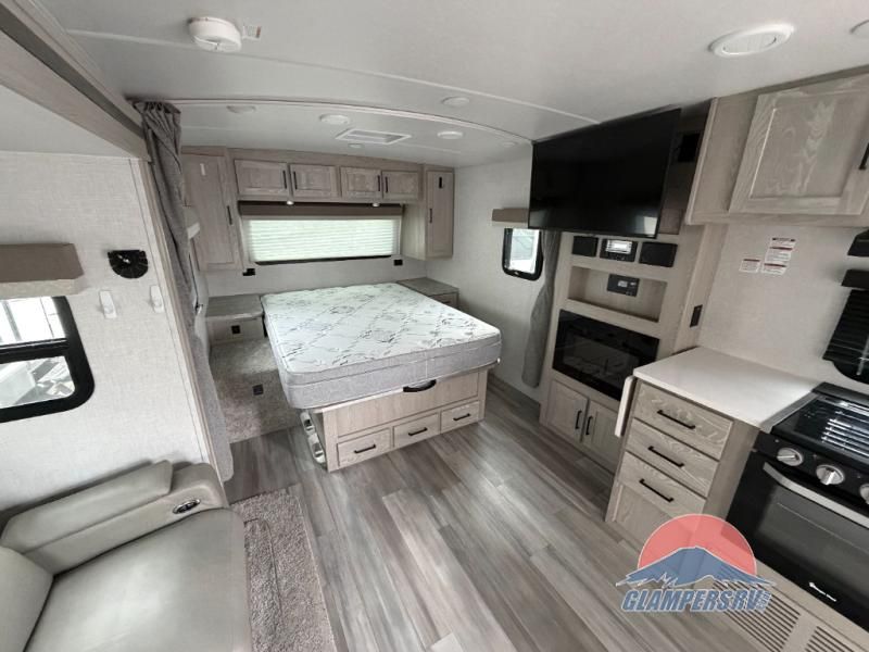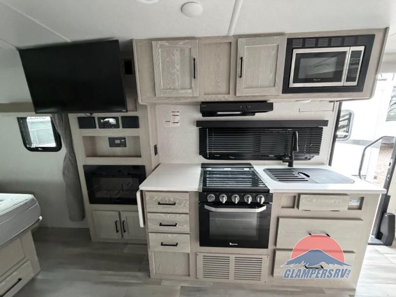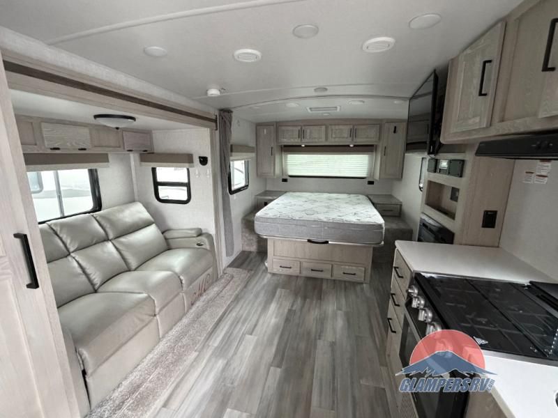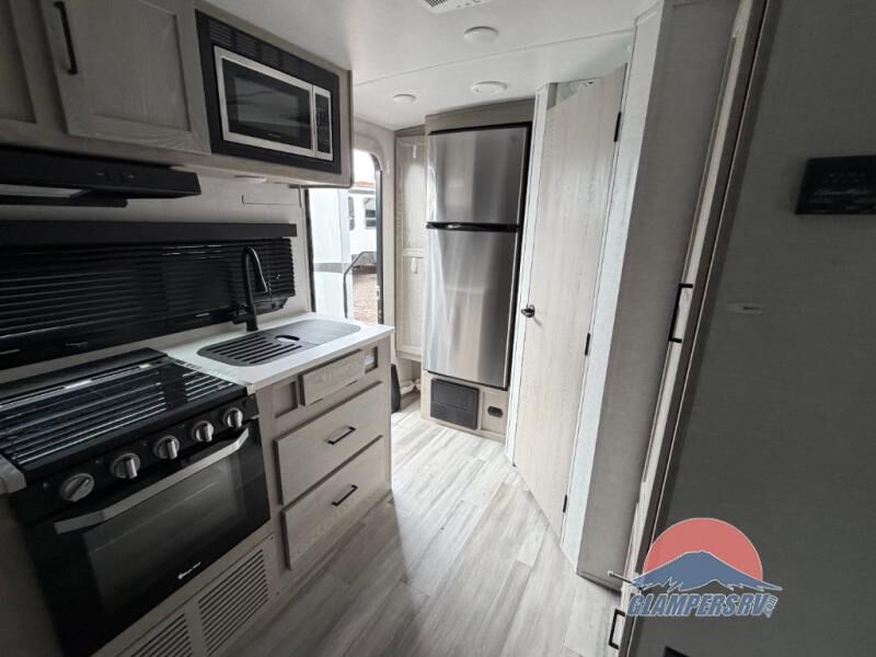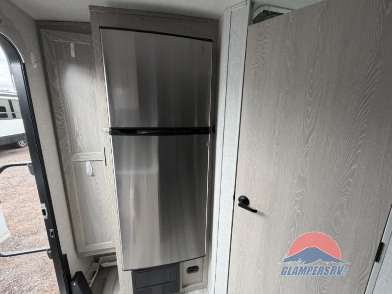 Each Flagstaff Micro Lite travel trailer by Forest River features laminated fiberglass sidewalls, sleek tinted frameless windows, and Azdel composite panels for added strength and support. You can easily tow these travel trailers with an SUV since they are so lightweight, and there is a power tongue jack for quick and easy set up. Some of the convenient amenities you will enjoy are the Teton All-In-One WiFi booster/LTE prep and antenna, the double battery boxes, Key-Alike locks, plus a Maxxair fan with a cover to keep the fresh air moving in your RV. You will love the modern look of the Newport Ash or Autumn Wood cabinetry, plus there are solid wood cabinet doors, solid surface kitchen countertops, and a Showermiser water saving system in the bathroom. Choose a Flagstaff Micro Lite travel trailer and you won't be disappointed! DLR #886B