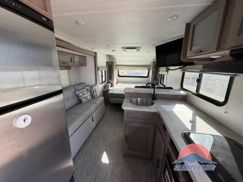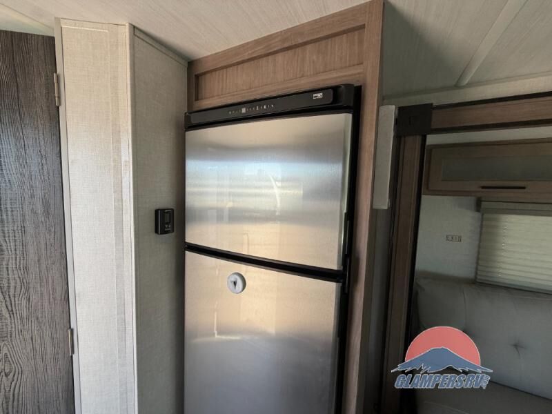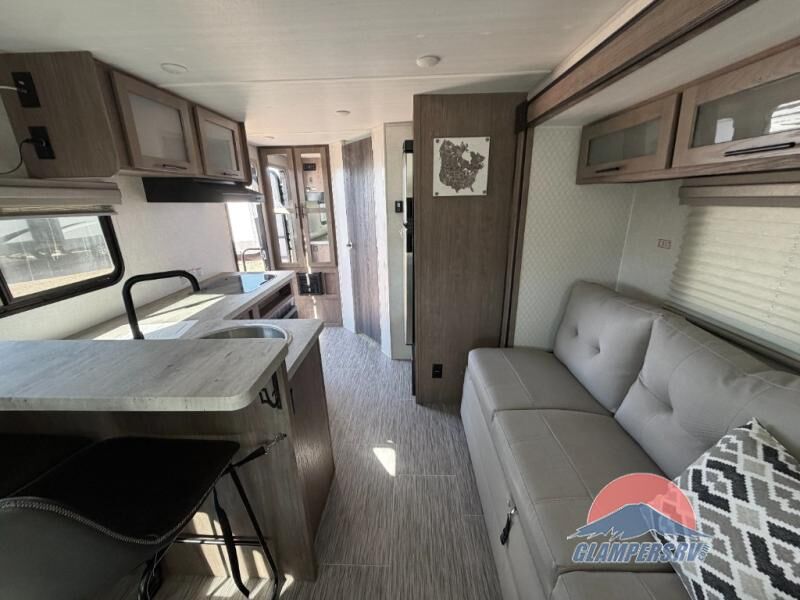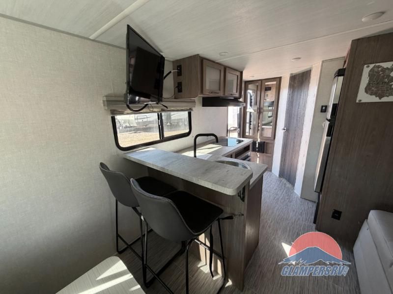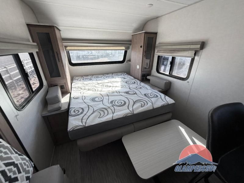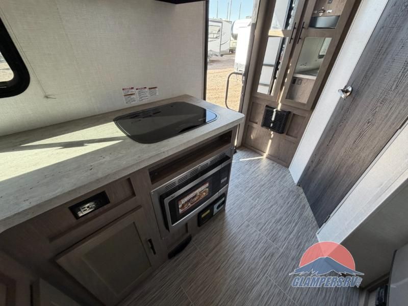 If you haven't experienced the versatility of a Murphy queen bed that can fold out when you need it at night and hide away during the day when you need the sofa, give it a try! You will also find a sofa on the single slide that pushes out to reveal more interior living space. The breakfast bar provides countertop space for dining or visiting with the cook. This can be the perfect couple's trailer, yet a child or guest can sleep on the sofa. Everyone can take turns getting cleaned up in the radius shower in the rear corner bathroom, and some campers can hang out outdoors under the 16' power awning that offers an outdoor living area once you add your camping chairs.
