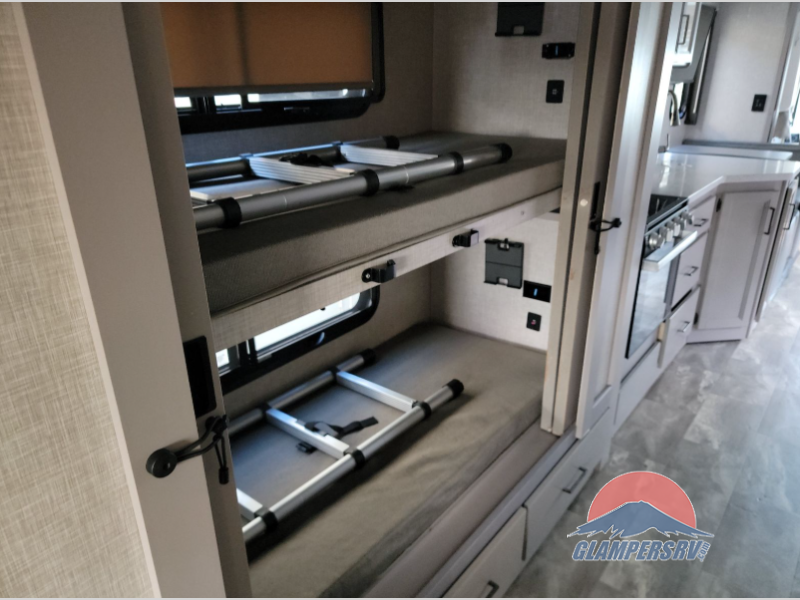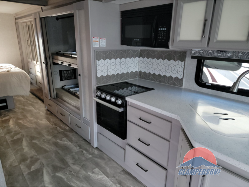 This Windsport Class A gas motorhome gives you a great relaxation area with a 70" Dream Dinette, 68" sofa bed, LED TV, and USB charging ports. This coach also offers you lots of sleeping space with the king bed back in the private bedroom, the 27" x 74" bunk beds on the full-wall slide, and the drop-down overhead bunk above the cab. You can also create more sleeping space when you turn the dinette and sofa into beds. The full bathroom offers you a 30" x 36" shower with skylight and glass door, and you will love how convenient the kitchen will be with its residential refrigerator, pantry, three-burner gas cooktop, microwave, and double-bowl sink.