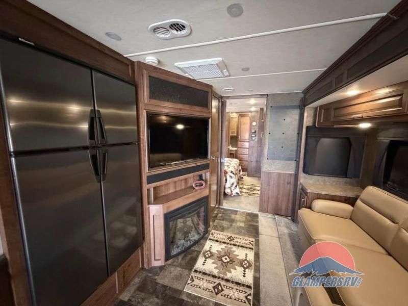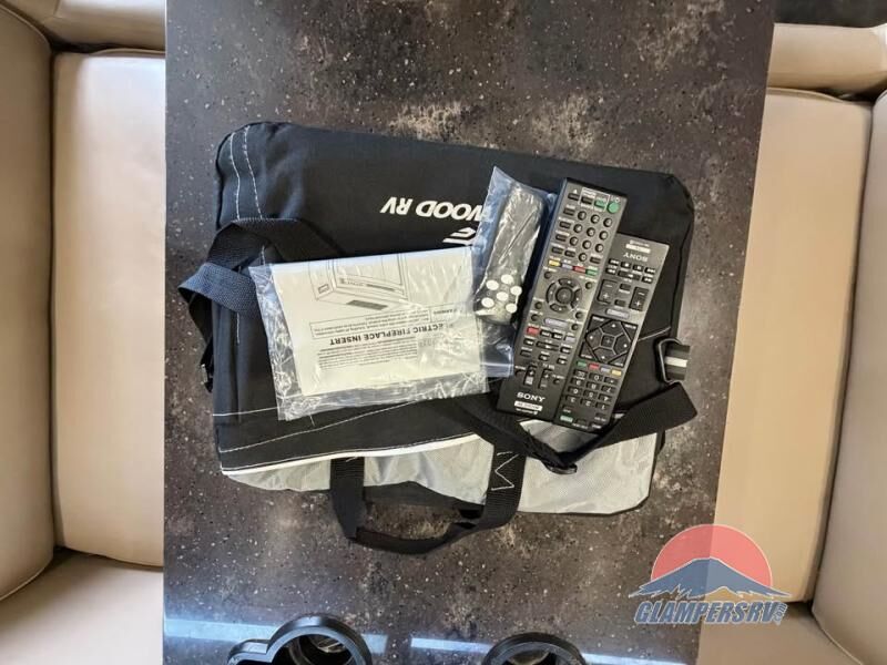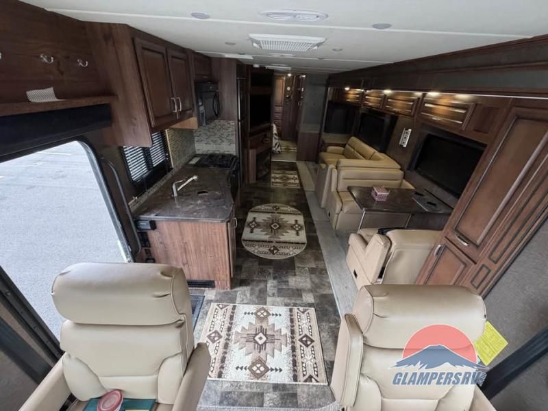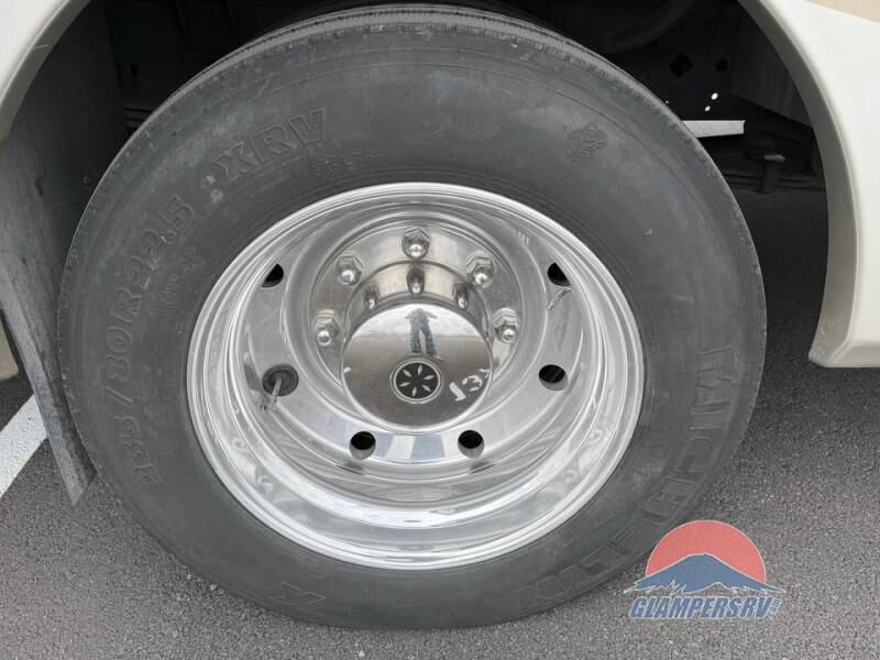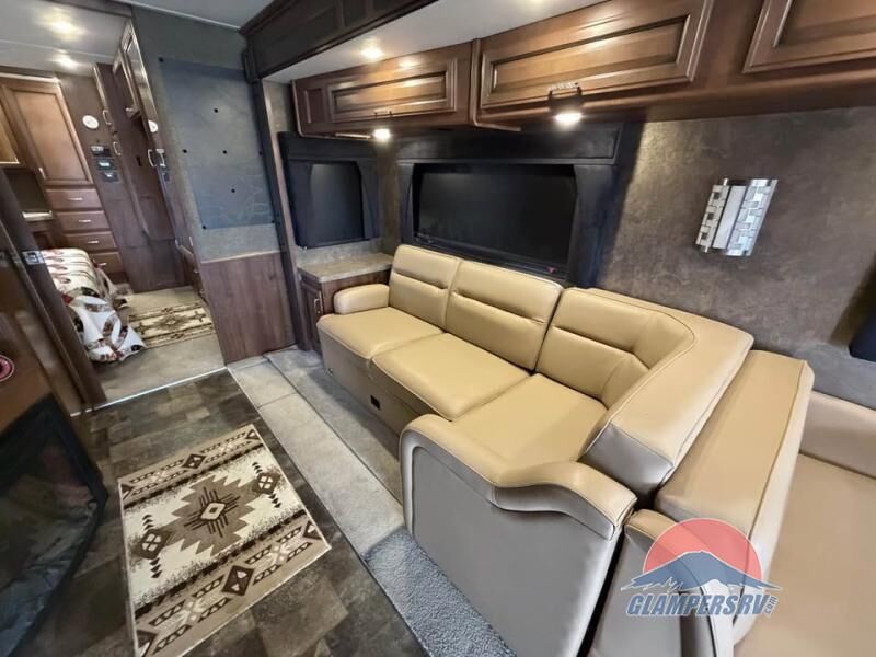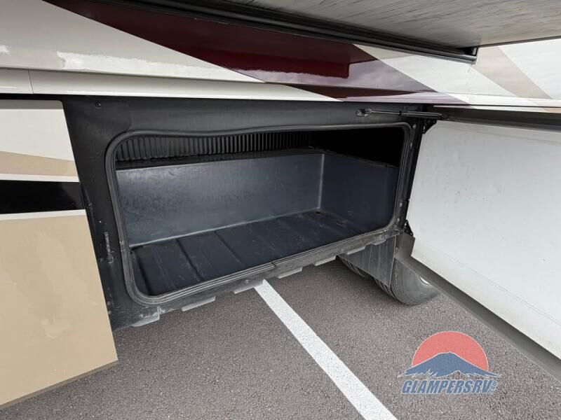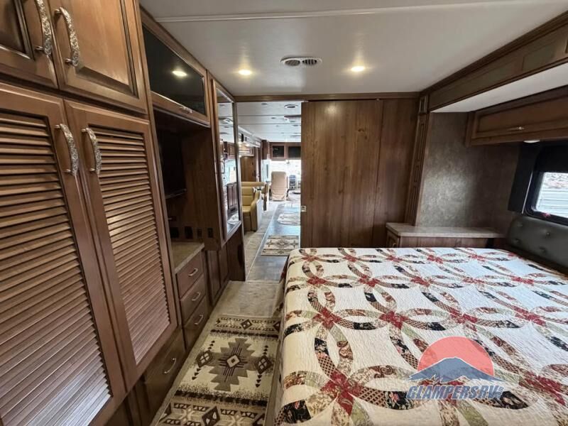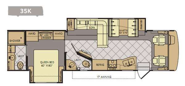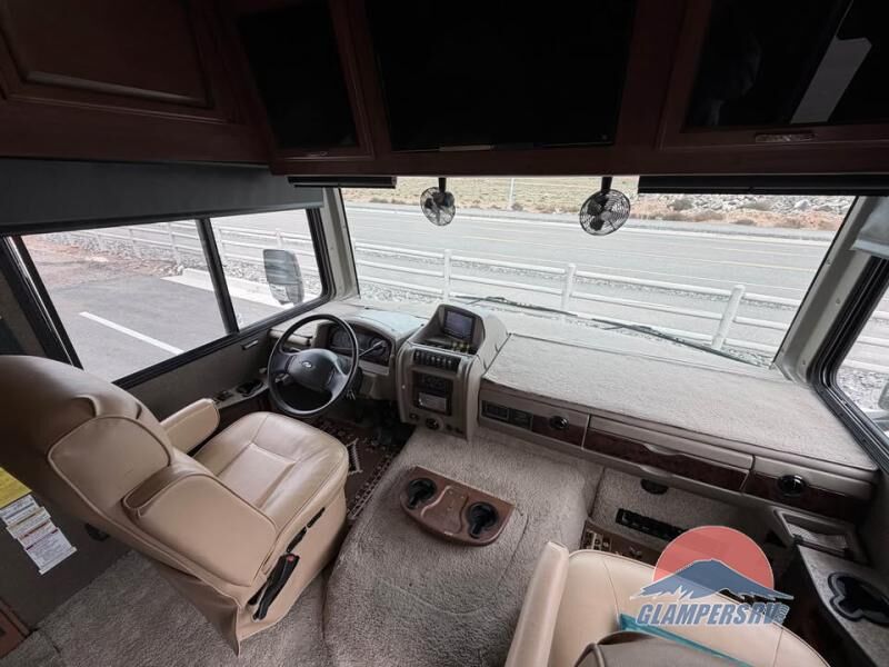There is plenty of storage with all of the overhead cabinets in this motor home. You also have many options available to you such as, a front 32" LCD tv, exterior entertainment center, three burner range with oven, washer and dryer, fireplace, facing dinette, free-standing dinette with credenza.