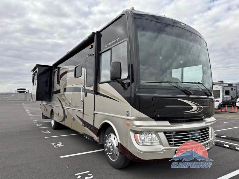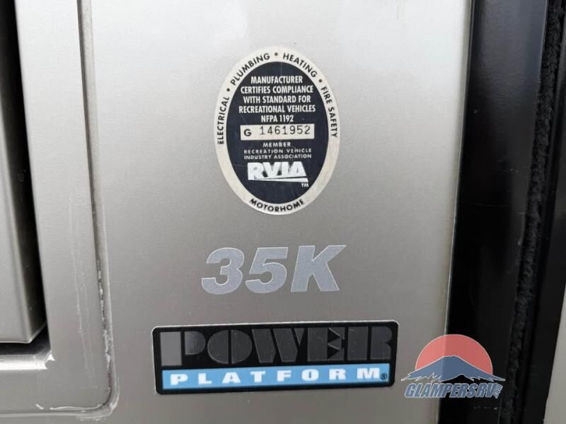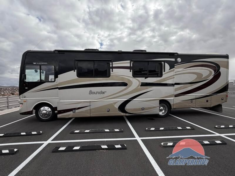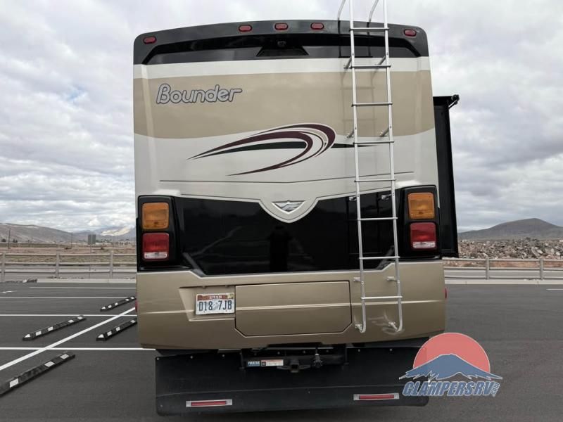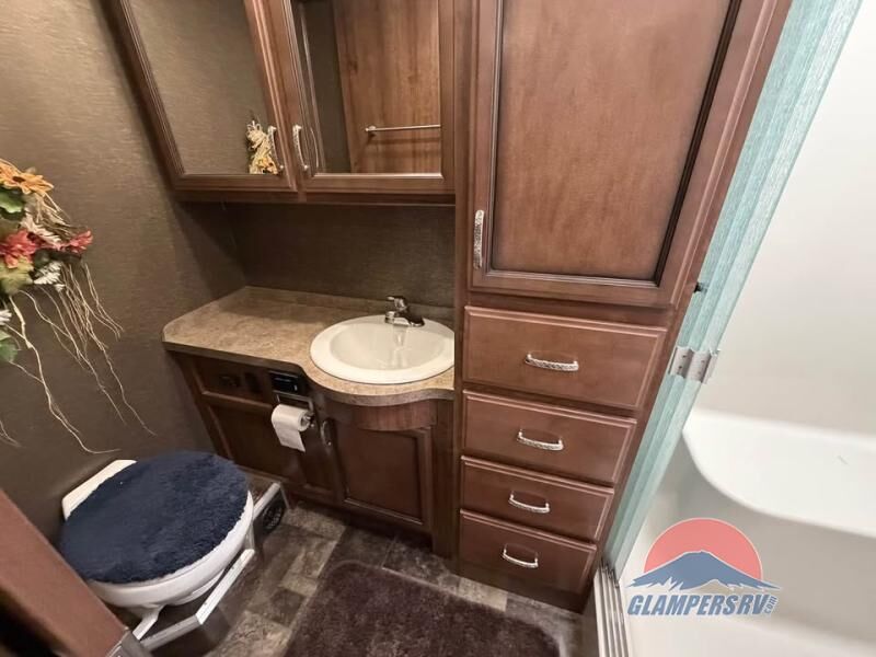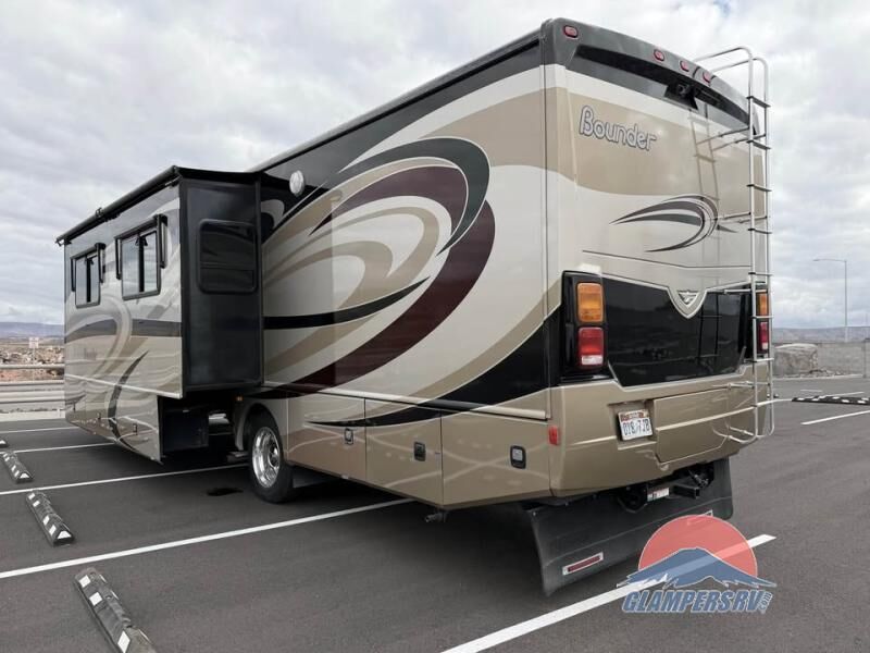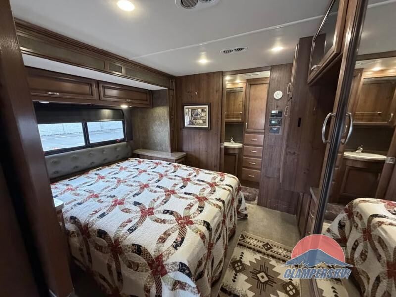 The Bounder 35K Fleetwood motor home features a rear master bathroom as well as convenient half bath. In the rear of the motor home, you will find a toilet, medicine cabinet, sink, linen cabinet, and shower. The bedroom offers a queen size bed and nightstands slide, double wardrobes, a dresser, and a 32" LED tv. As you leave the bedroom, a half bath is located to the right.