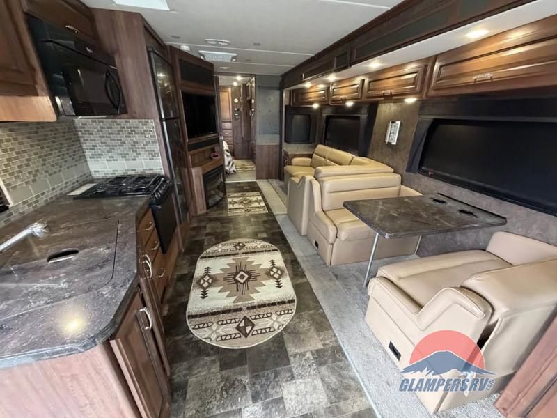 The kitchen and dining areas are combined and offer a 40" LED tv, which can easily be viewed from anywhere in the front of the motor home. One side of the motor home has a refrigerator, three burner range, microwave, and double kitchen sink. The opposite side features a slide with a pantry, dinette, l-sofa, and cabinet.