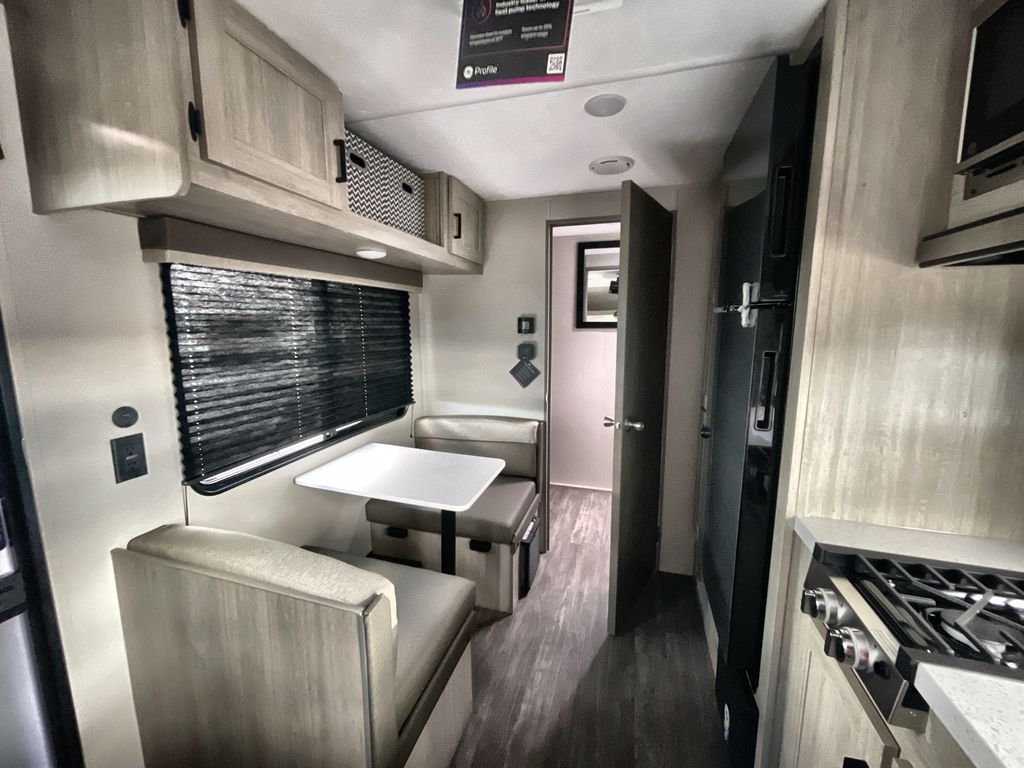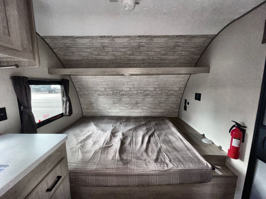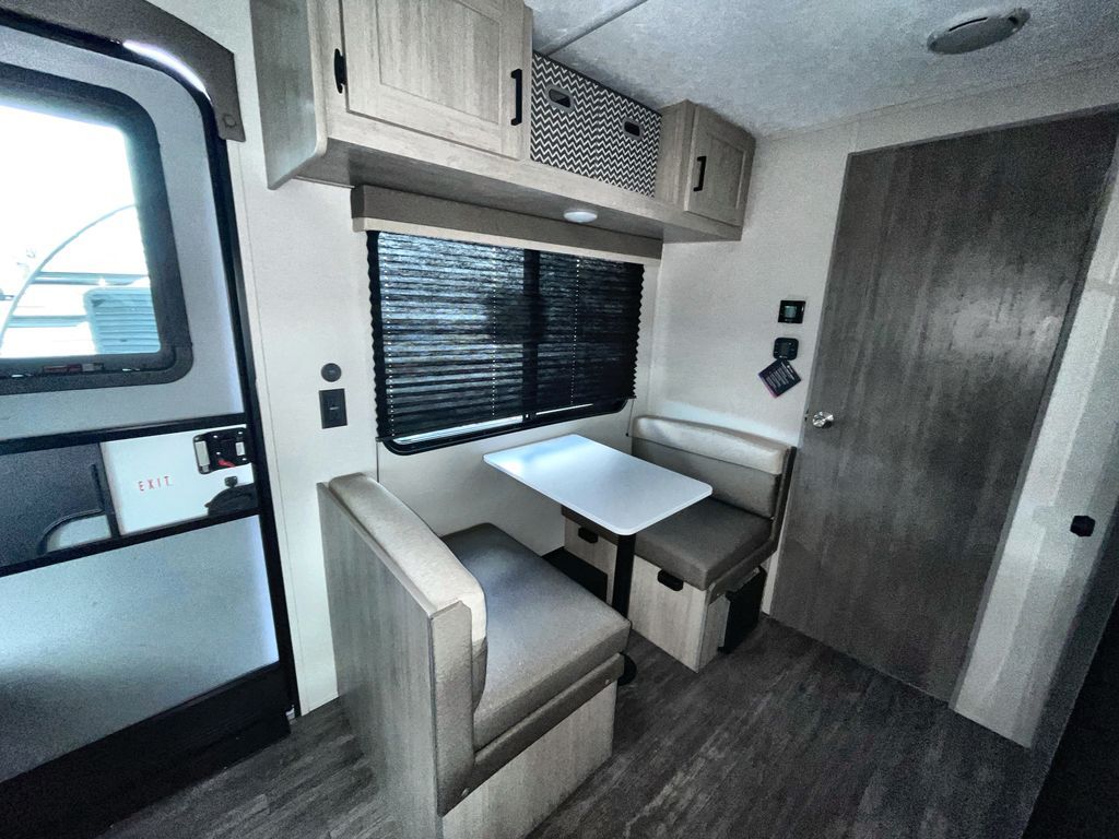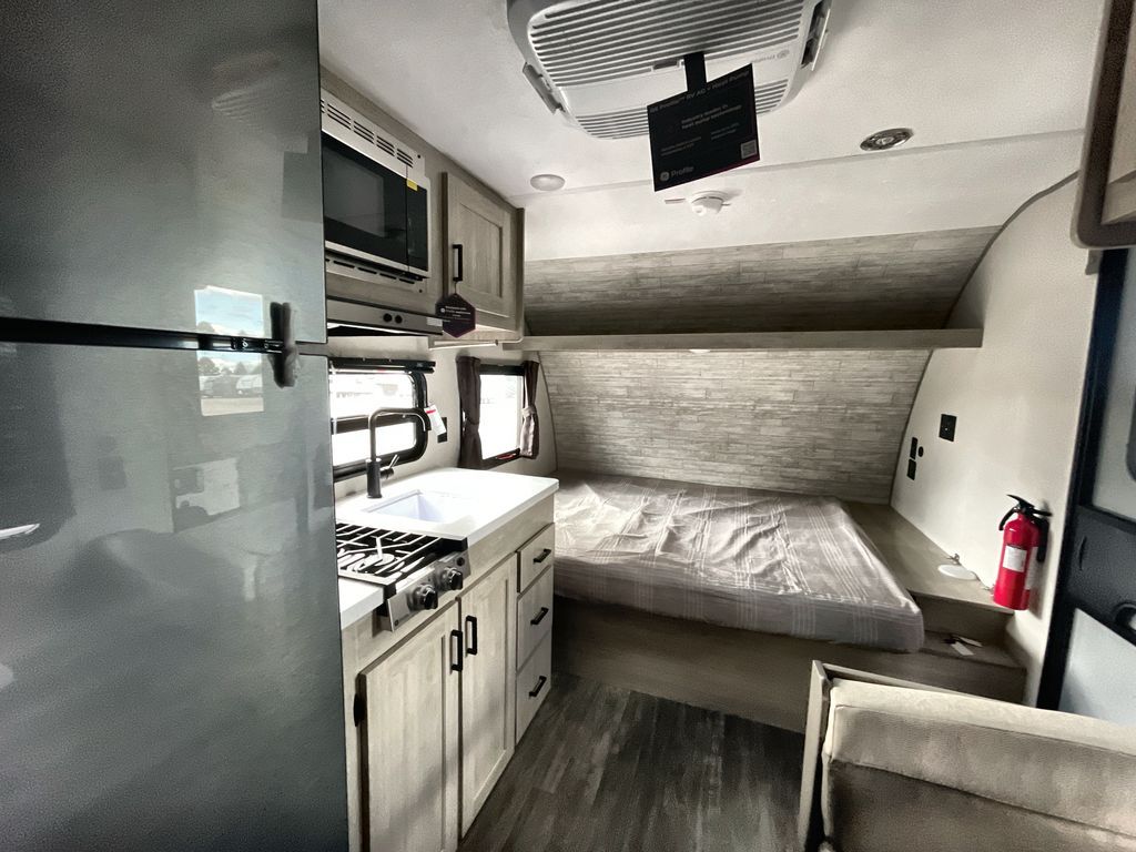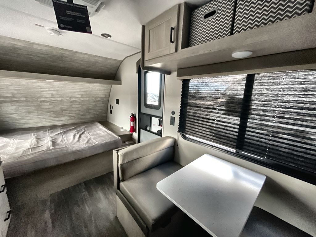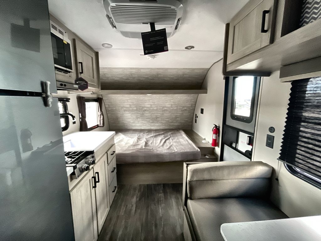 This cozy couples trailer with a queen bed is the perfect travel companion! You will have a queen bed up front to sleep on each night. The booth dinette**,** just to the left of the entry door, is a great place to enjoy meal and your morning cup of coffee! Use the two burner cooktop and microwave oven to create camp meals inside. This model includes plenty of storage space, including a large overhead in front, nightstands on either side of the sofa, a pantry for dry goods and snacks, and a linen cabinet in the rear bath that also offers a 36" x 30" shower, toilet and shelf for towels and such. There is even storage beneath the bar top as well.
