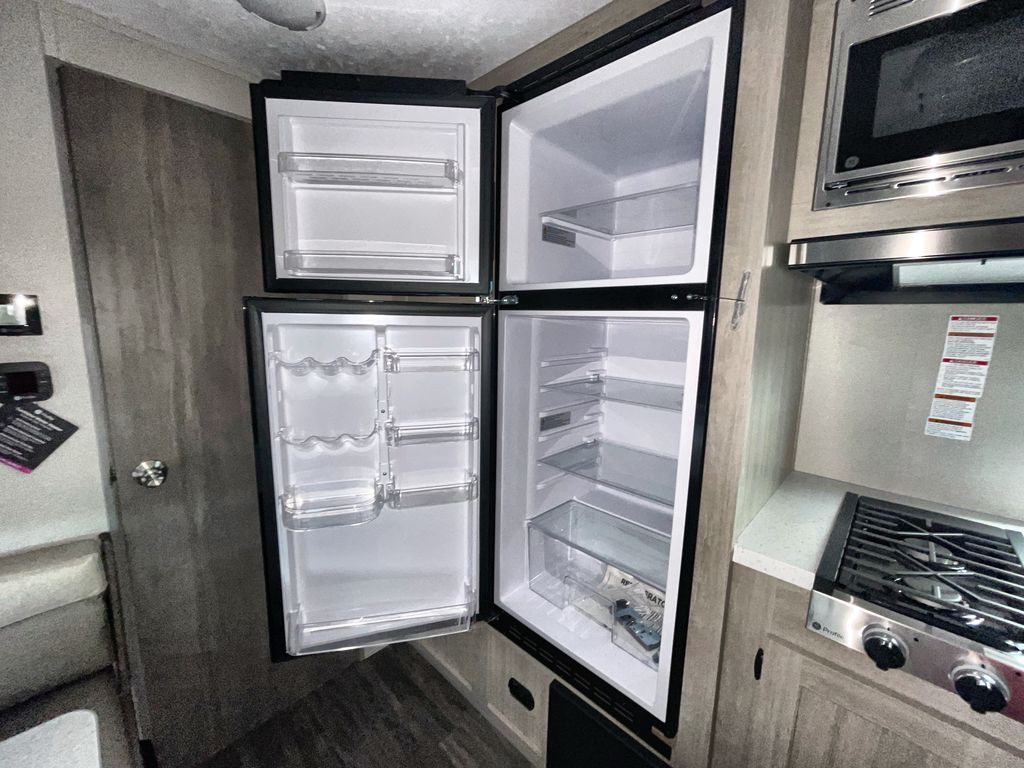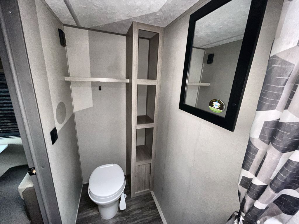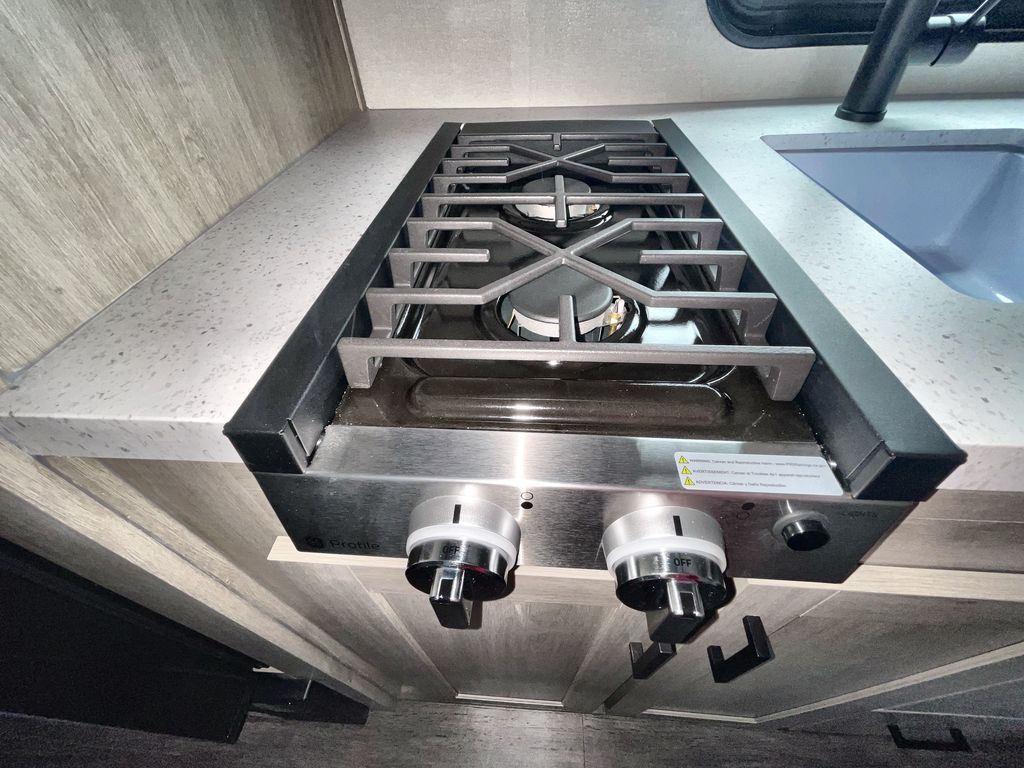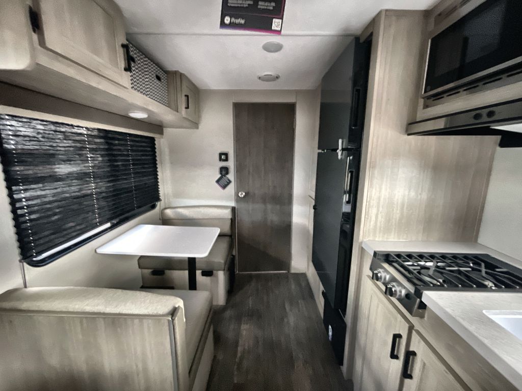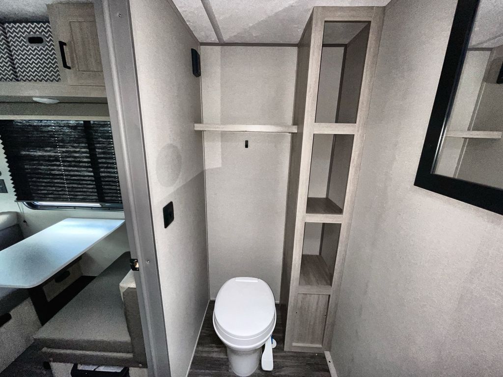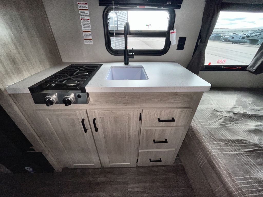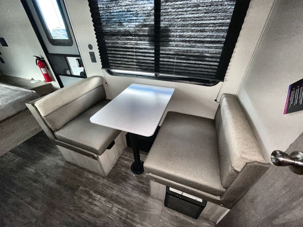 This cozy couples trailer with a queen bed is the perfect travel companion! You will have a queen bed up front to sleep on each night. The booth dinette**,** just to the left of the entry door, is a great place to enjoy meal and your morning cup of coffee! Use the two burner cooktop and microwave oven to create camp meals inside. This model includes plenty of storage space, including a large overhead in front, nightstands on either side of the sofa, a pantry for dry goods and snacks, and a linen cabinet in the rear bath that also offers a 36" x 30" shower, toilet and shelf for towels and such. There is even storage beneath the bar top as well.