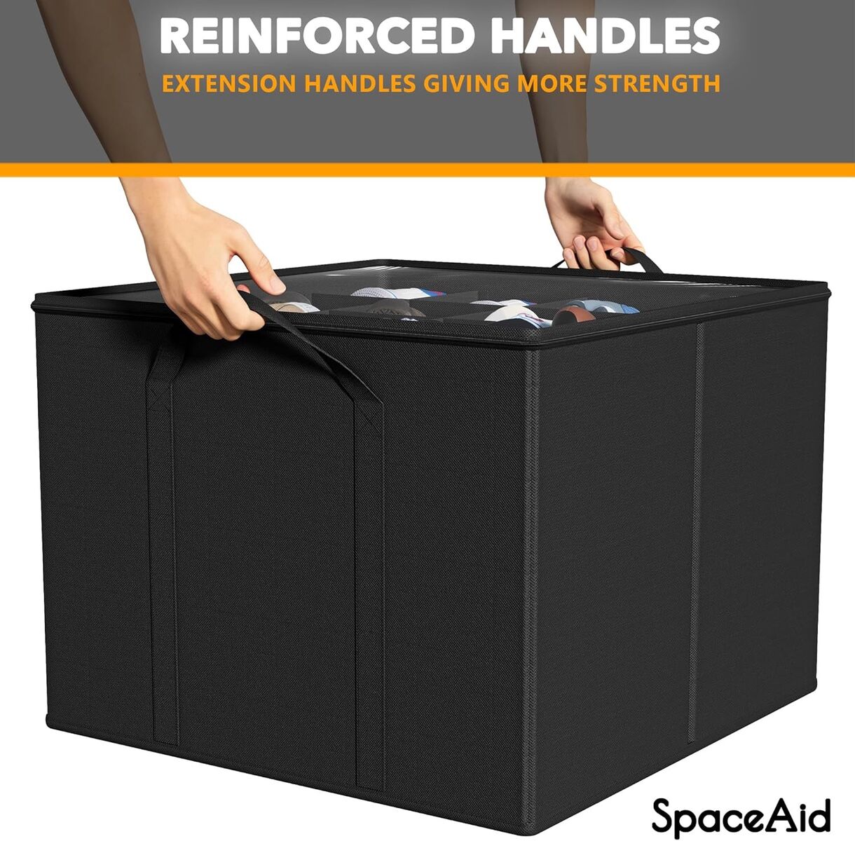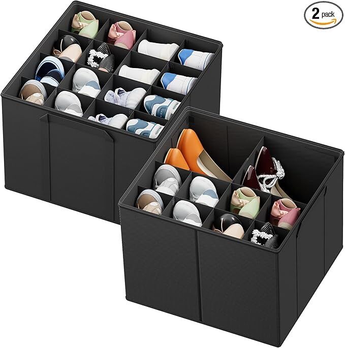 Venmo2 Pack Foldable Shoe Storage Containers Baskets Boxes Bins w/Adjustable Dividers, Fits 16-32 Pairs, Black