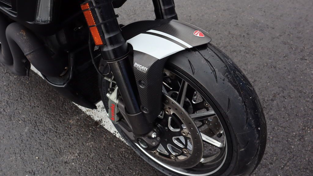 Carbon fiber bodywork and Marchesini forged wheels reduce weight to about 205 kg, sharpening acceleration, braking feel, and overall agility while giving the Diavel its premium Carbon look.