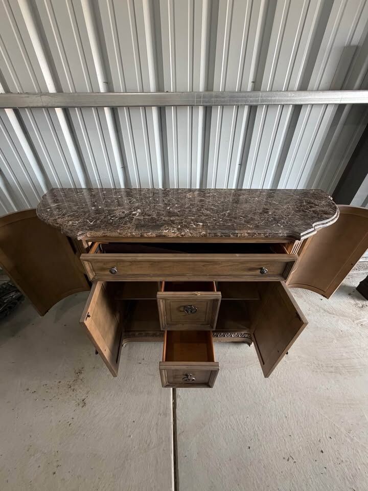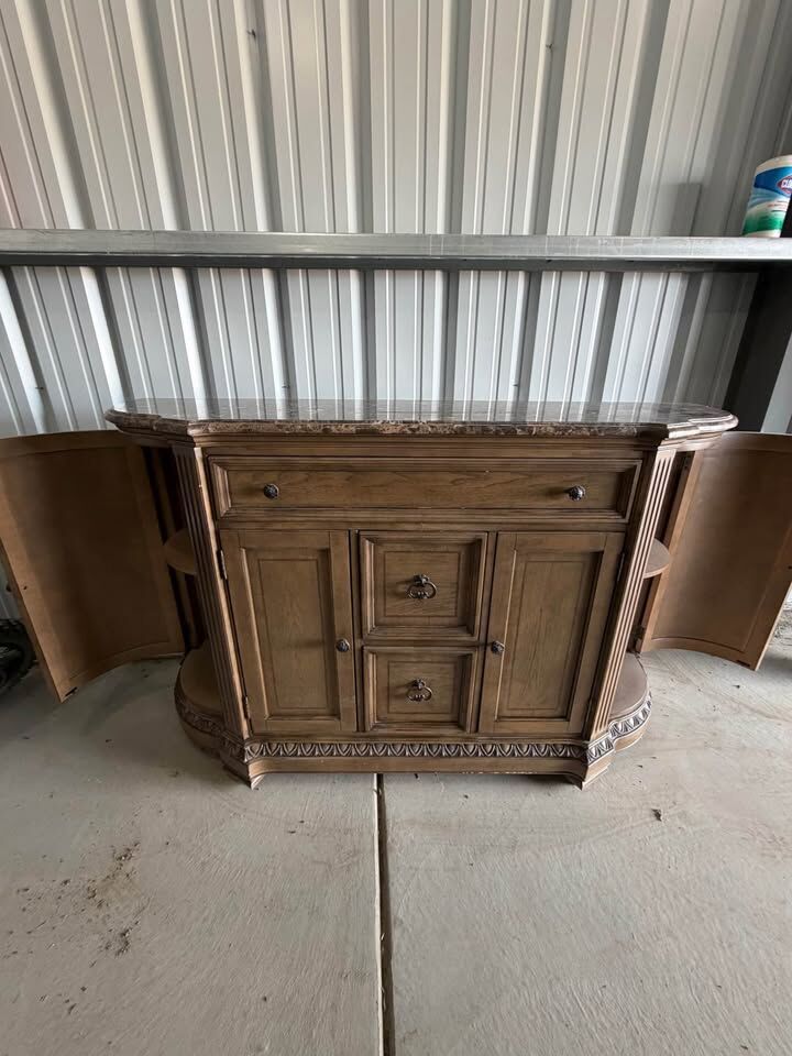 Beautiful wood hutch with a marble top. $500 OBO. Has a lot of storage options. Top drawer has a felt liner, great for silverware or small items. Two more drawers in the middle and two side cabinets with shelves. Good for dining room, living room, or entryway. Right side cabinet is missing one of the two latches but still stays closed with one. There’s a small line of sticky substance on the top but I imagine it wouldn’t be too difficult to clean off. There are some scuffs. But not too noticeable unless looking closely. One of the drawers has some wood coming off as seen in picture. It’s heavy.