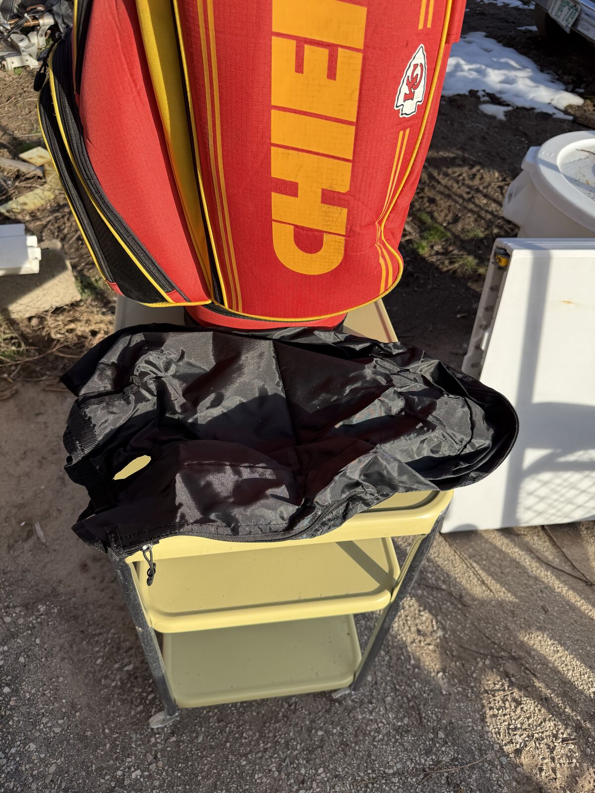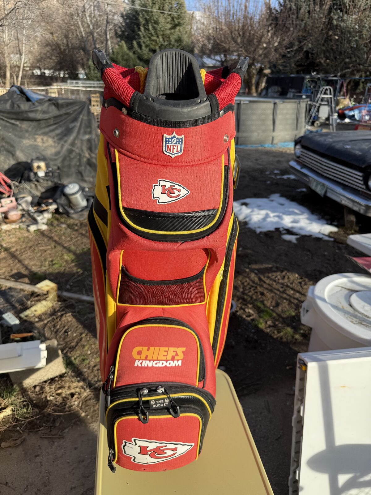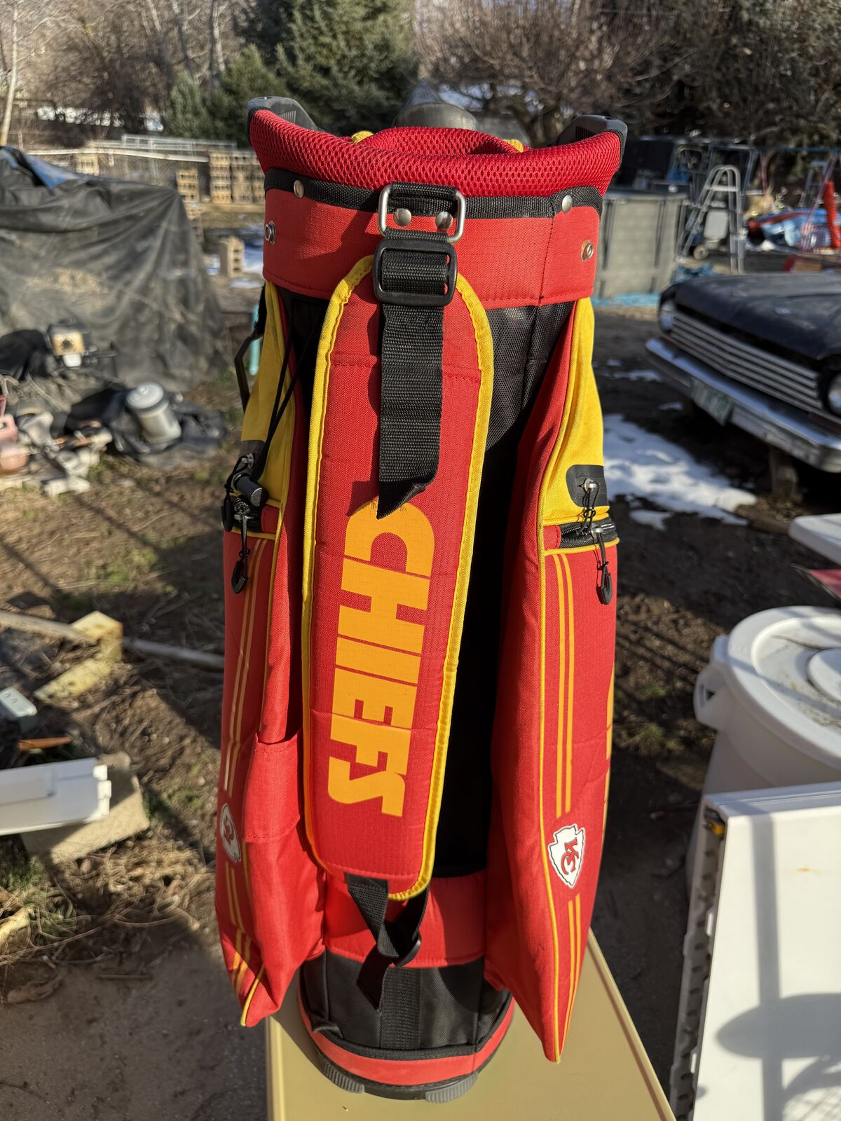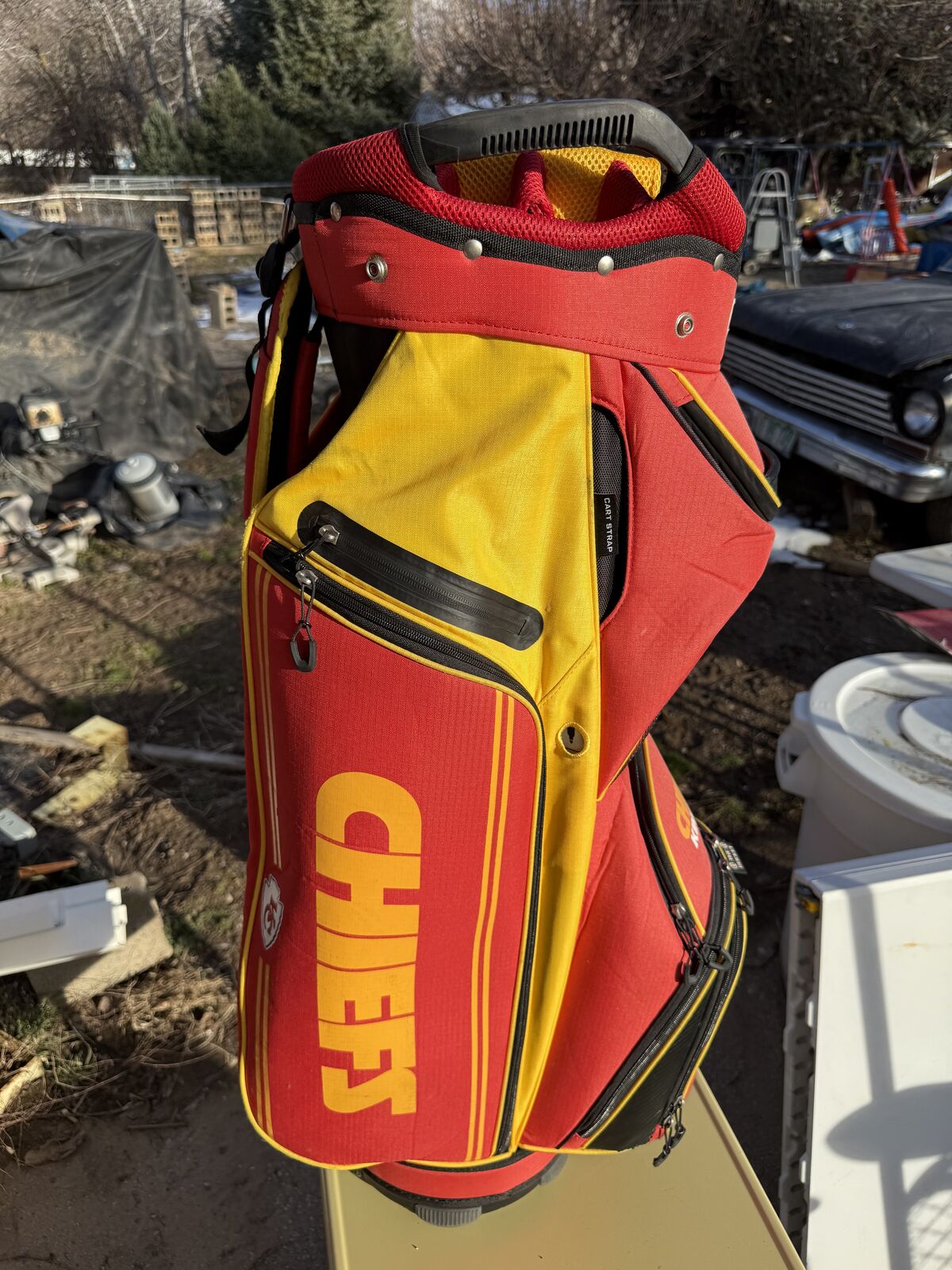 Kansas City Chefs 14 Hole Golf Bag with Shoulder Strap and Rain Cover. Has six Zipper pockets all good Good Condition See Pics
