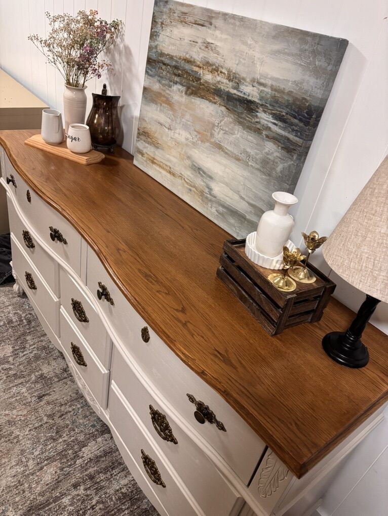 This beautifully refinished dresser features: • A rich stained wood top for warmth and contrast • Soft beige body for that classic cottage charm • Elegant vintage-style hardware • Ornate detailing and curved base for added character • All drawers work well