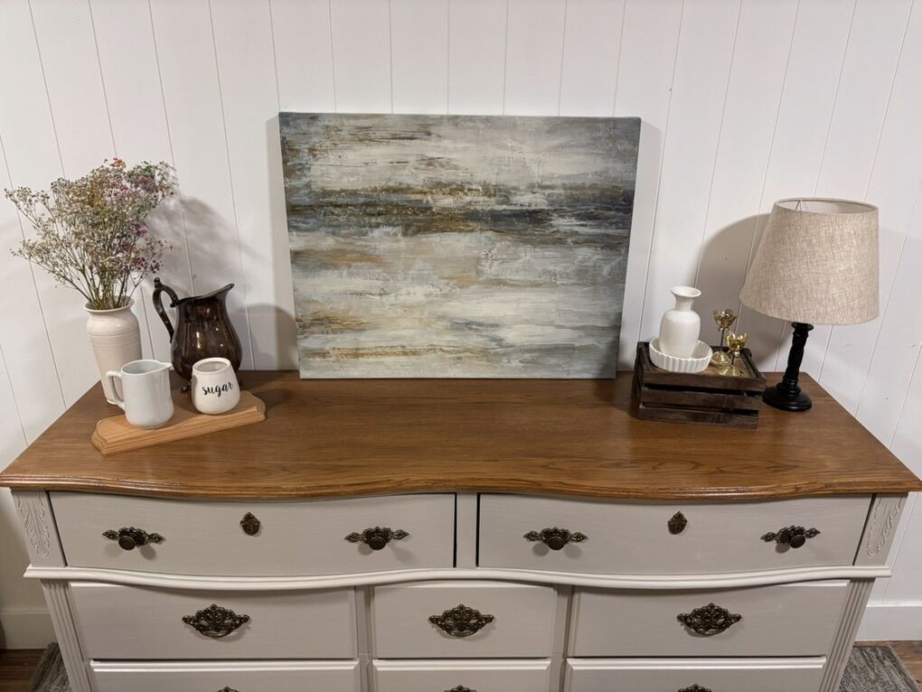 The combination of the warm wood top and creamy beige base gives this dresser an elevated farmhouse feel — refined, graceful, and versatile. It would be stunning in a master bedroom, guest room, or even styled as a statement buffet in a dining space.