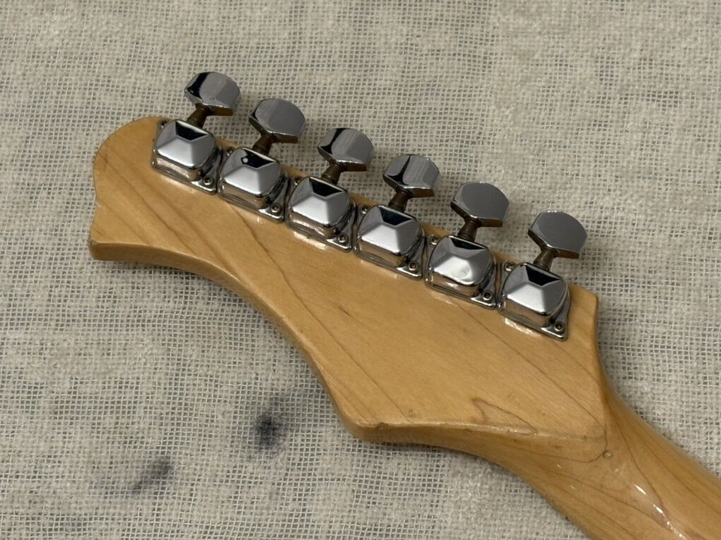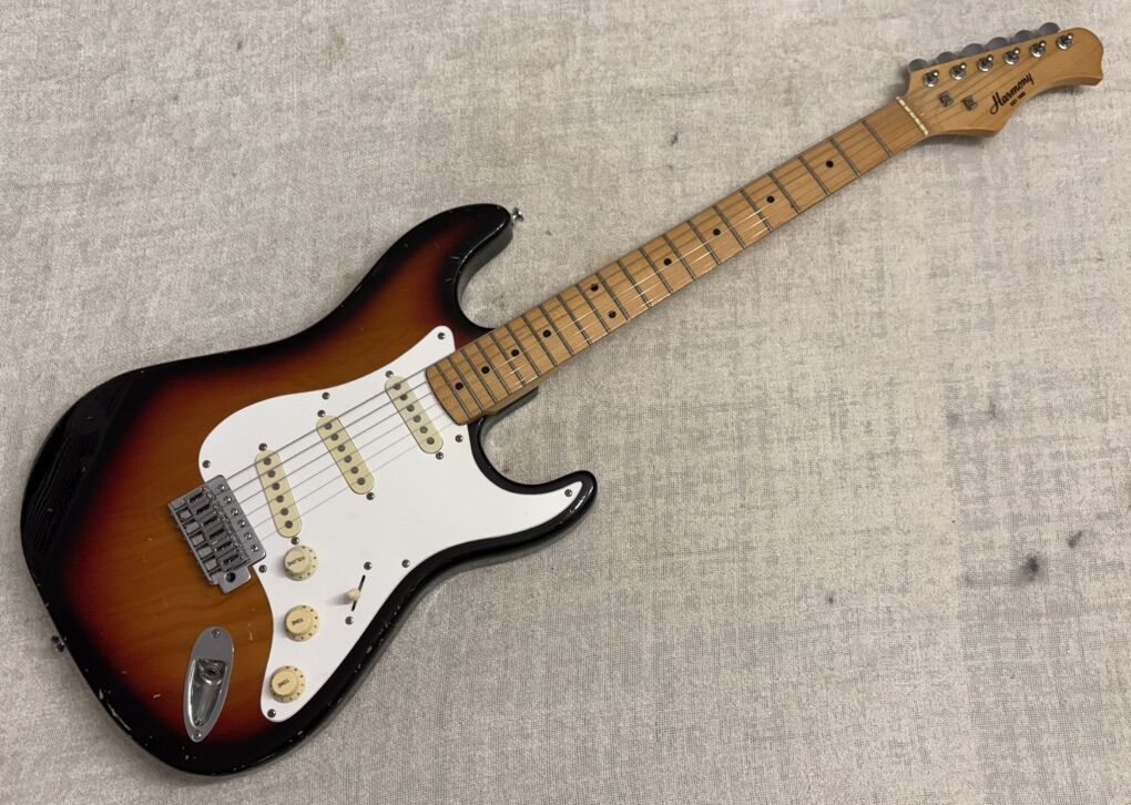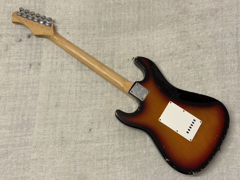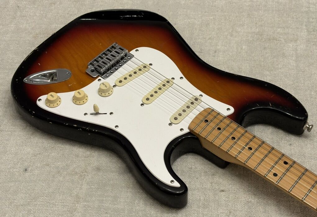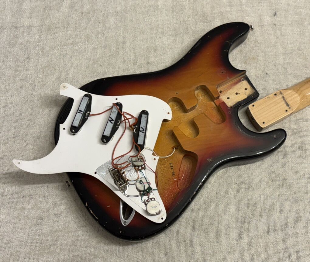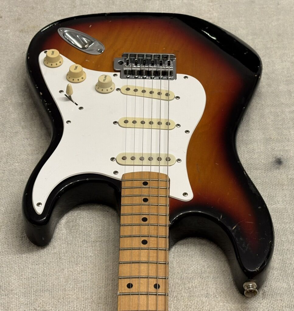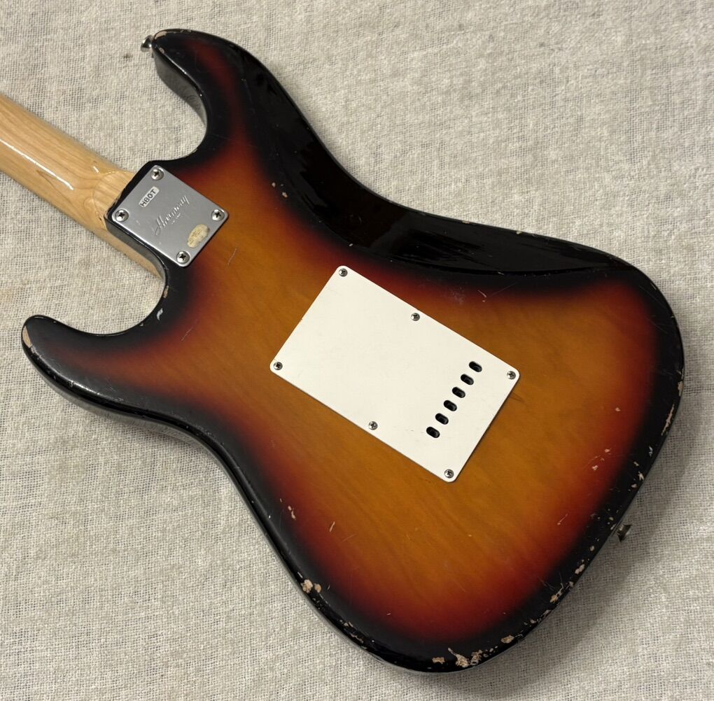 Cool road worn sunburst finish. Plenty of marks and paint chips. All electronics work as they should. Missing tremolo arm.