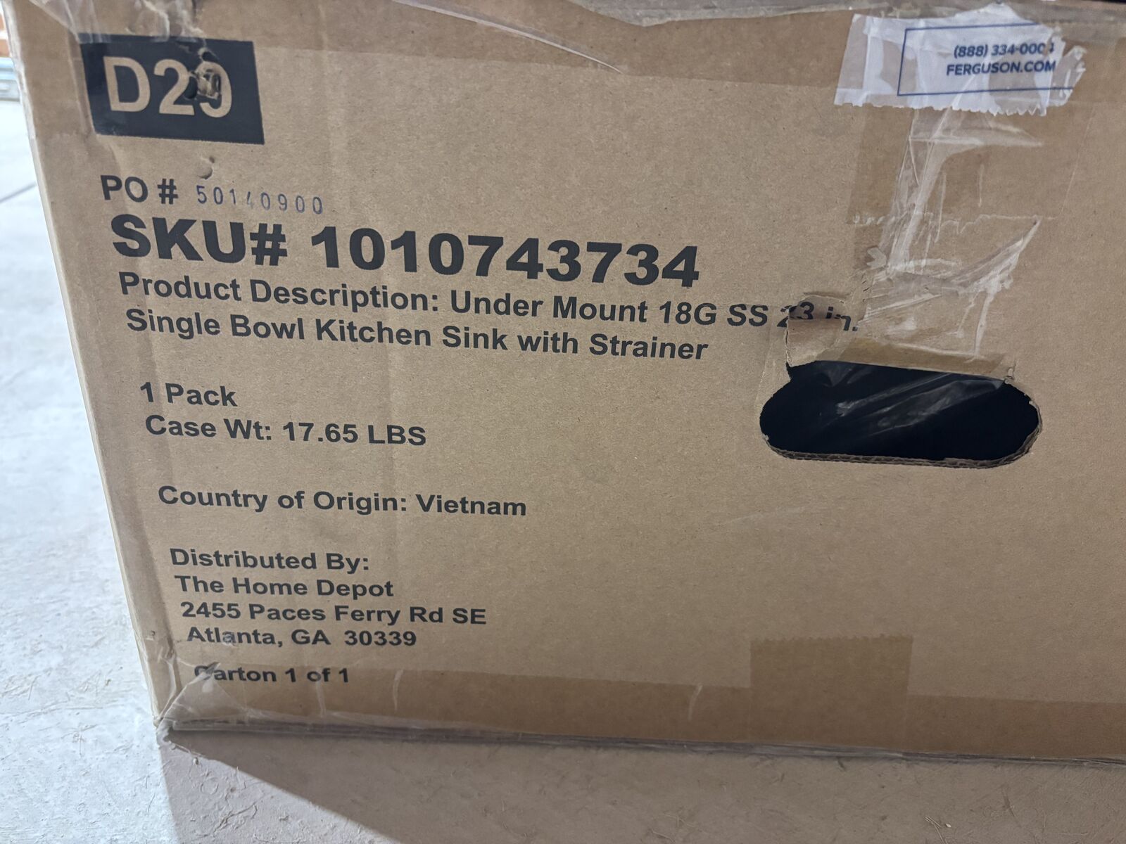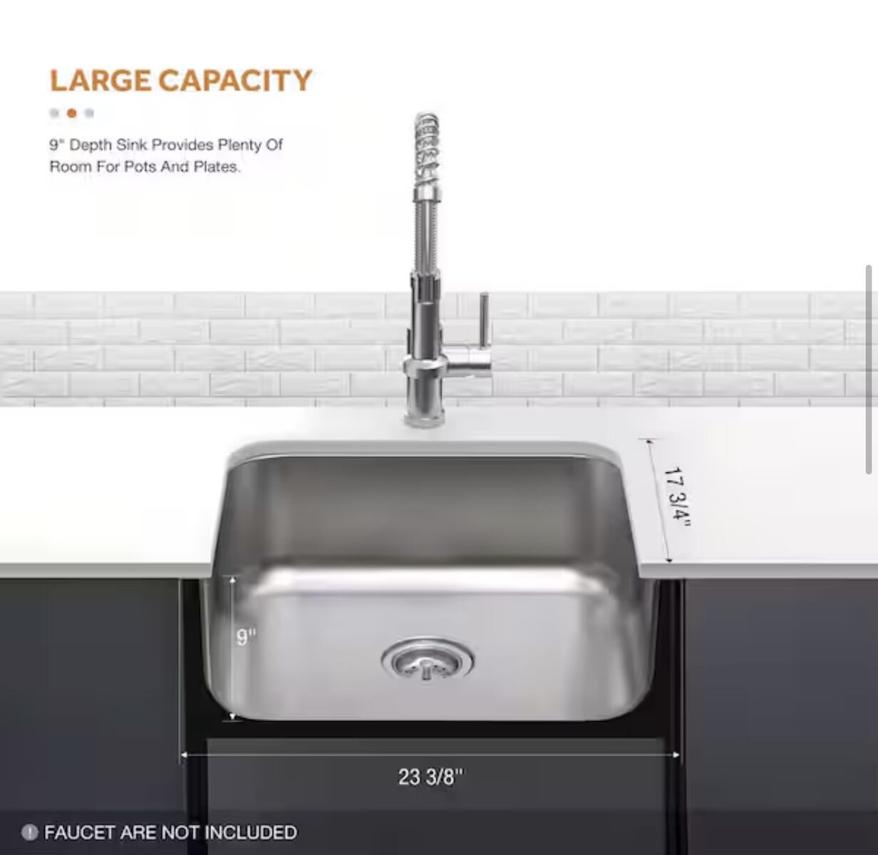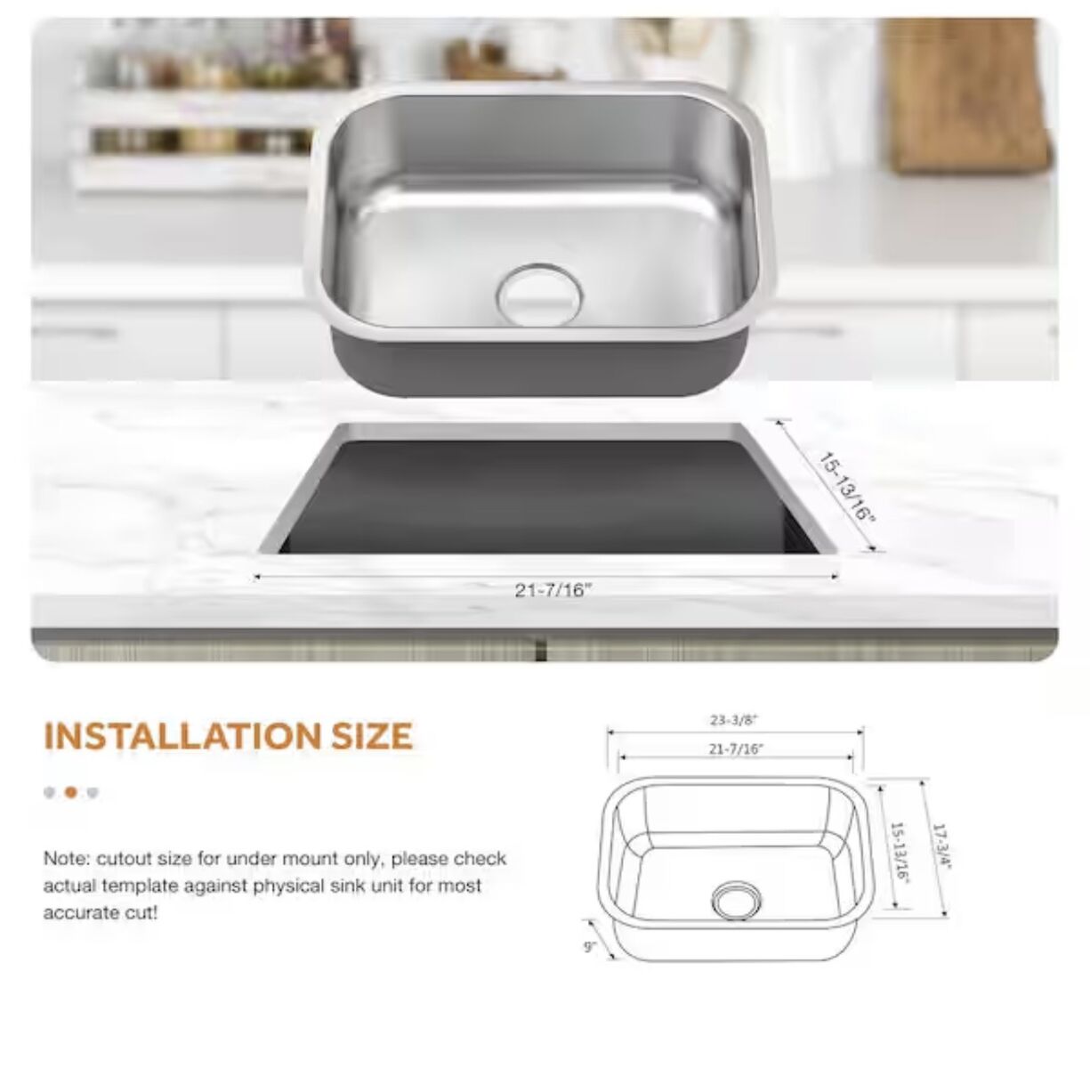 Description- 23” Undermount single-bowl 18-gauge stainless steel kitchen sink. See photos for more product information and specifications.