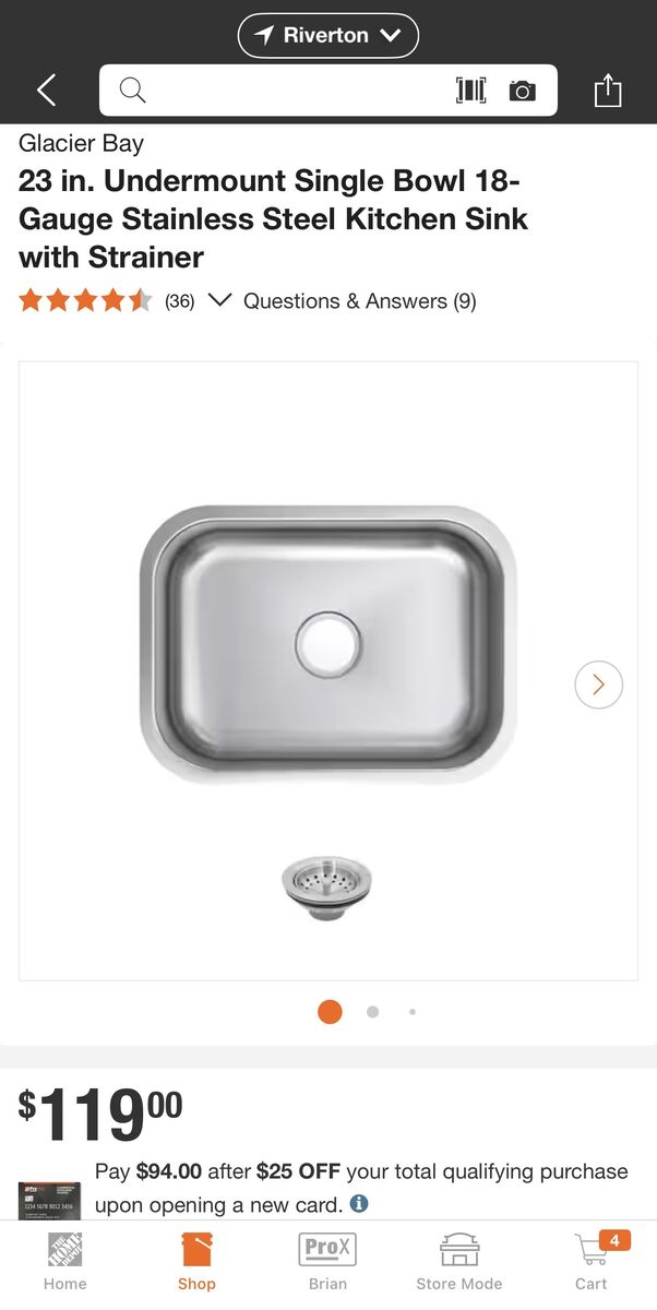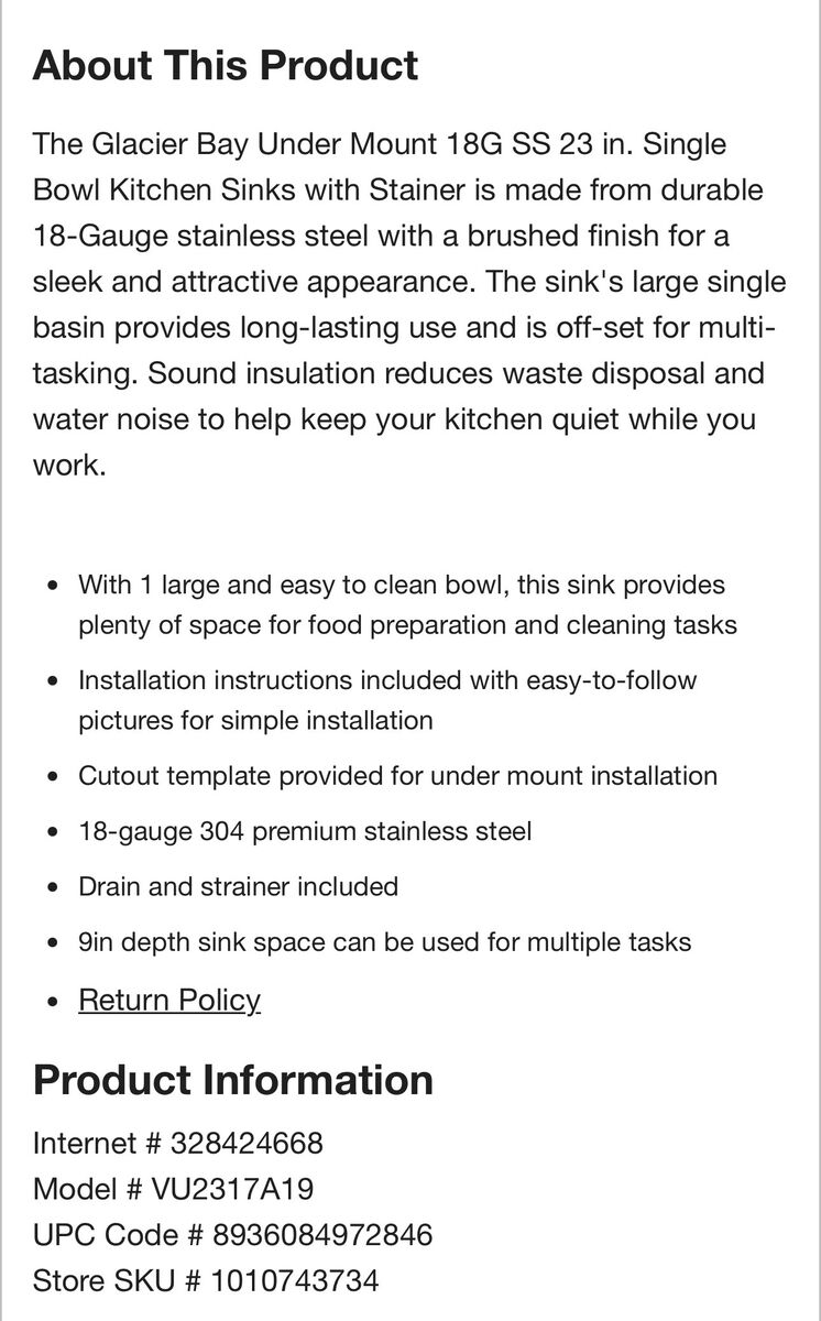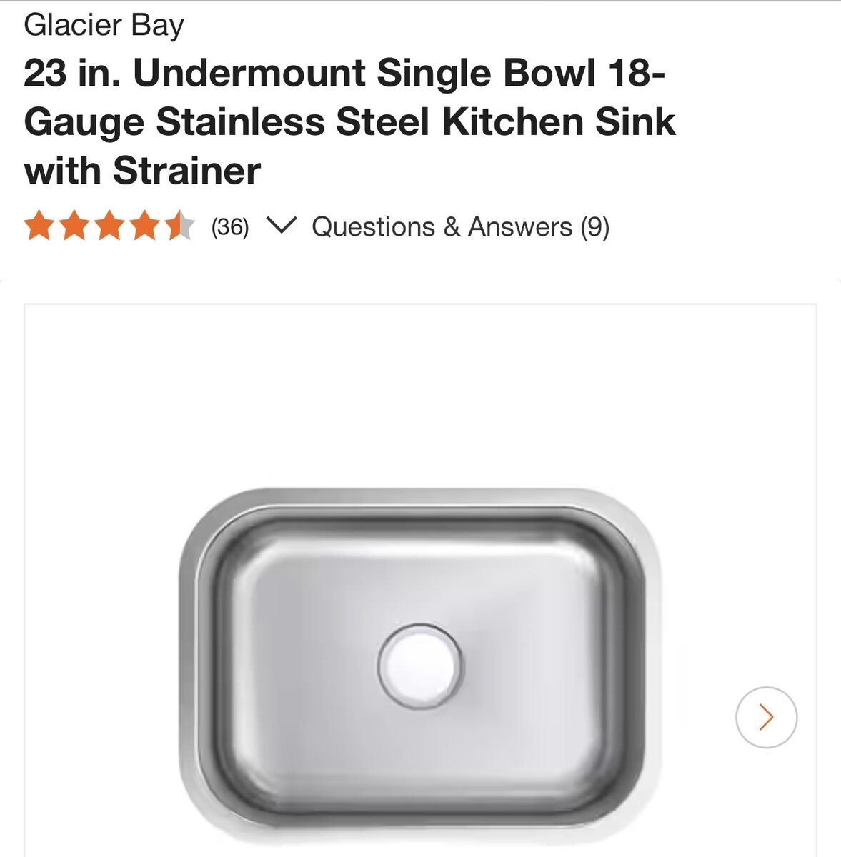 Description- 23” Undermount single-bowl 18-gauge stainless steel kitchen sink. See photos for more product information and specifications.