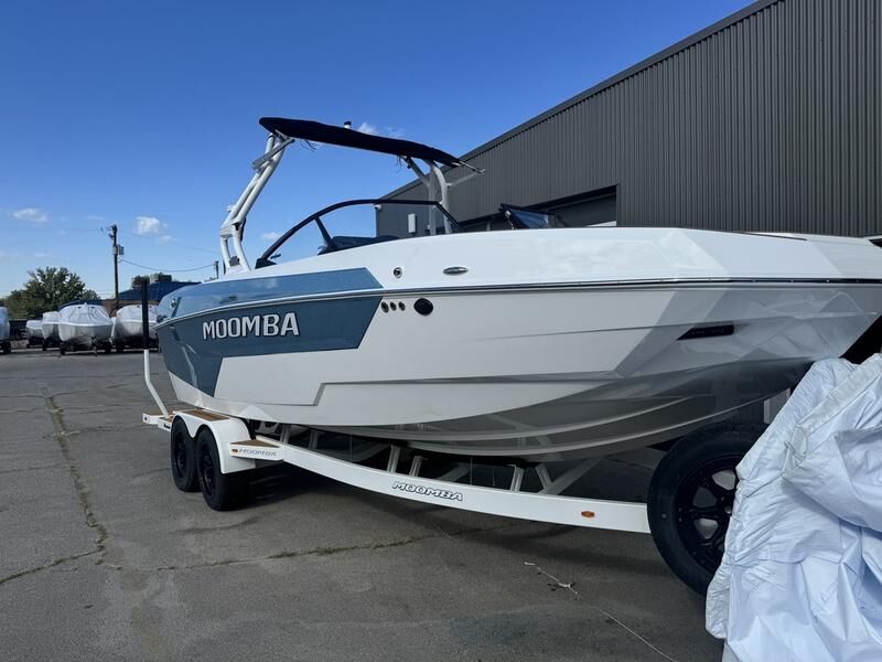 Moomba Tykon with Raptor 450 engine. Flow 3.0 surf system, onboard air station, bimini, surf exhaust pipe, tandem axle Boatmate trailer.