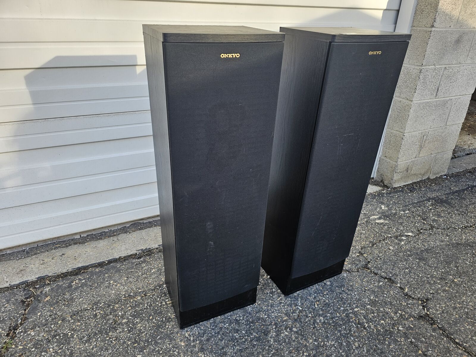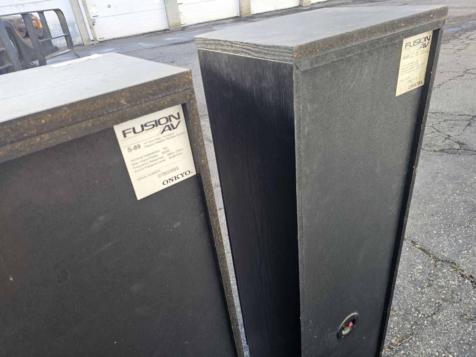 Here are a set of Onkyo Fusion AV floor standing speakers. They have been used in a garage and have some dings from being moved around.