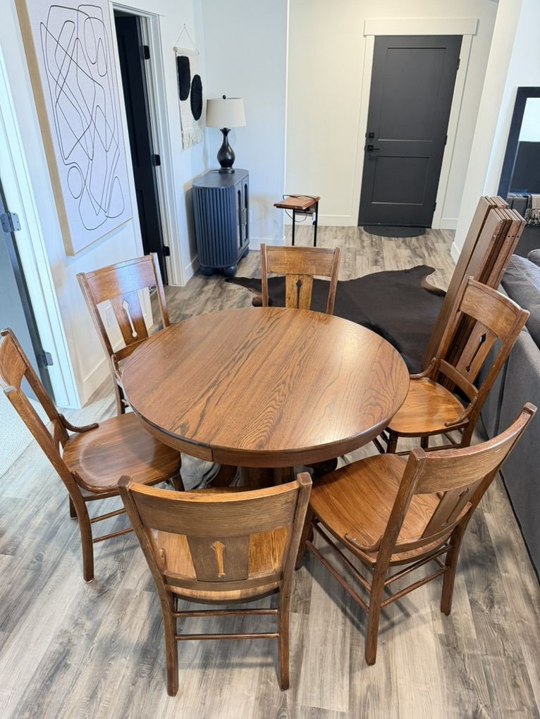 Sturdy table, all hardwood. Start as a small round table for four, but can expand to up to 10-12 people. This is a great piece! Great for people who entertain large family event, but don’t want to have a large table in their home all the time. Be ready to buy and pick up this week