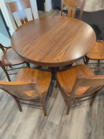 VenmoSOLID WOOD. Antique dining table with ability to expand. at its smallest it is 44” diameter (w/o extenders) 28 1/4 height. Includes 11 expansion pieces, each are 9” wide. Includes six chairs.
