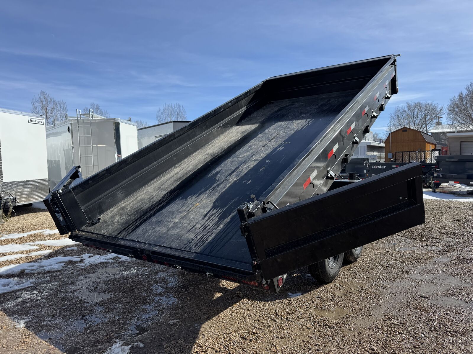 Our deckover dumps offer a raised deck (above the tires) to accommodate 10 gauge fold down sides and a bed width of 96”. Available in gooseneck or bumper pull models, each deckover is equipped standard with 10” I beam frame and neck with a 12” riser on gooseneck models. 3” channel crossmembers span the 10 gauge smooth steel floor. 2 5/16” couplers are equipped standard on each model, with a10k drop leg jack and locking pump box to secure the trailer components. A standard scissor hoist with 520 cylinder lifts this unit to a near 45 degree dump angle - and the retractable tarp system ensures your cargo will stay in your load and off the road.Three-way gate functionality gives you the flexibility to have a spreader gate, barn door gate, or truck style tailgate on your trailer.