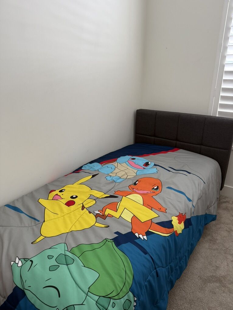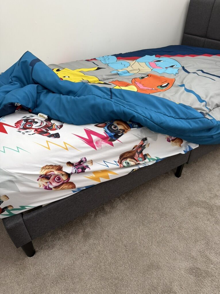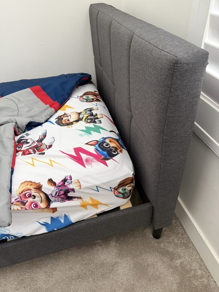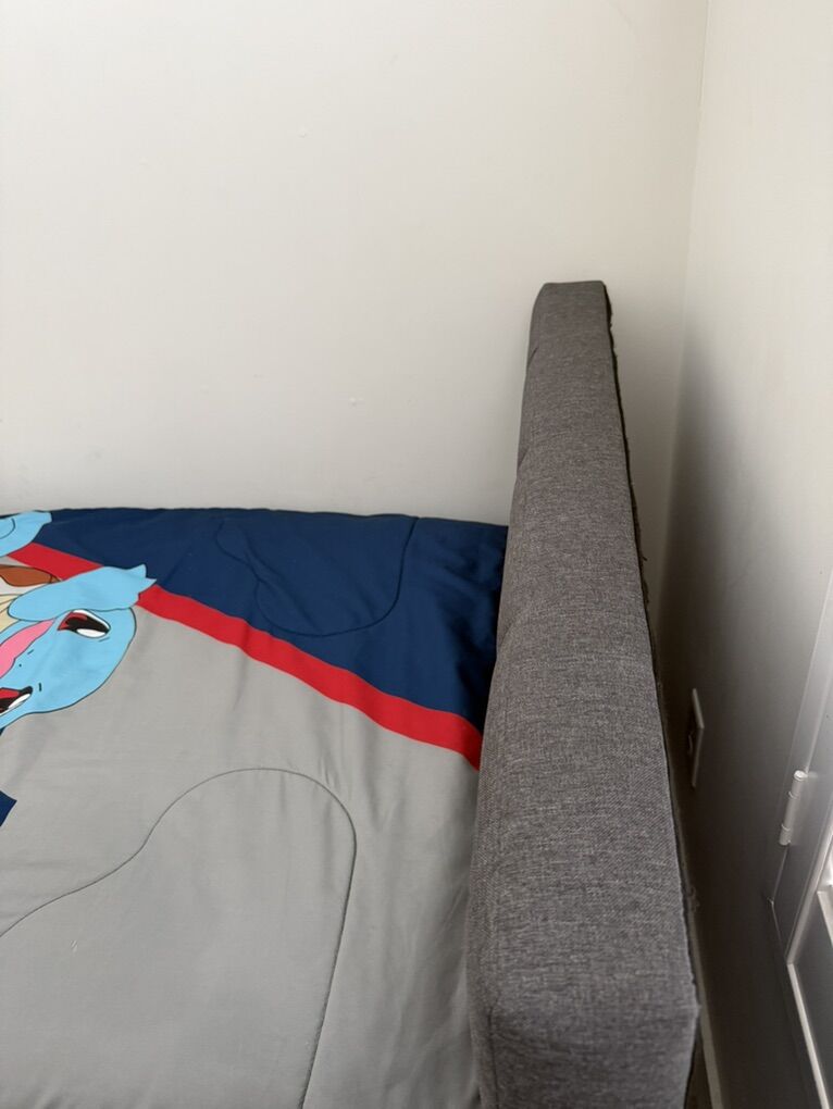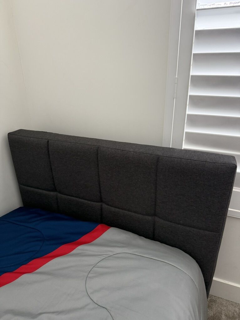 Twin bed frame. Dark grey in color. Material is a fabric material. Originally bought off of wayfair. My son is getting a new bed and no longer need this bed frame.