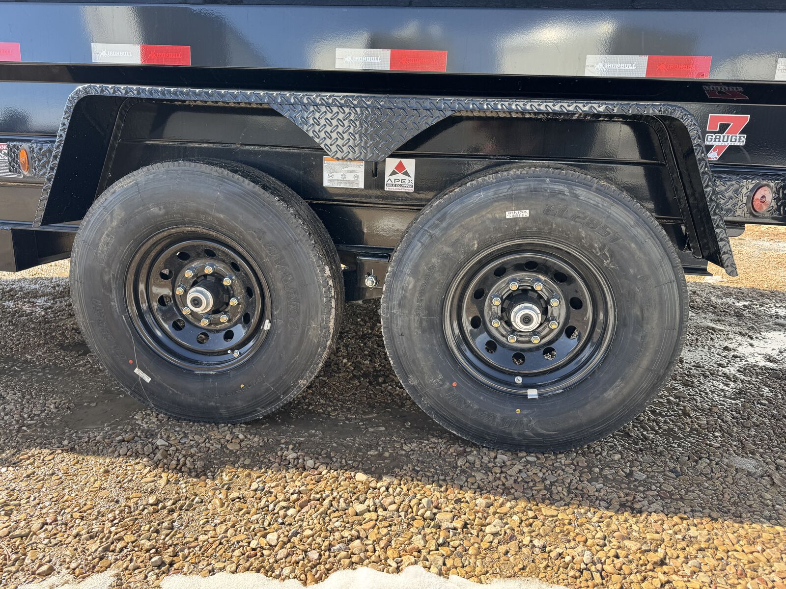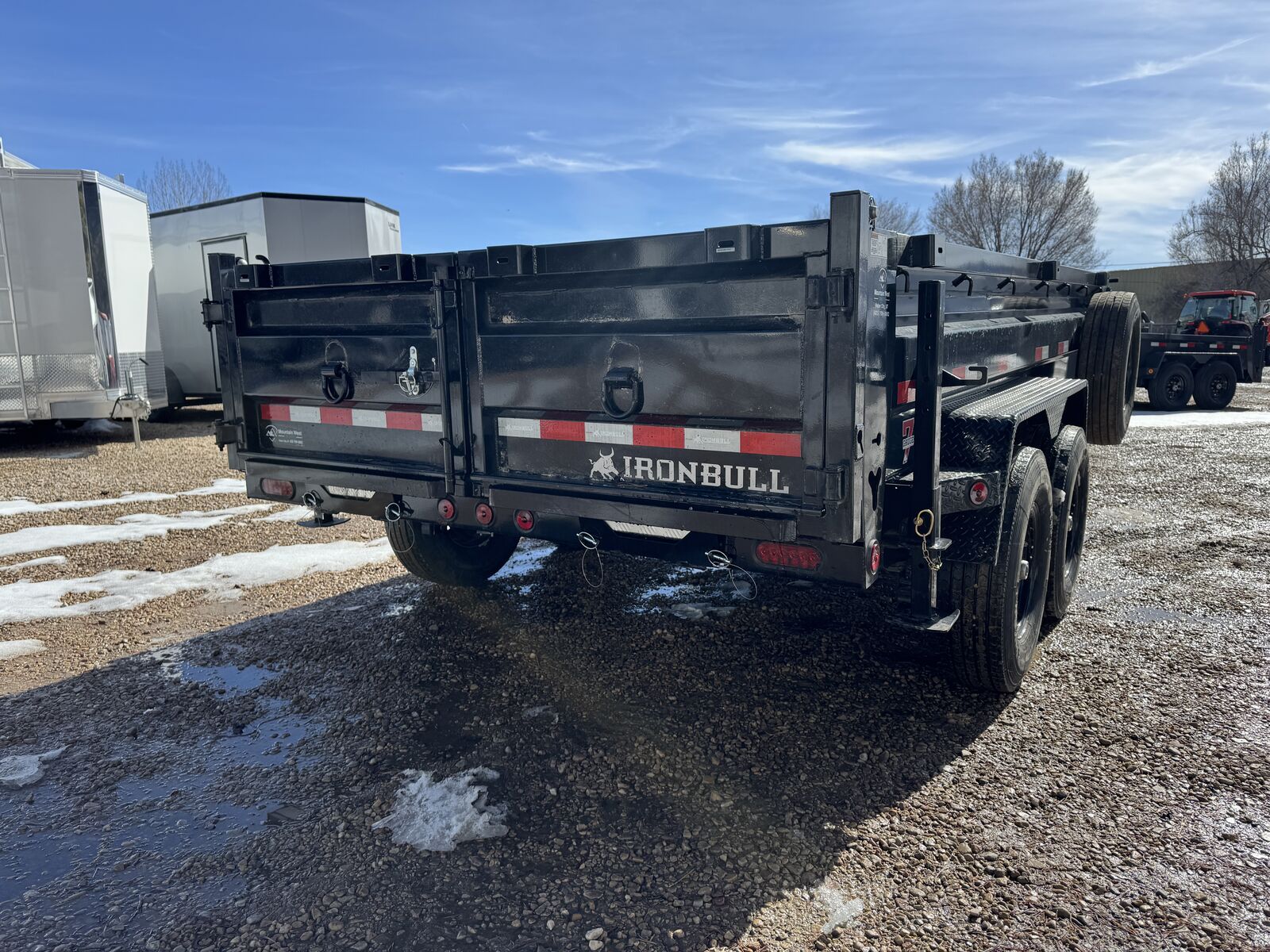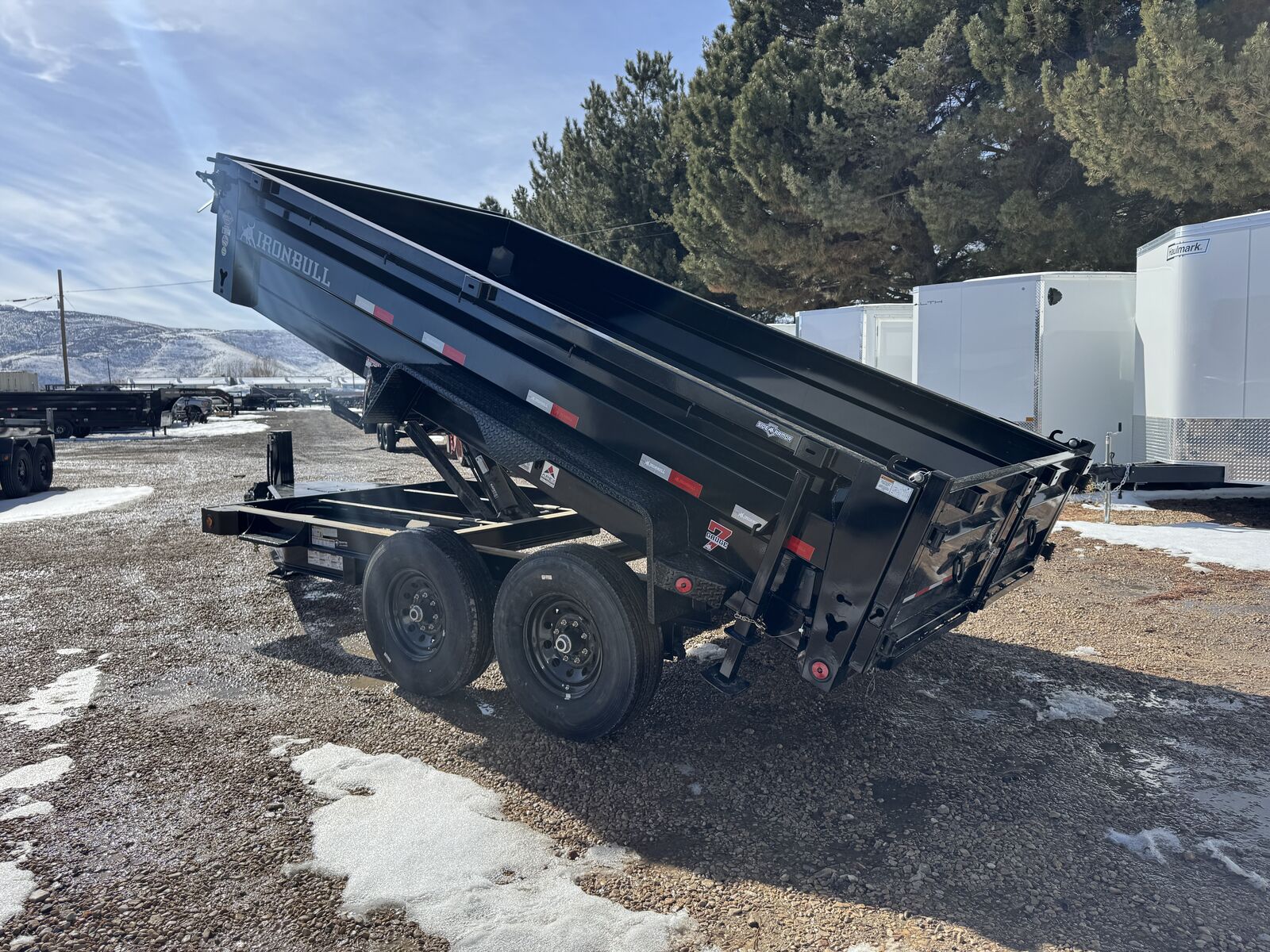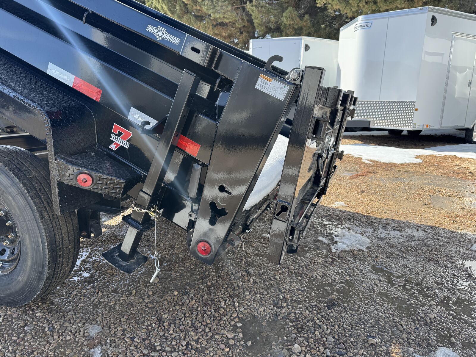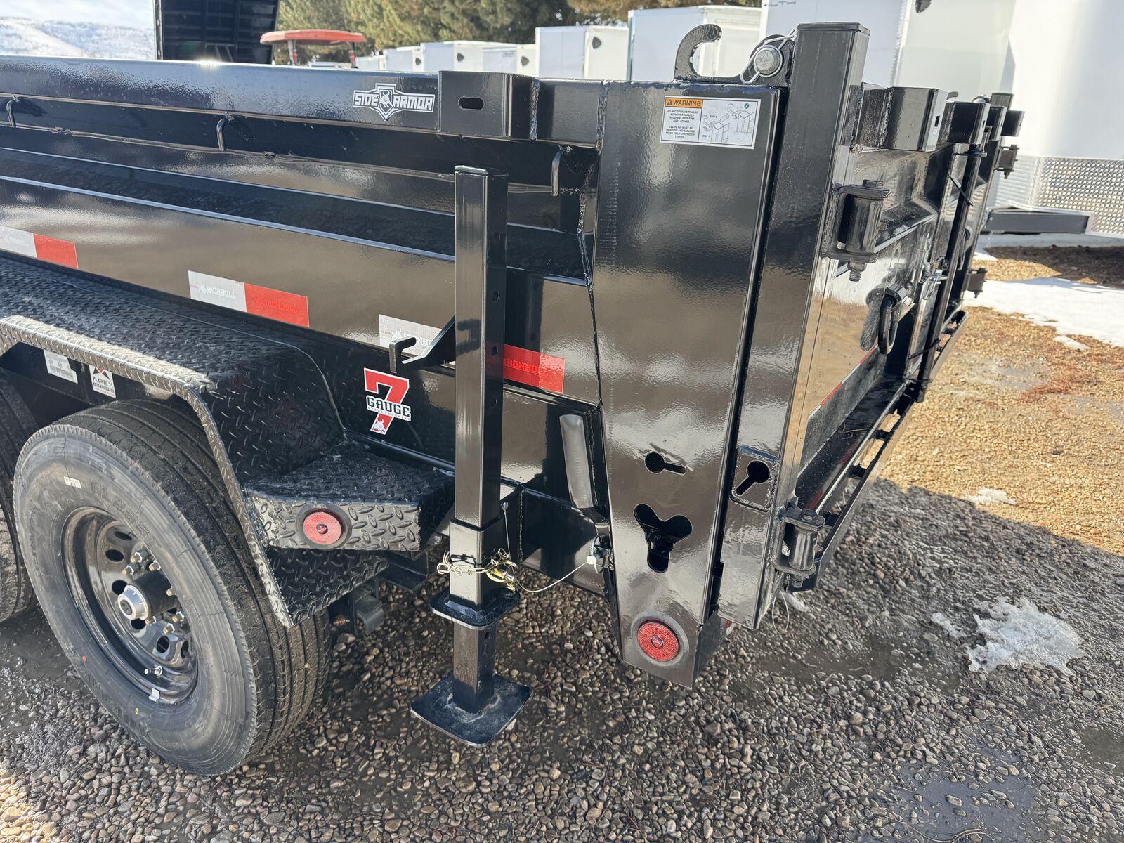 The new ramp system eliminates traditional ramp door flaps. Standard features include 7-gauge flooring, an oversized front toolbox, and a refreshed dump box side-step with a gate pin and ramp lanyards. The rear gate latching system is now inside the corner post for better protection. New features include a stylized diamond plate fender and a revised jack mounting system. Corrosion-resistant tarp hardware has been added. These tough Iron Bull dump trailers, built for 14,000-21,000 lbs GVWR, have a 7-gauge floor and 24" high, 10-gauge sides. Unique features include full-length bed runners, 10k jacks, and a three-way gate. Top components, brake axles, radial tires, and a durable finish ensure reliability. Hydraulic cylinders provide lifting power, and additional features include lifetime LEDs and a deep cycle battery.