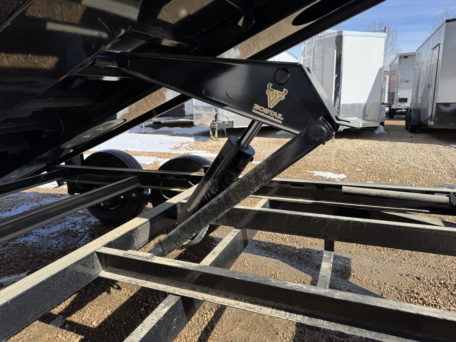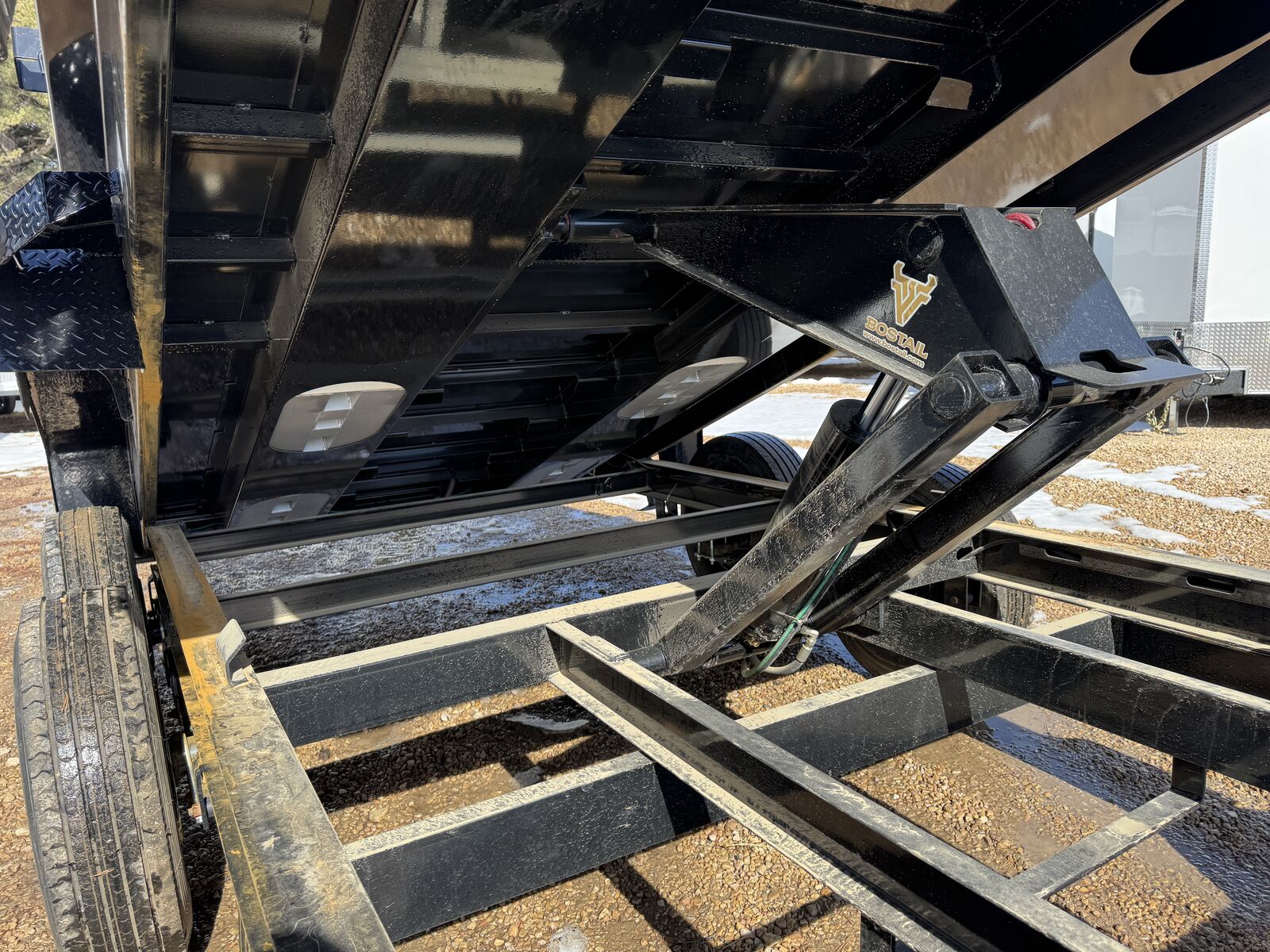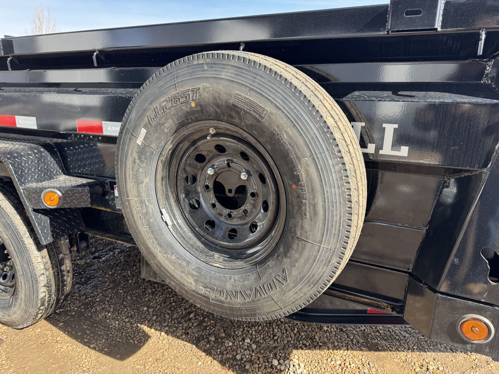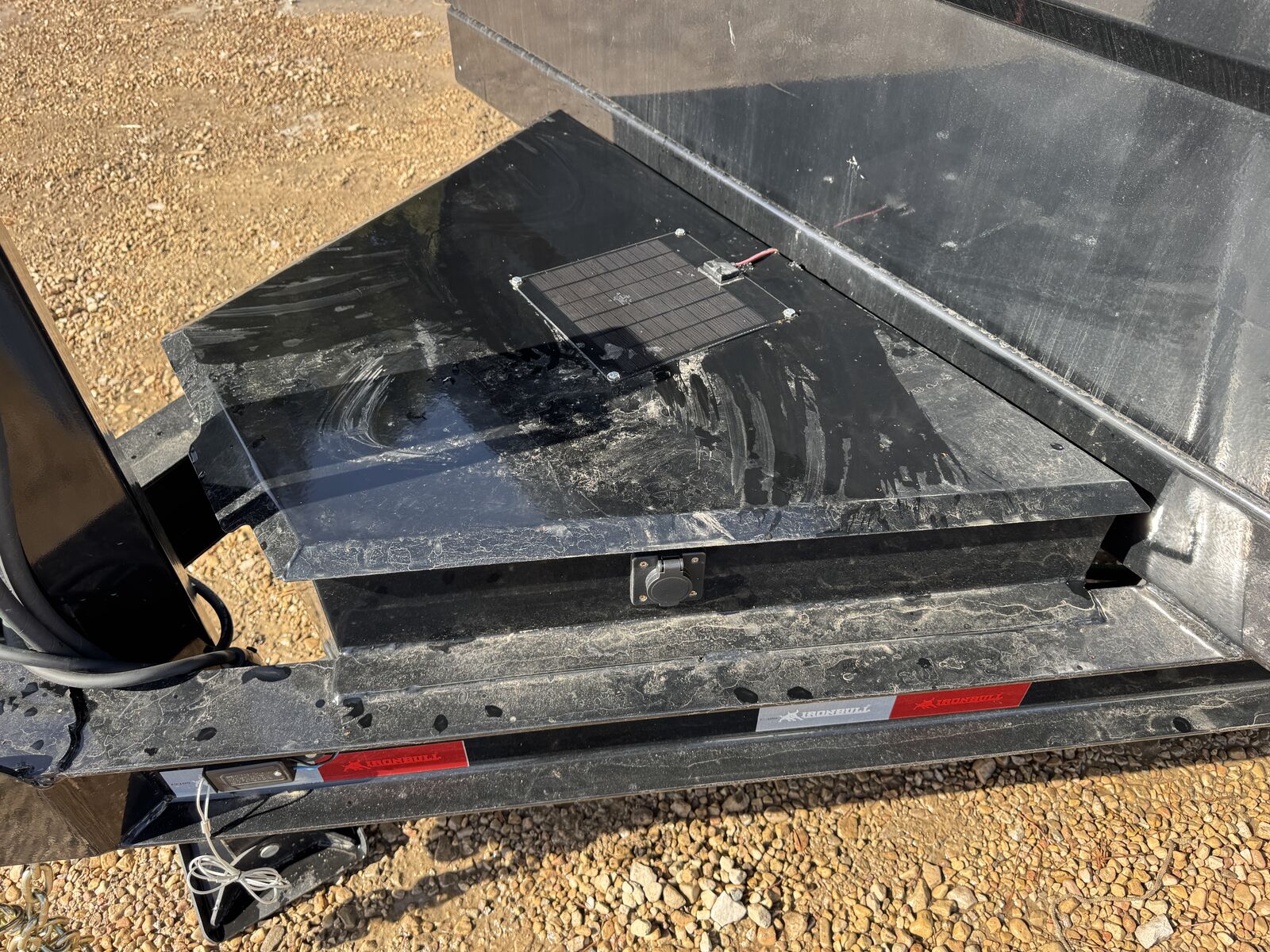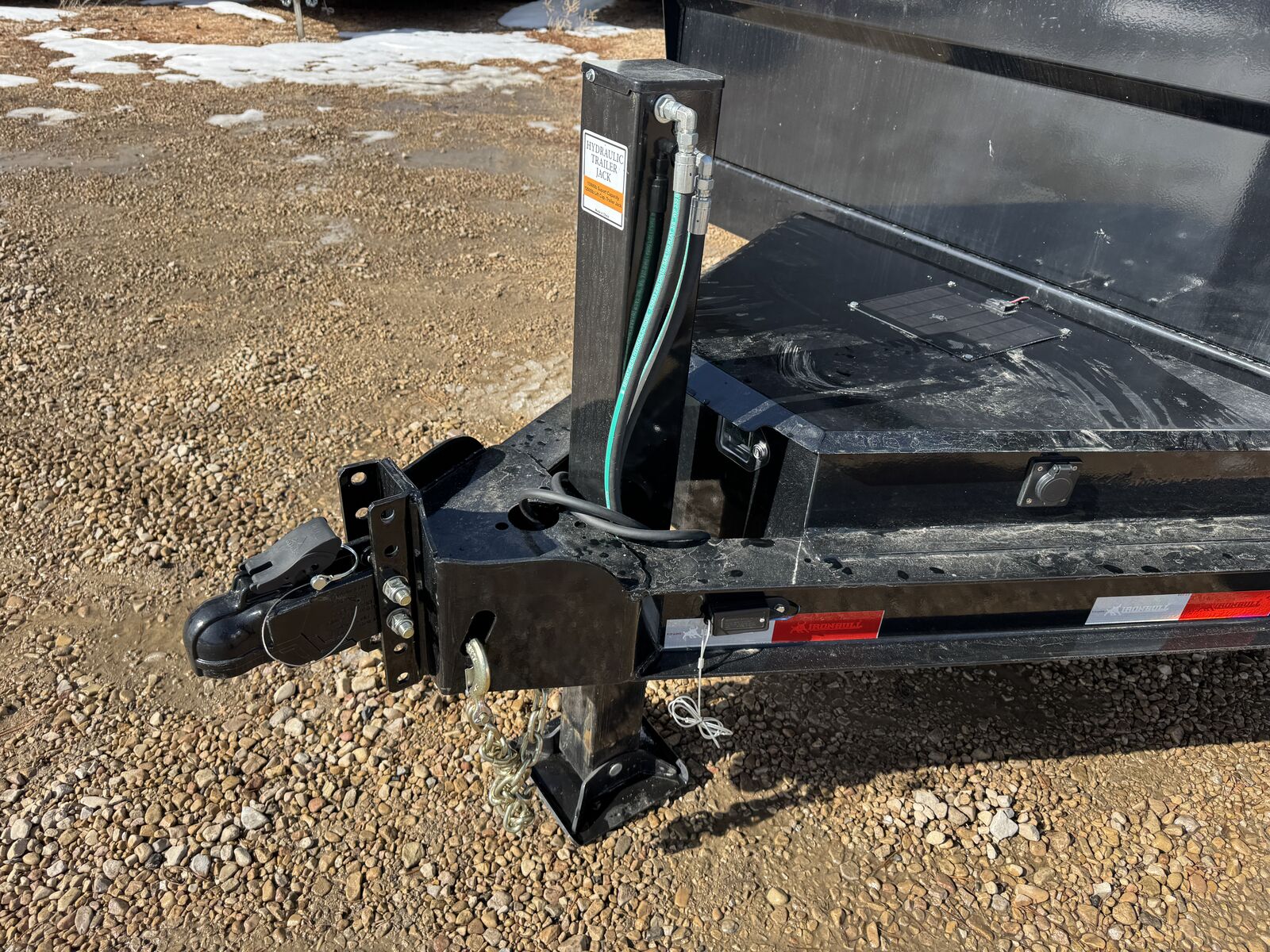 The new ramp system eliminates traditional ramp door flaps. Standard features include 7-gauge flooring, an oversized front toolbox, and a refreshed dump box side-step with a gate pin and ramp lanyards. The rear gate latching system is now inside the corner post for better protection. New features include a stylized diamond plate fender and a revised jack mounting system. Corrosion-resistant tarp hardware has been added. These tough Iron Bull dump trailers, built for 14,000-21,000 lbs GVWR, have a 7-gauge floor and 24" high, 10-gauge sides. Unique features include full-length bed runners, 10k jacks, and a three-way gate. Top components, brake axles, radial tires, and a durable finish ensure reliability. Hydraulic cylinders provide lifting power, and additional features include lifetime LEDs and a deep cycle battery.