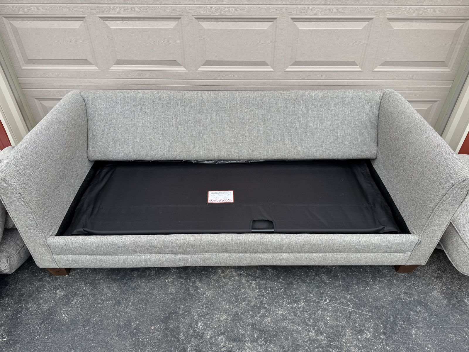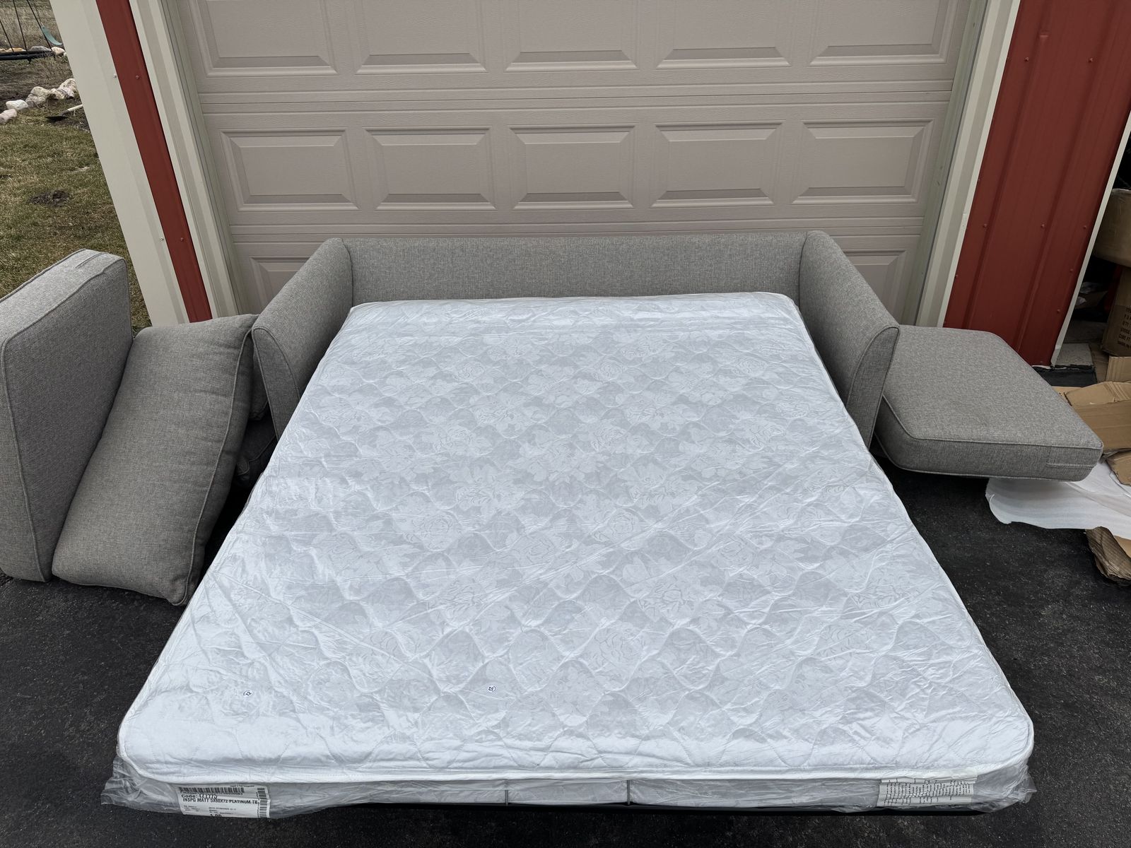VenmoCan meet up or deliver to your home! Upgrade your guest room or living space with this beautiful, brand-new Kodie Sleeper Sofa. We unboxed it just to verify the sleeper mechanism and take photos. It is in excellent condition and ready for a new home! Retail Price: $2,799 + Tax Our Price: $1,500 OBO (Save over $1,300!) Condition: Brand New. Mattress is still in original factory plastic. Features: High-quality gray upholstery, easy-pull-out queen-size sleeper mechanism, and modern wood legs. Dimensions: 77'' W x 32'' H x 36'' D. Note: Minor cosmetic scuff on one arm from shipping (see last photo), otherwise perfect. Skip the 4-week shipping delay and the high retail price. This is a high-end piece of furniture that will last for years.