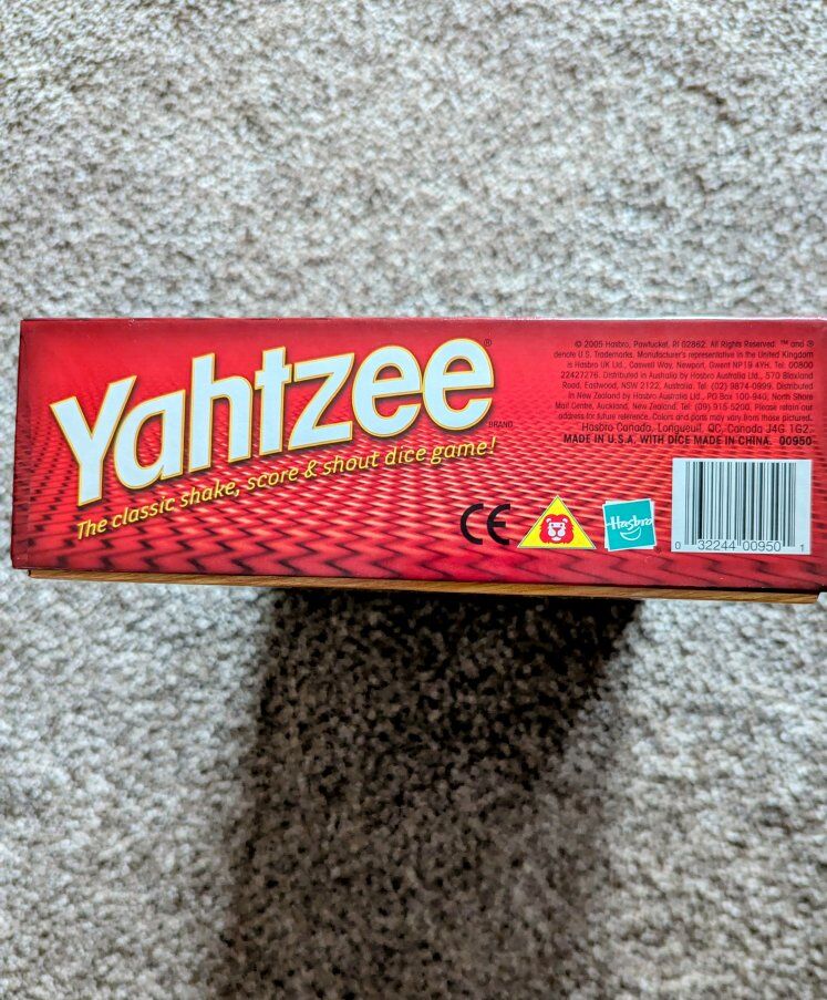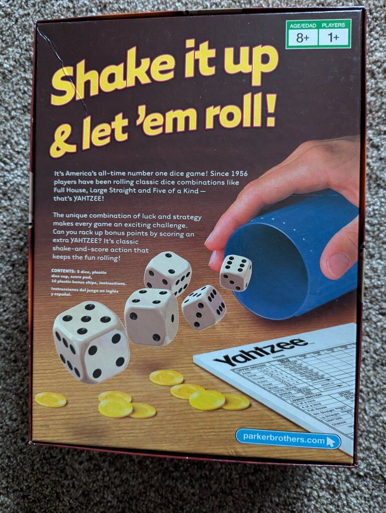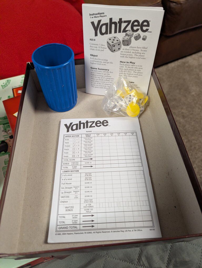 dice and bonus chips still shrink-wrapped. never been used. Have another Yahtzee. I inherited this one