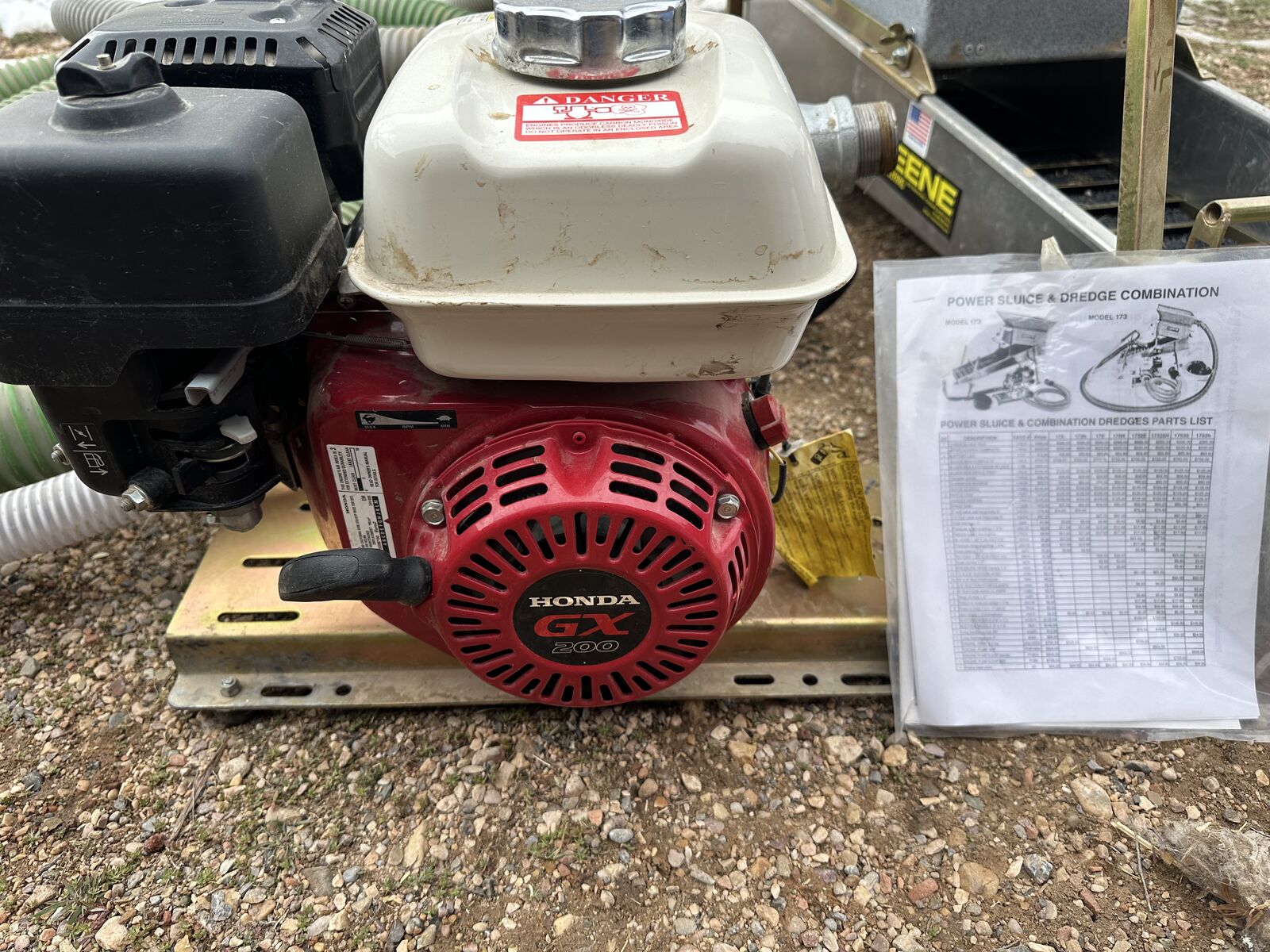 ZelleThis is Keene’s 175 Combination Gold Dredge – Power Sluice, powered by a 6 HP Honda Engine with the addition of a 3 inch gold dredge suction nozzle, 15 feet of 3 inch suction hose and 17 feet of additional pressure hose to extend the suction system.