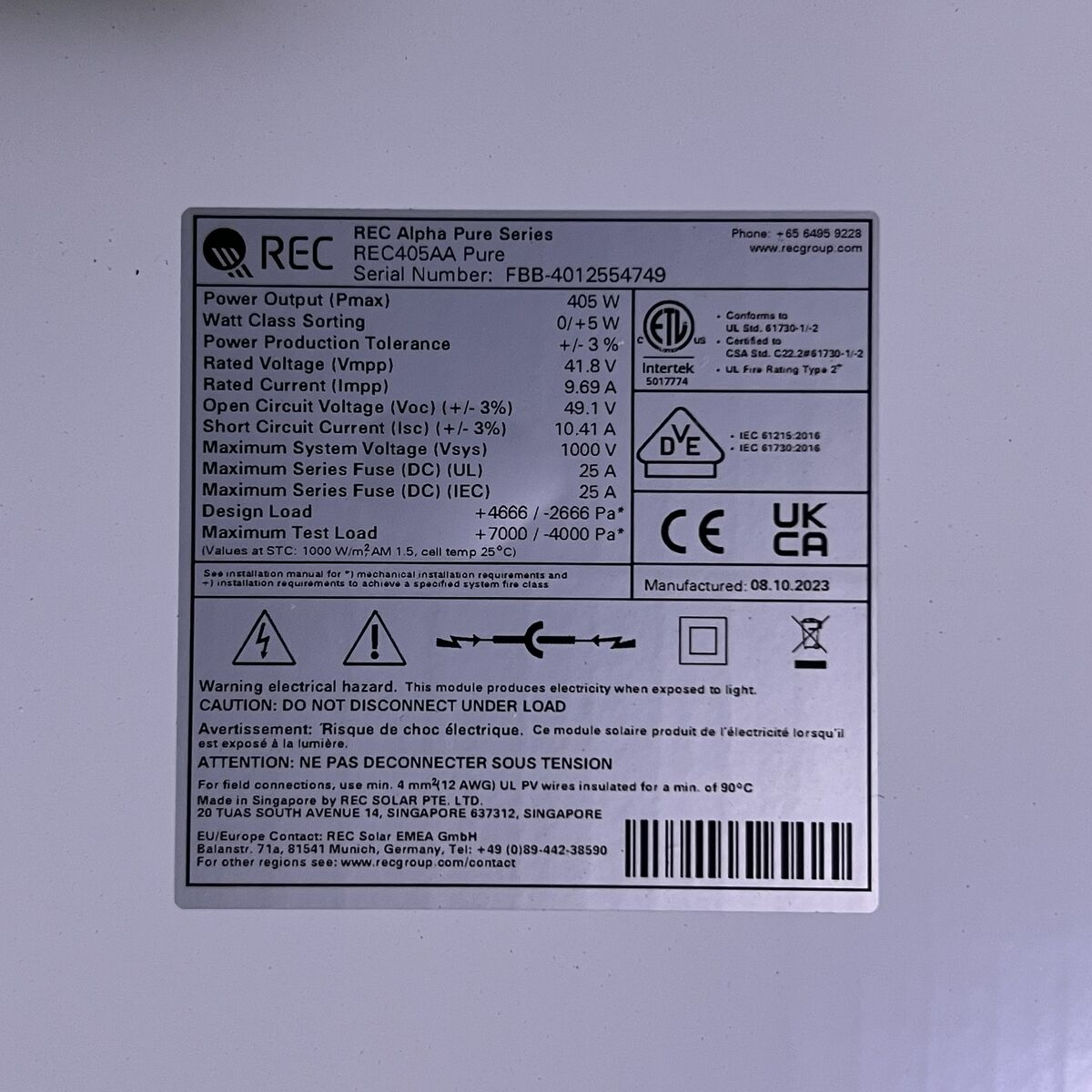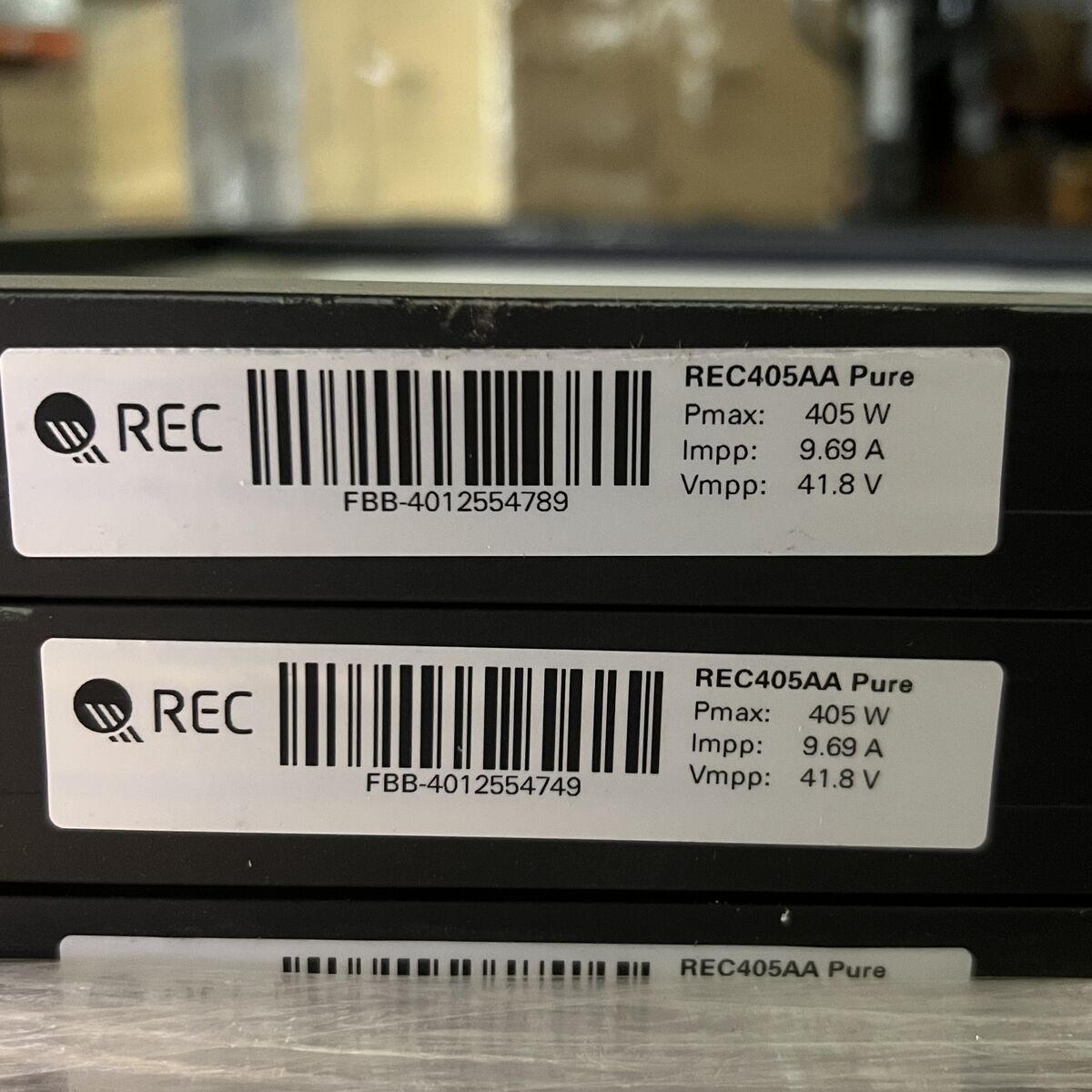 REC Solar Panel 405w 132 Half-cell 1000v Condition: New Size: 40"W x 72"L Color: Black MPN/Model: REC405AA
