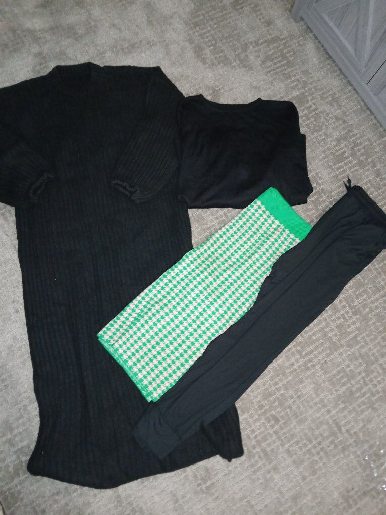 Venmo2 pants size 22 and 24. black long/longsleve sweater dress. black short sleve shirt. black sports joggers. colorful skirt. All new